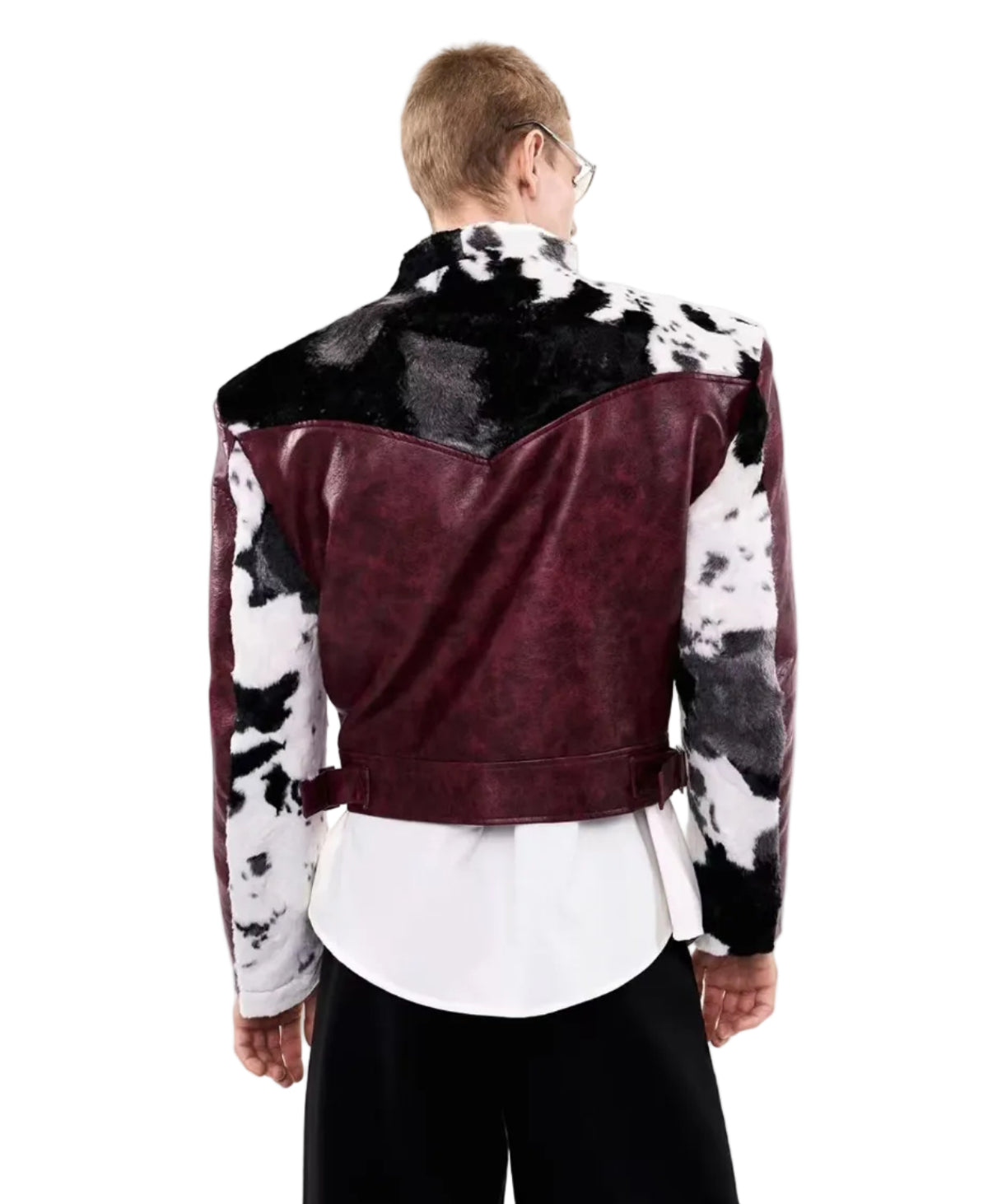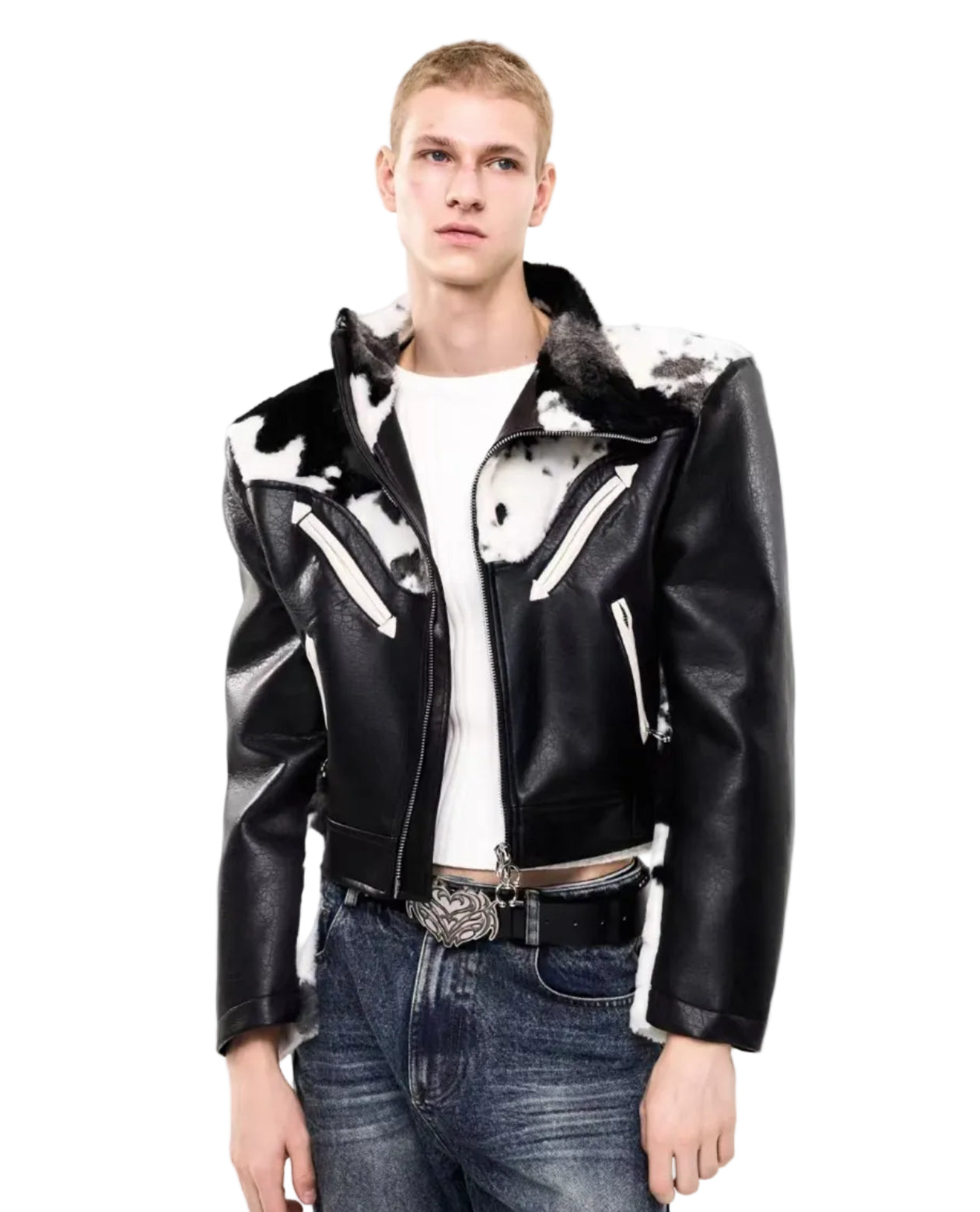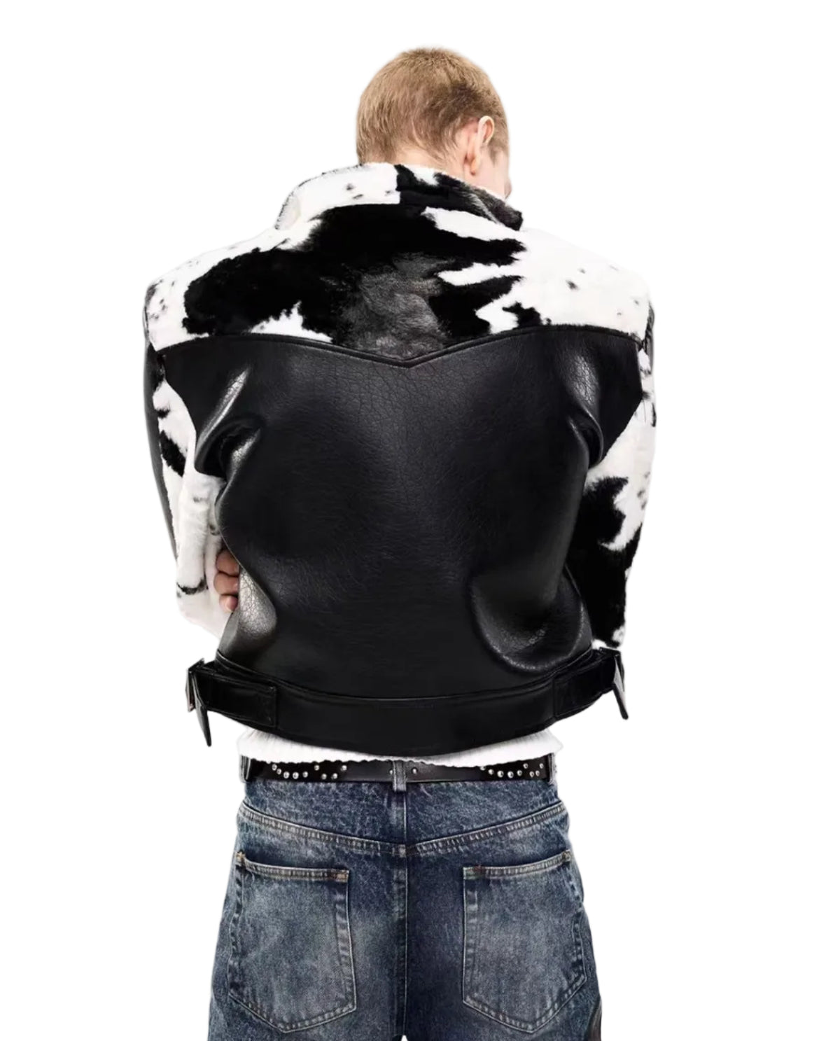 جاكيت جلد دراجة نارية مزيف بفرو بنقشة بقرة