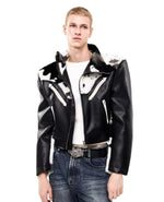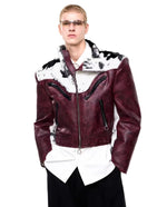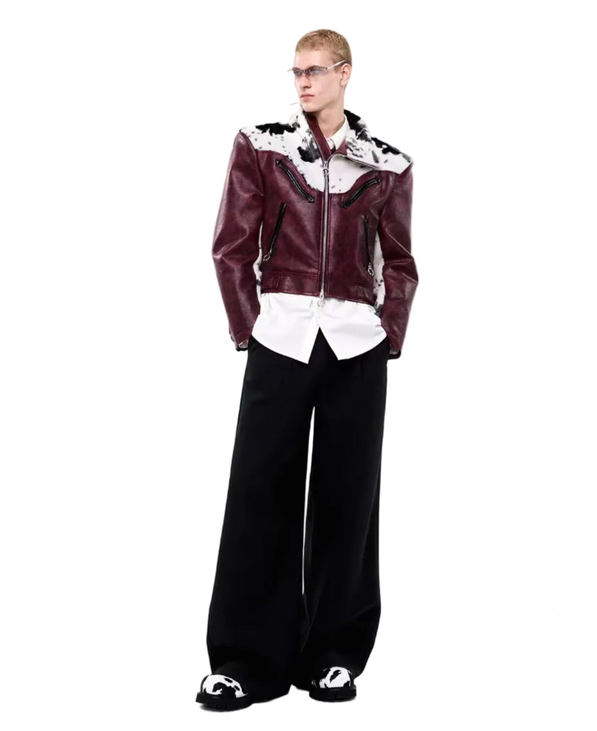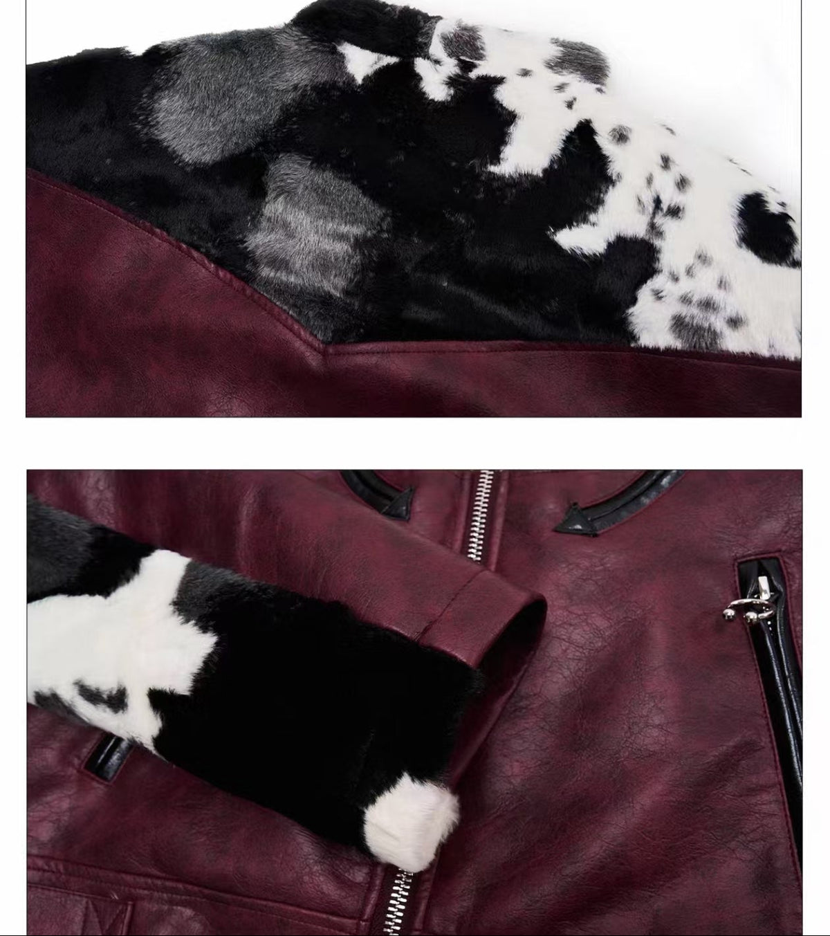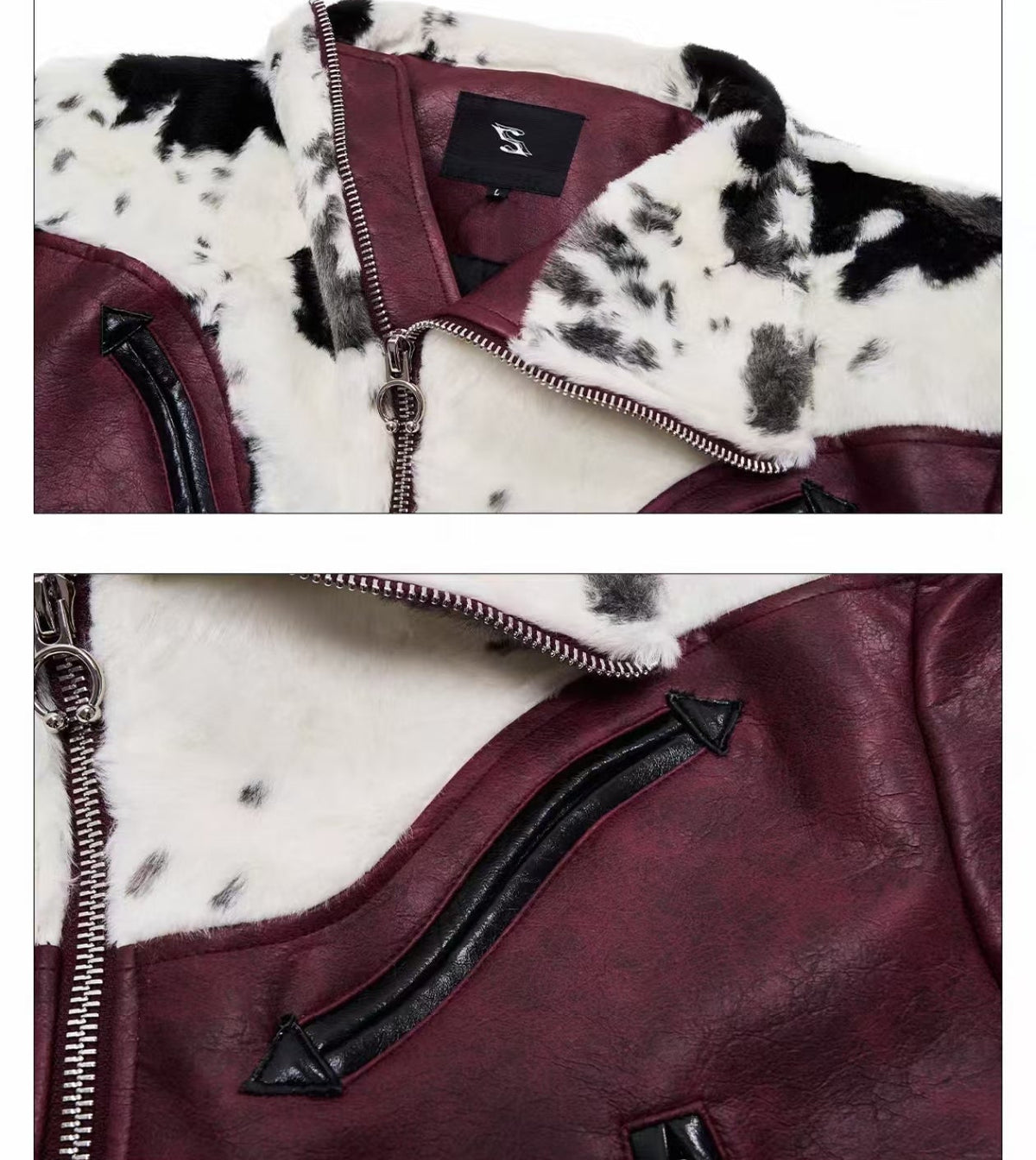 جاكيت جلد دراجة نارية مزيف بفرو بنقشة بقرة