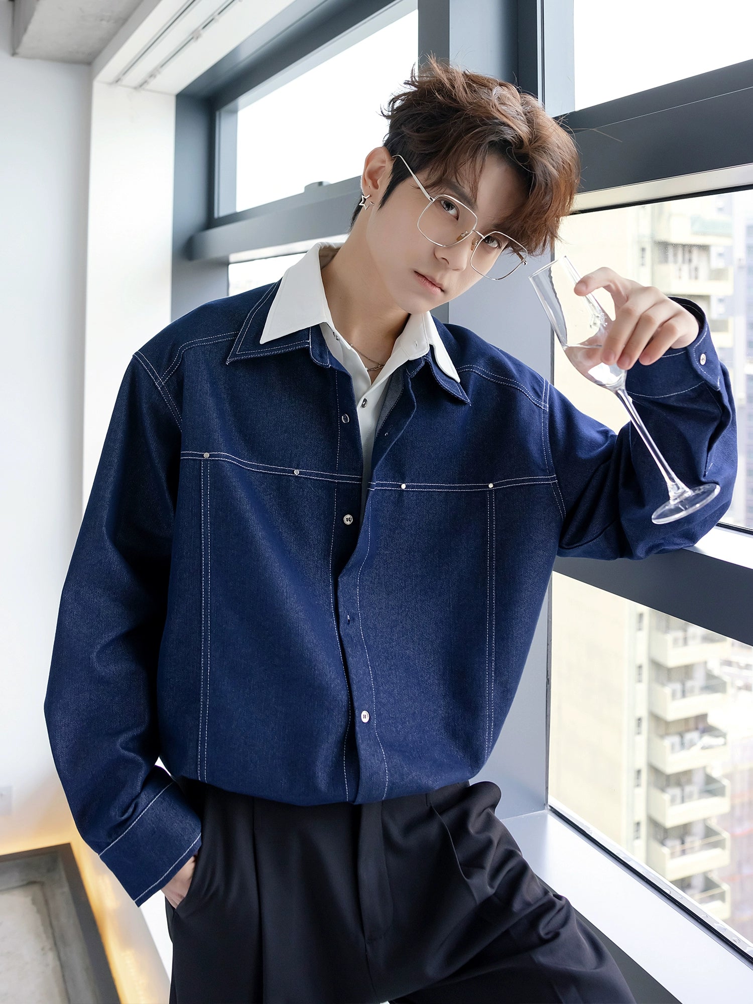- المواد المساعدة: أزرار سبائك مخصصة بتفاصيل دقيقة, مدمجة مع مسامير فضية لامعة, تخلق نسيجًا خفيف الوزن.