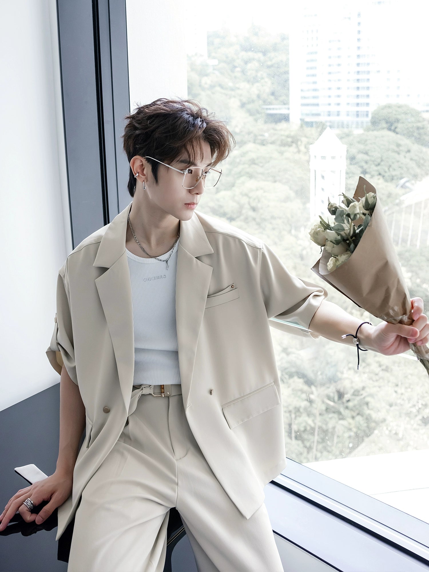 - تفاصيل الأكمام: تصميم شريط قماشي, يمكن لفه أو ترك الأكمام ممدودة, لتحقيق توازن بين الأناقة والعفوية
