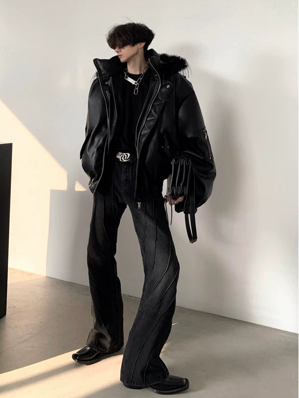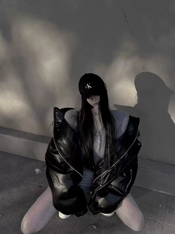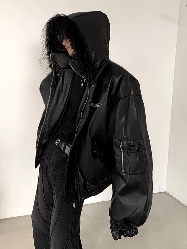 Leather Hooded Puffer Winter Jacket