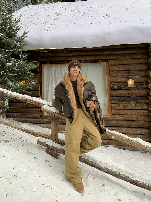 معطف منفوخ بياقة فرو, سميك ومقاوم للرياح