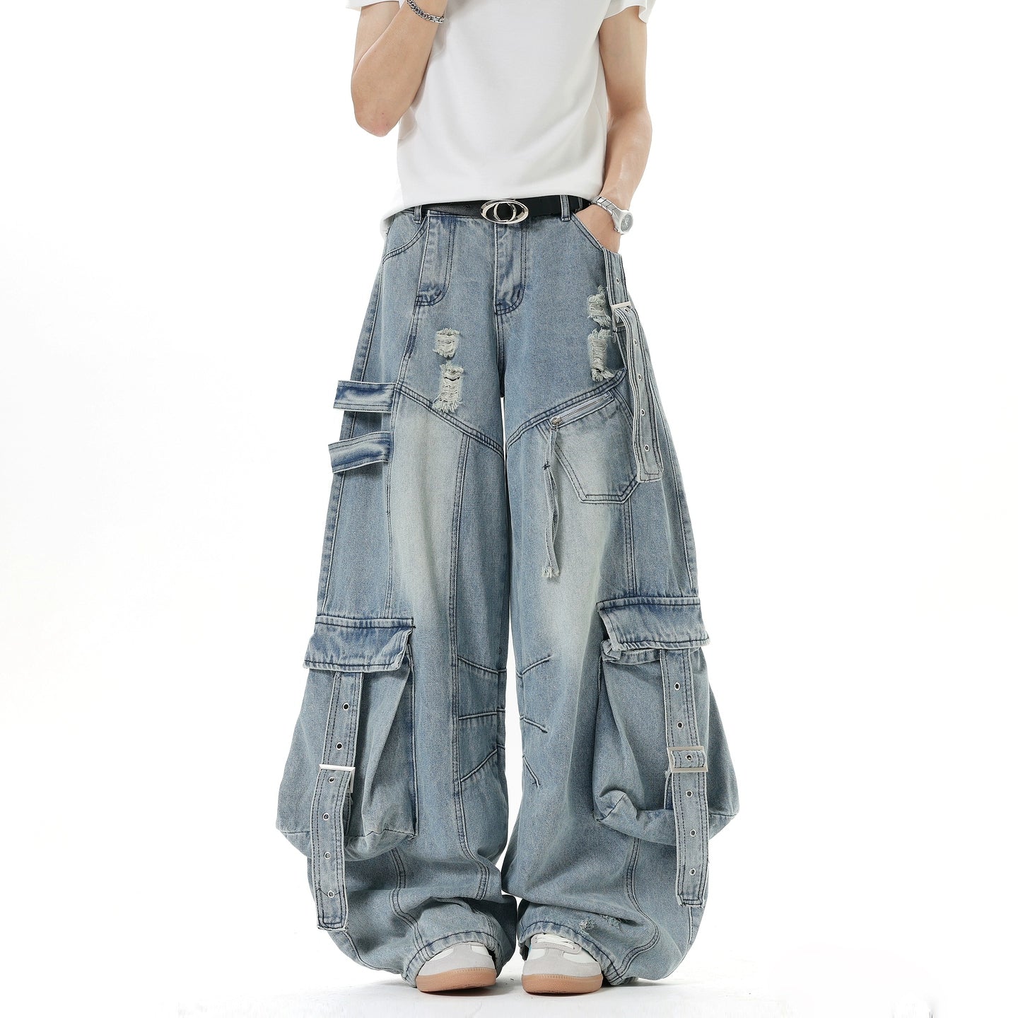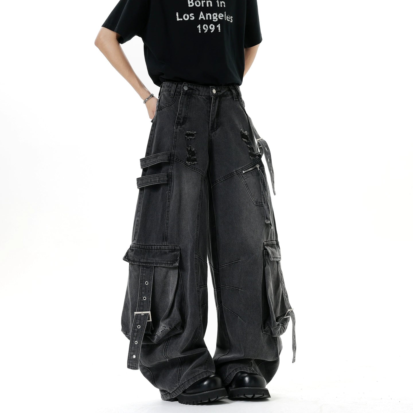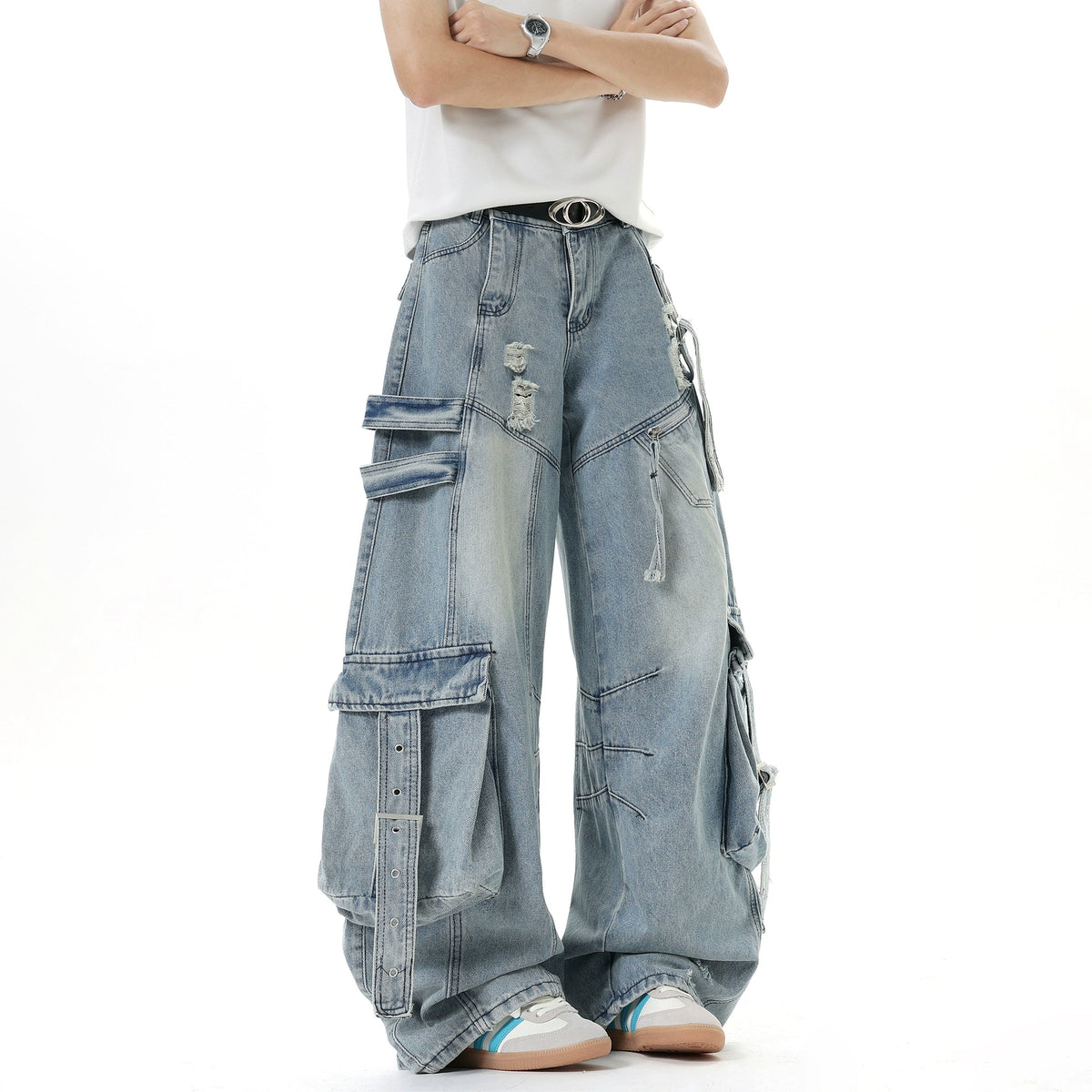بنطلون جينز كارجو واسع الساق مع جيوب متعددة