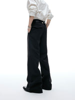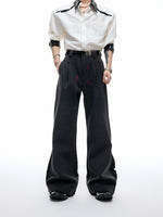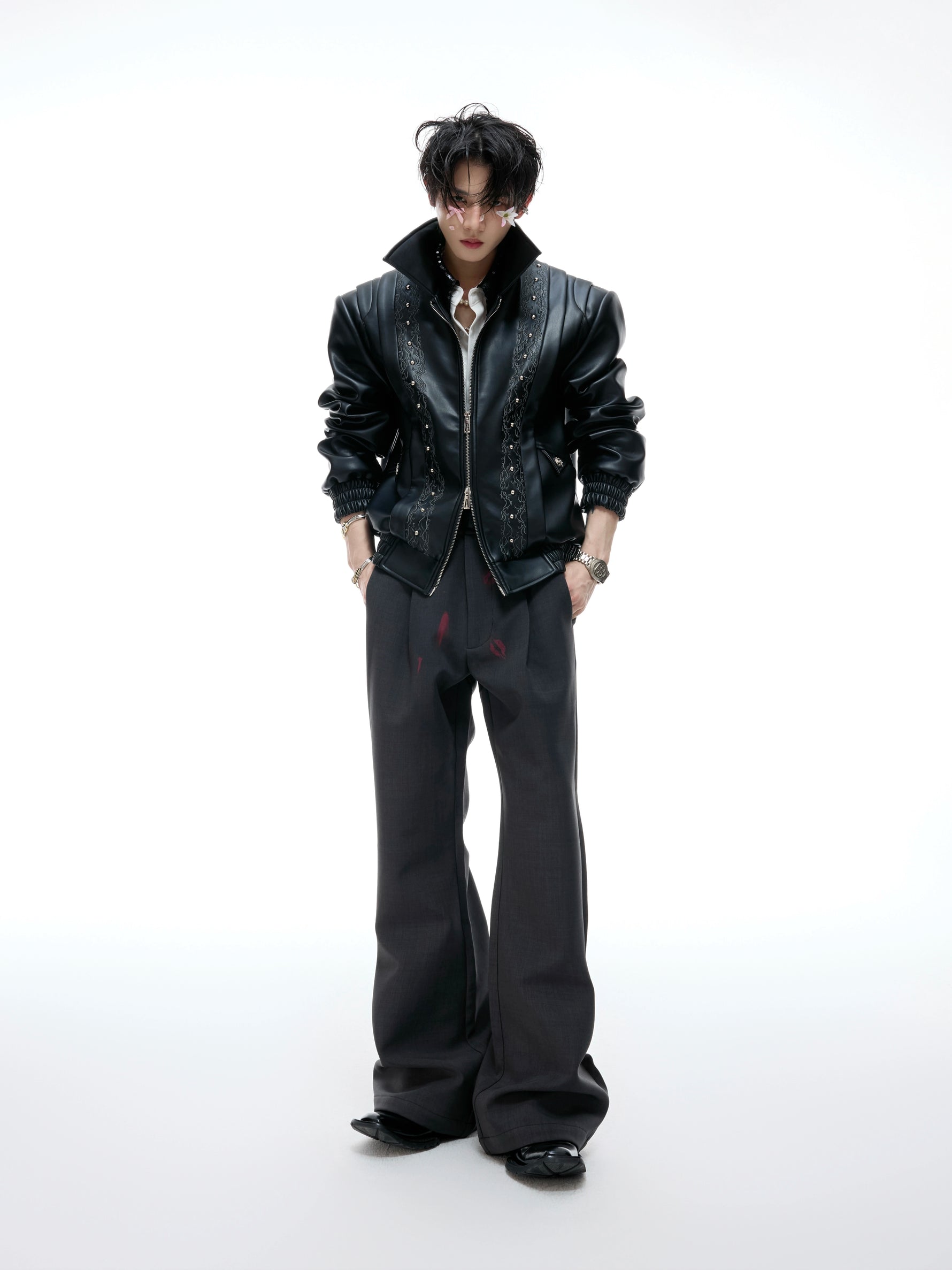 - أزرار مخصصة من العلامة التجارية عند الخصر تخلق تباينًا مع القماش الأسود, مما يعزز الأجواء الرجعية والعصرية.