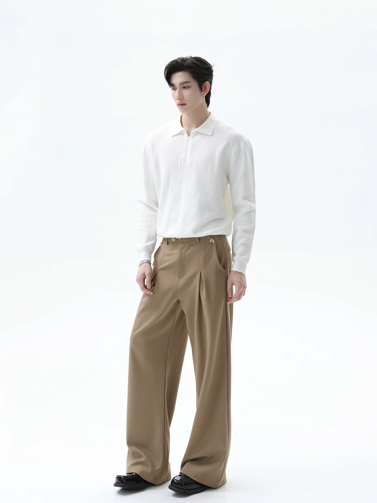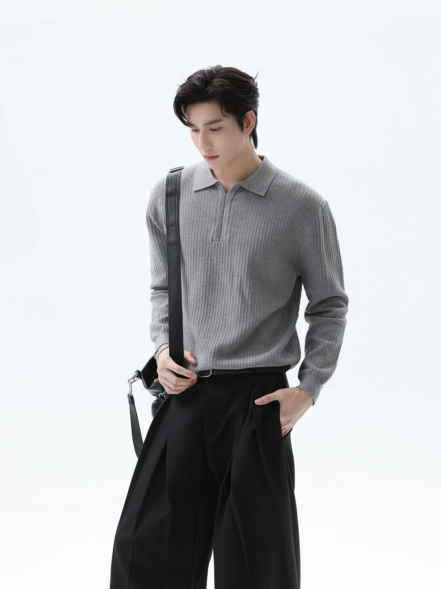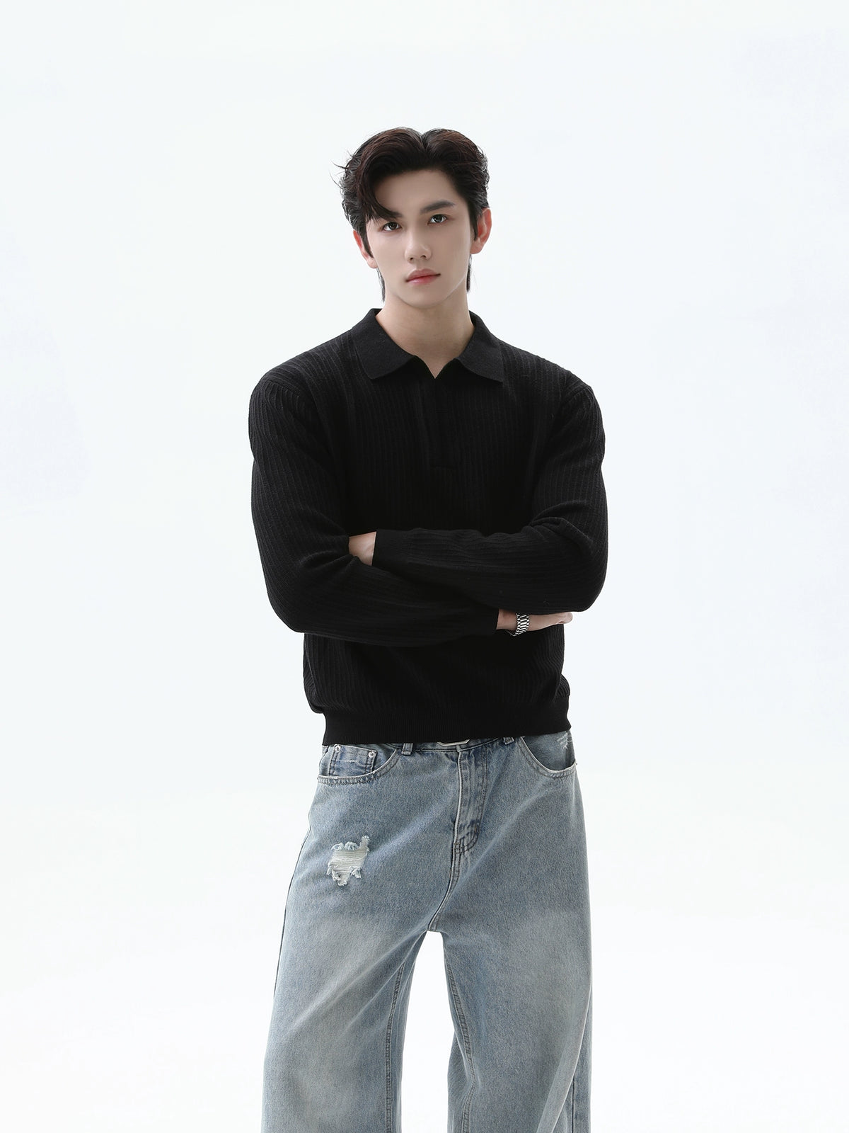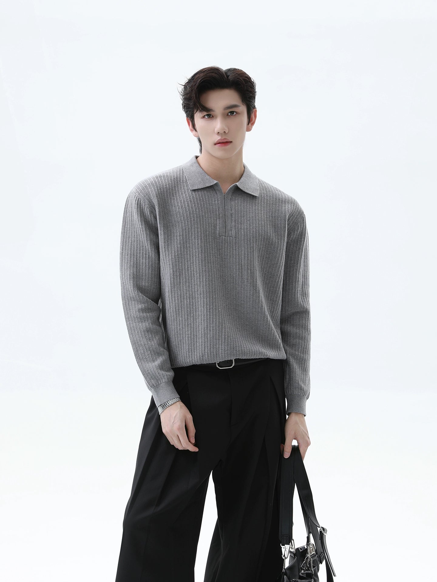 بلوزة بولو ذات أكمام طويلة محبوكة مع خطوط