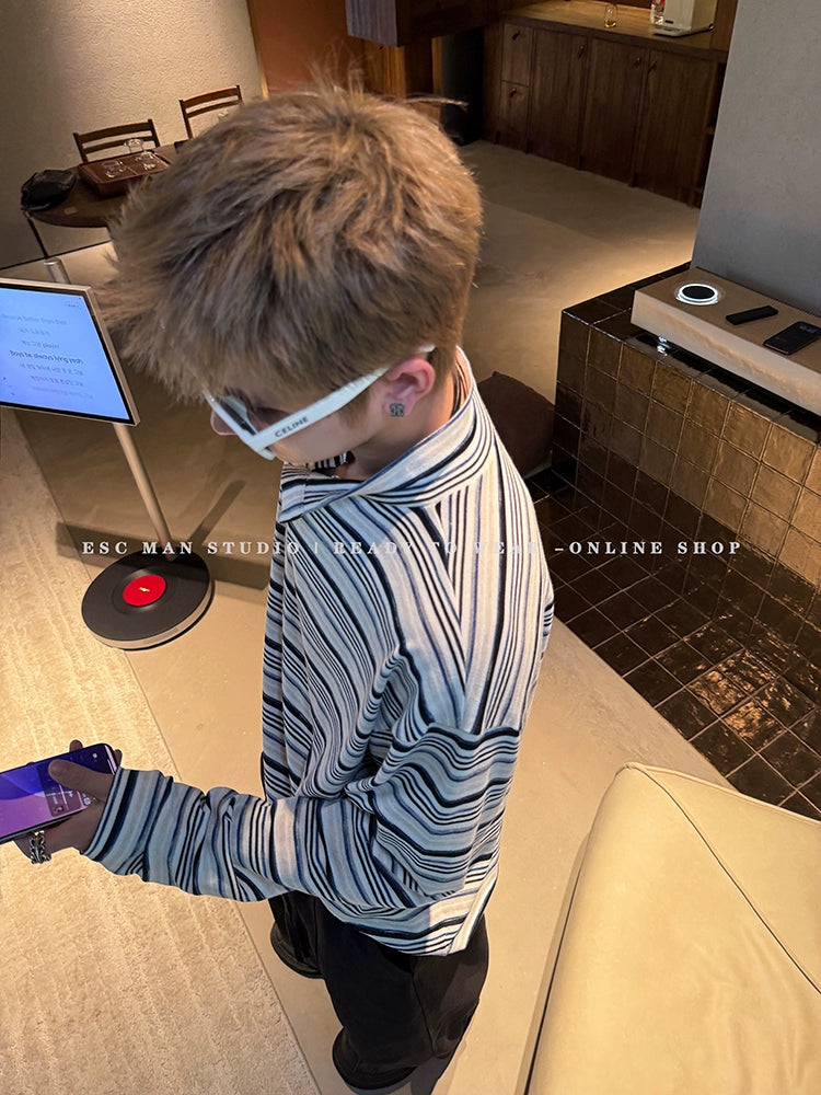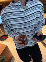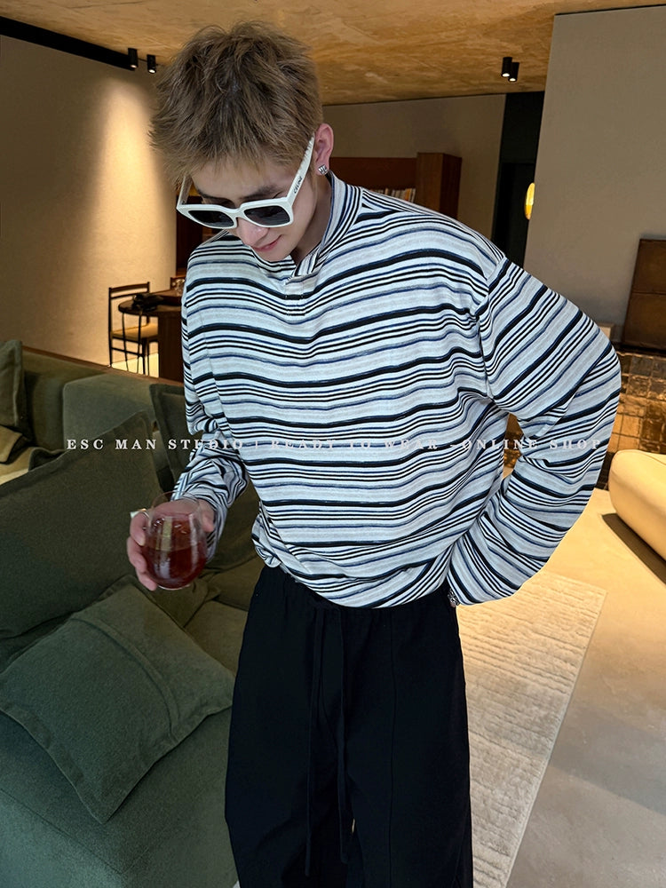 بلوزة طويلة الأكمام فضفاضة بخطوط مع ياقة واقفة