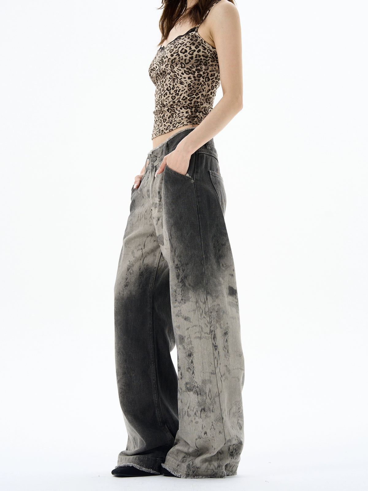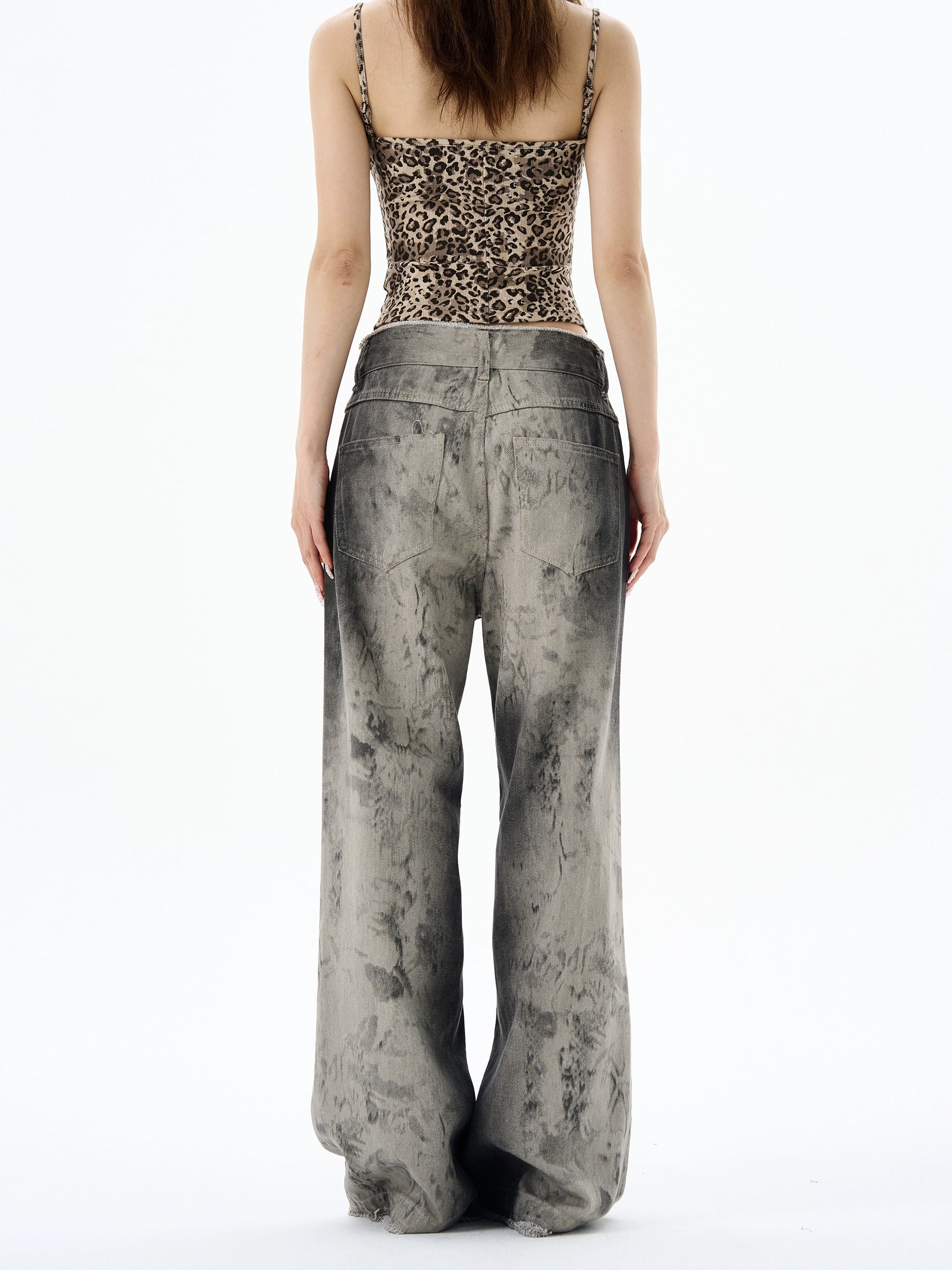 بنطلون واسع الساق بحواف خام مع جرافيتي متأزم