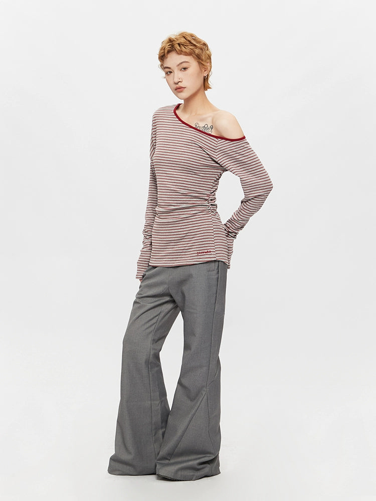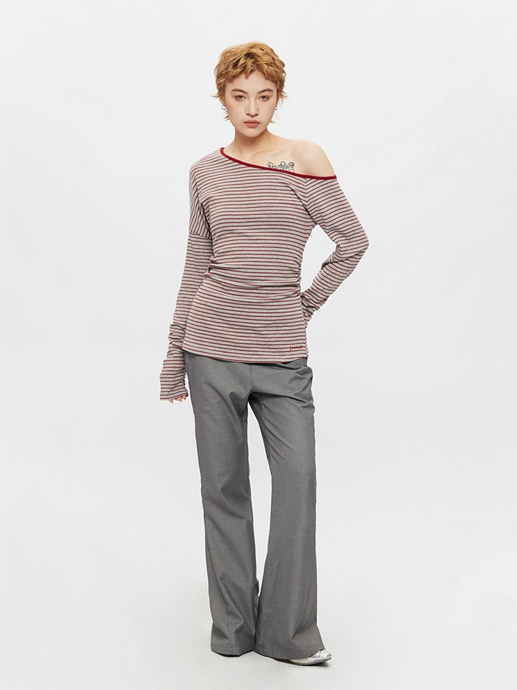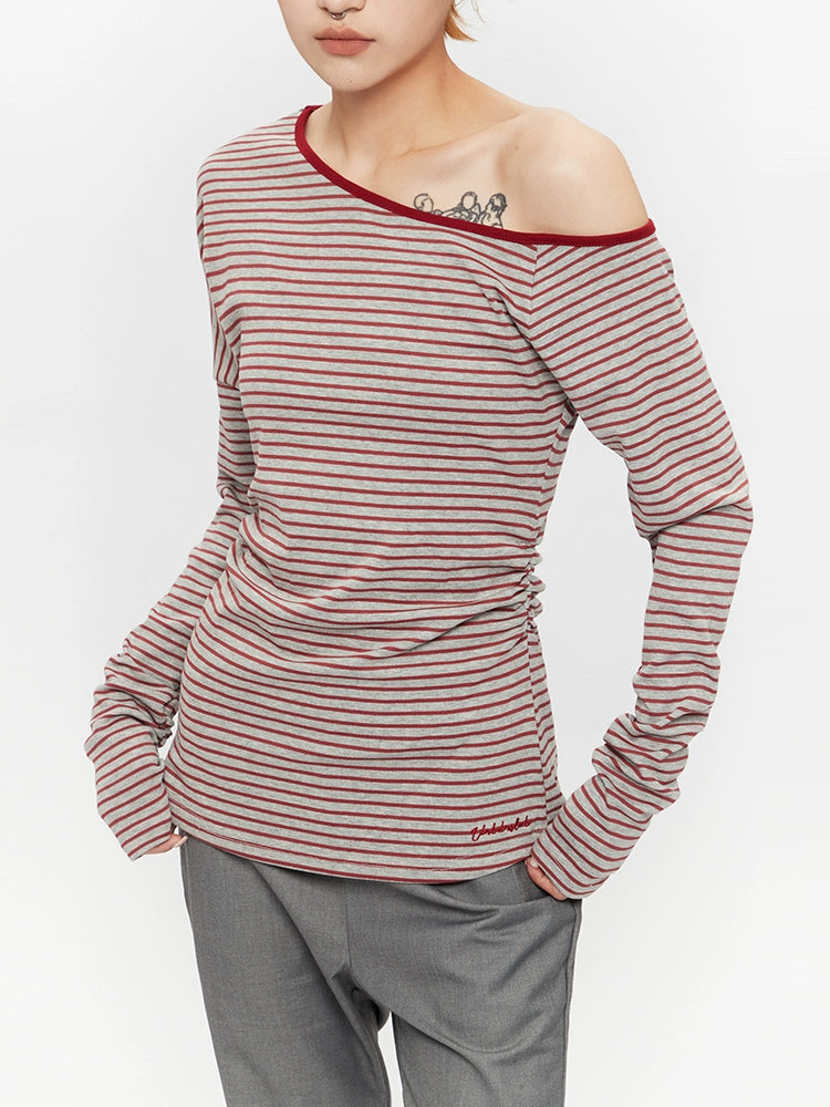 بلوزة ذات أكتاف مكشوفة بأكمام طويلة وقبة مدورة مخططة