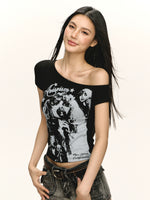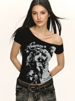 تي شيرت ضيق بأكتاف مكشوفة بتصميم رسومي رجعي
