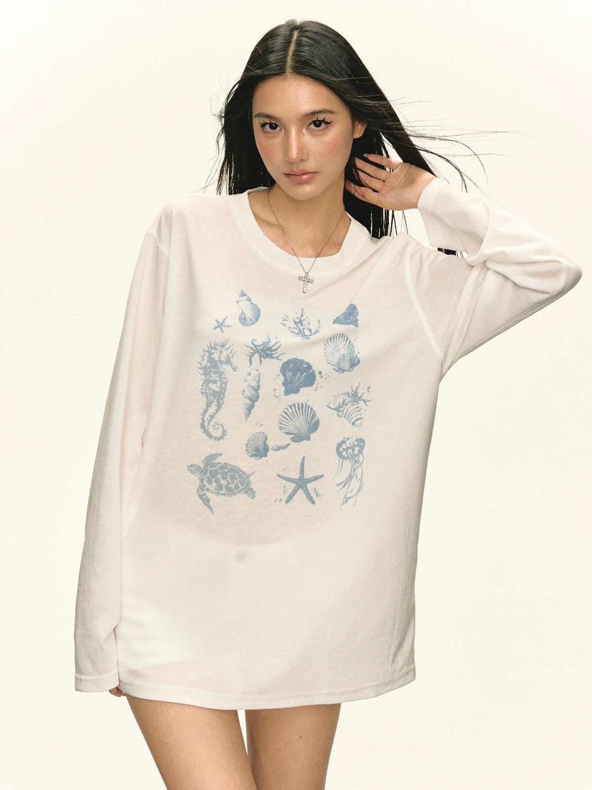 بلوزة تورتل نيك بأكمام طويلة برسومات الحياة البحرية