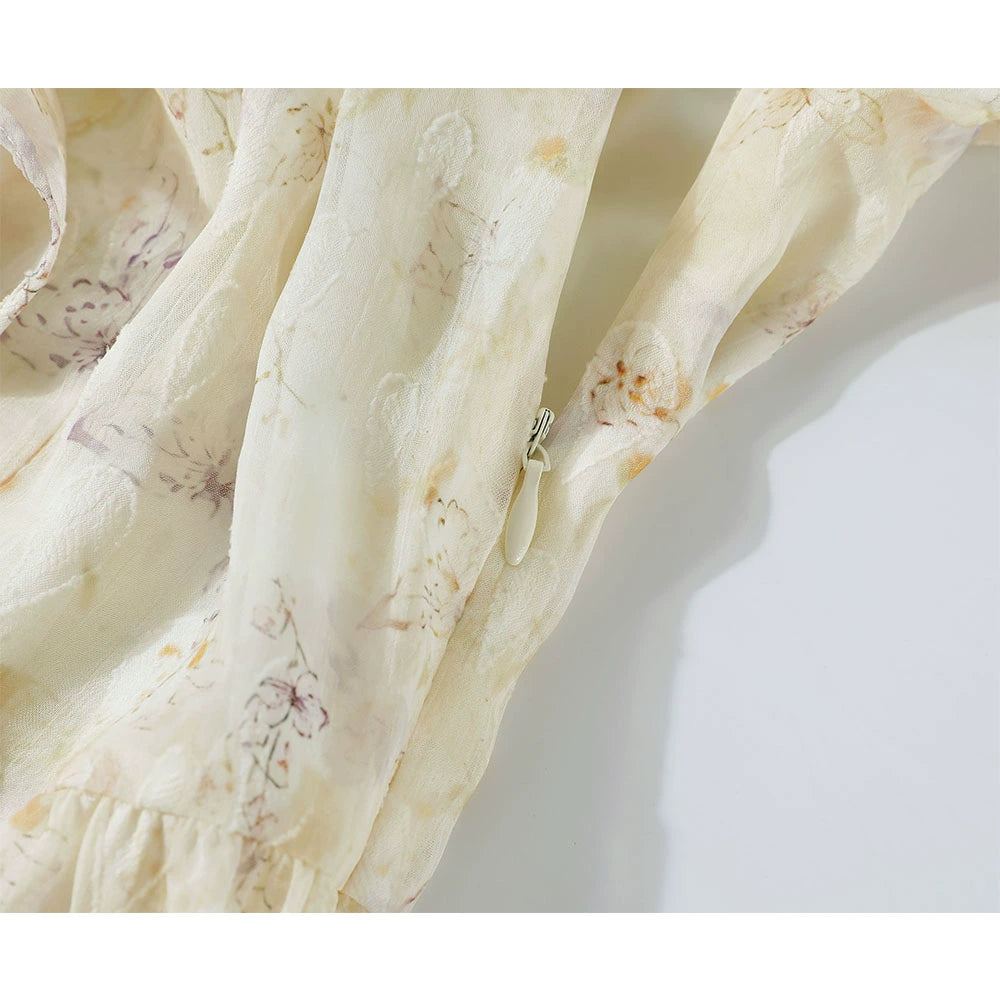 - قماش ناعم وخفيف الوزن بنمط زهور رقيق وشفافية طفيفة, هوائي وملمس ملموس.