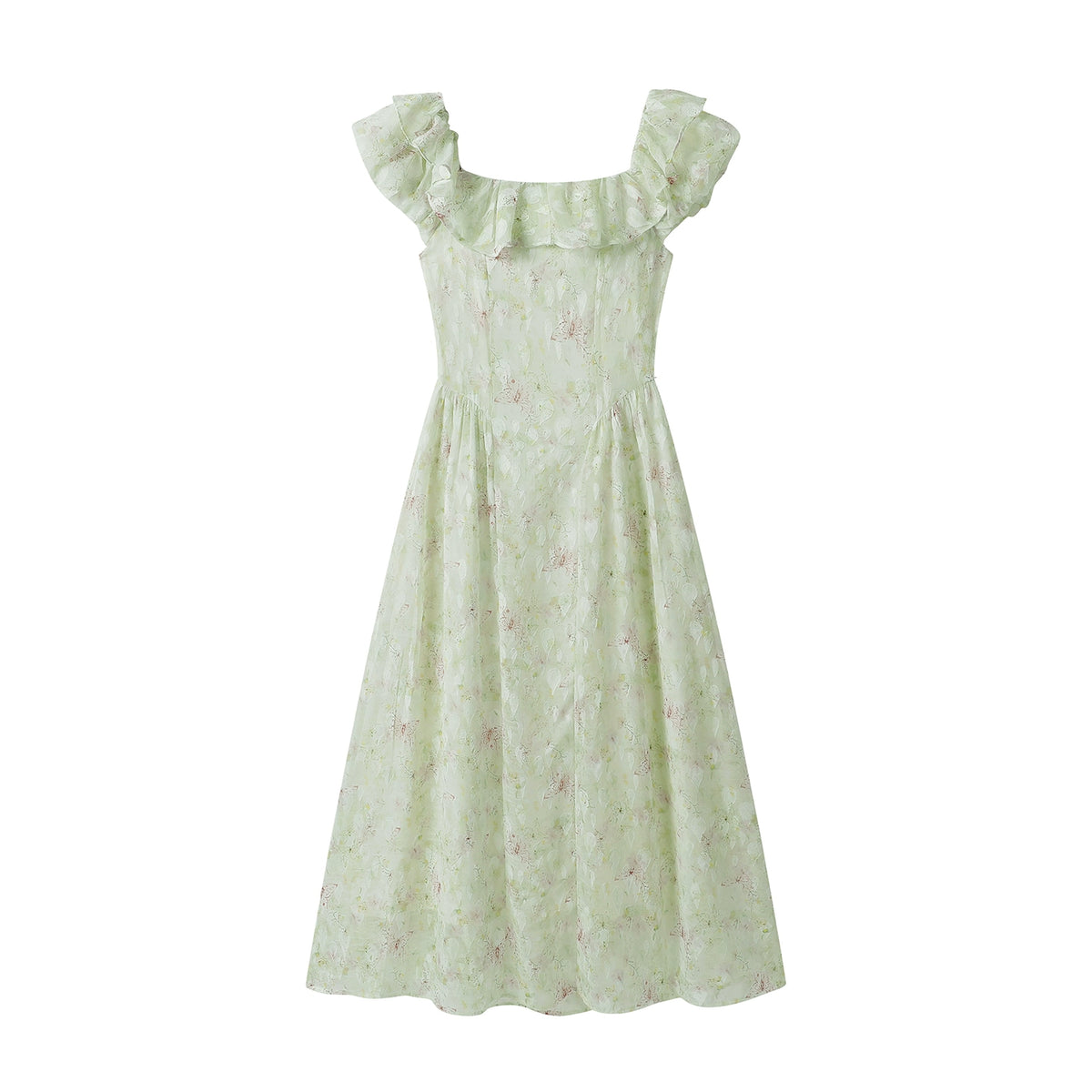 فستان صيفي متوسط الطول مع كشكش مزهري وياقة مربعة