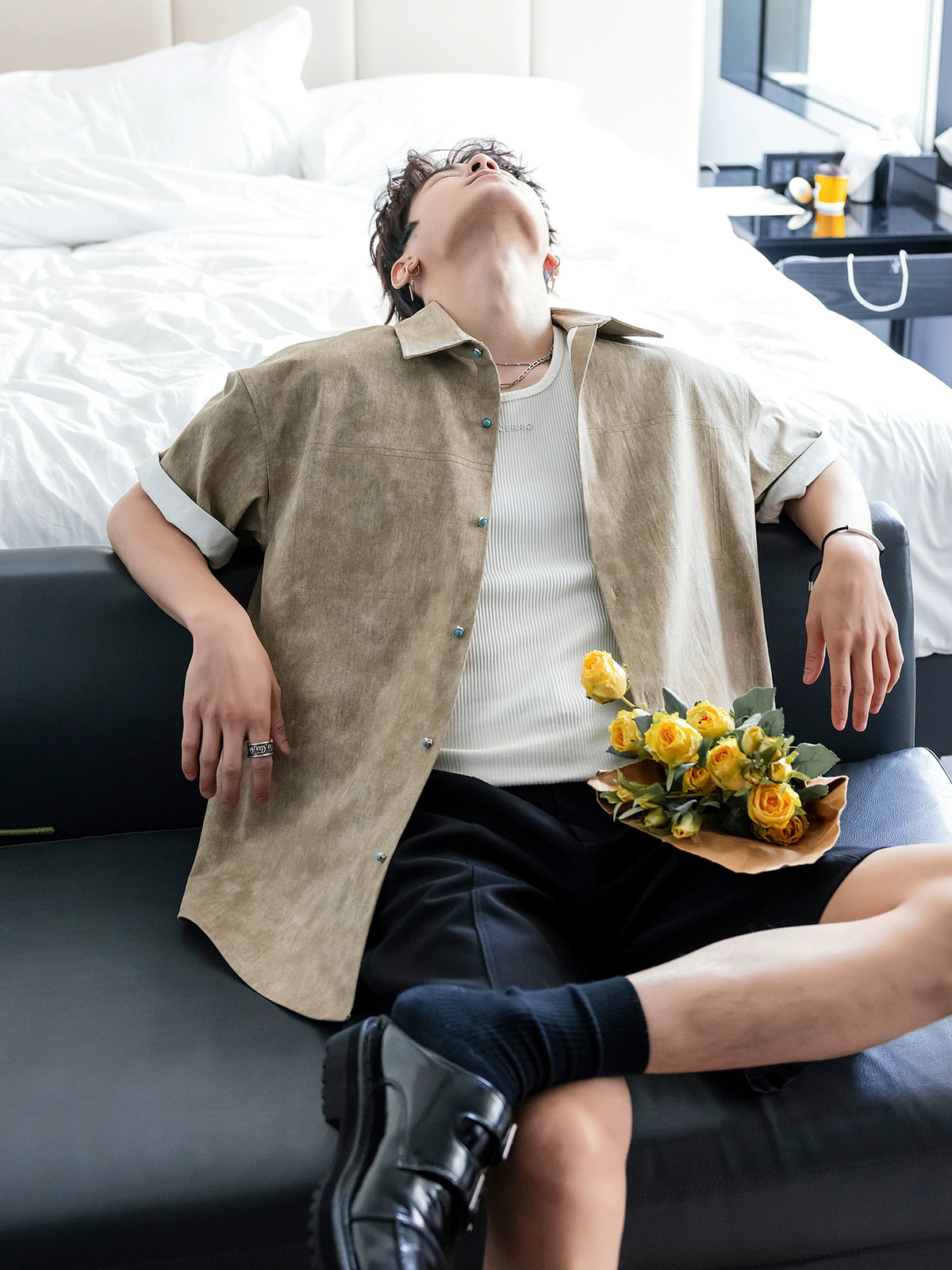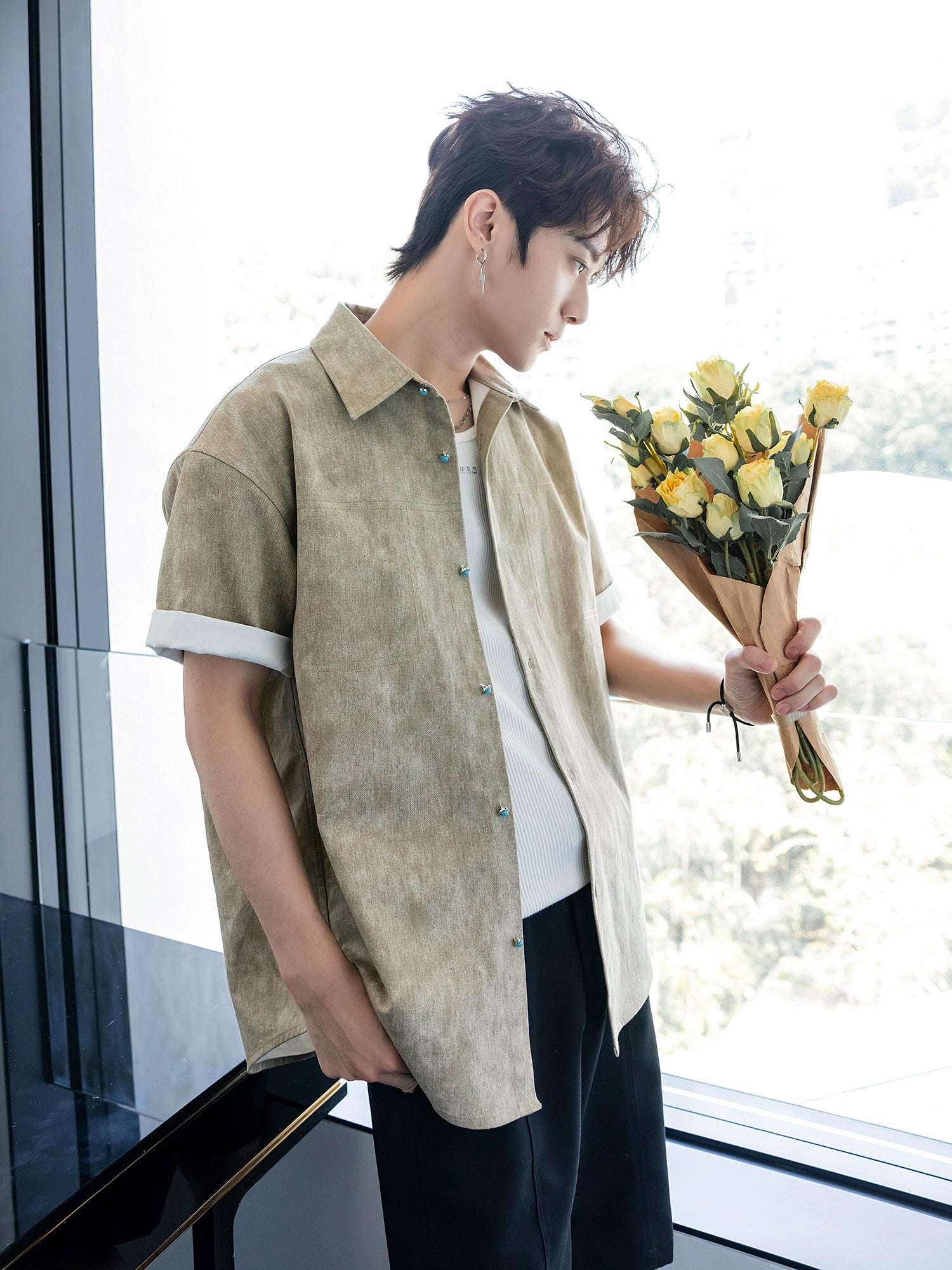 - تصميم كلاسيكي مع ياقة قابلة للطي, مقترنًا بأكمام يمكن طيها, مما يوفر شكلًا مريحًا وأنيقًا. التفاصيل على الصف الأمامي تستخدم أزرار خضراء تركواز زاهية وجذابة, مما يخلق جوًا عتيقًا.