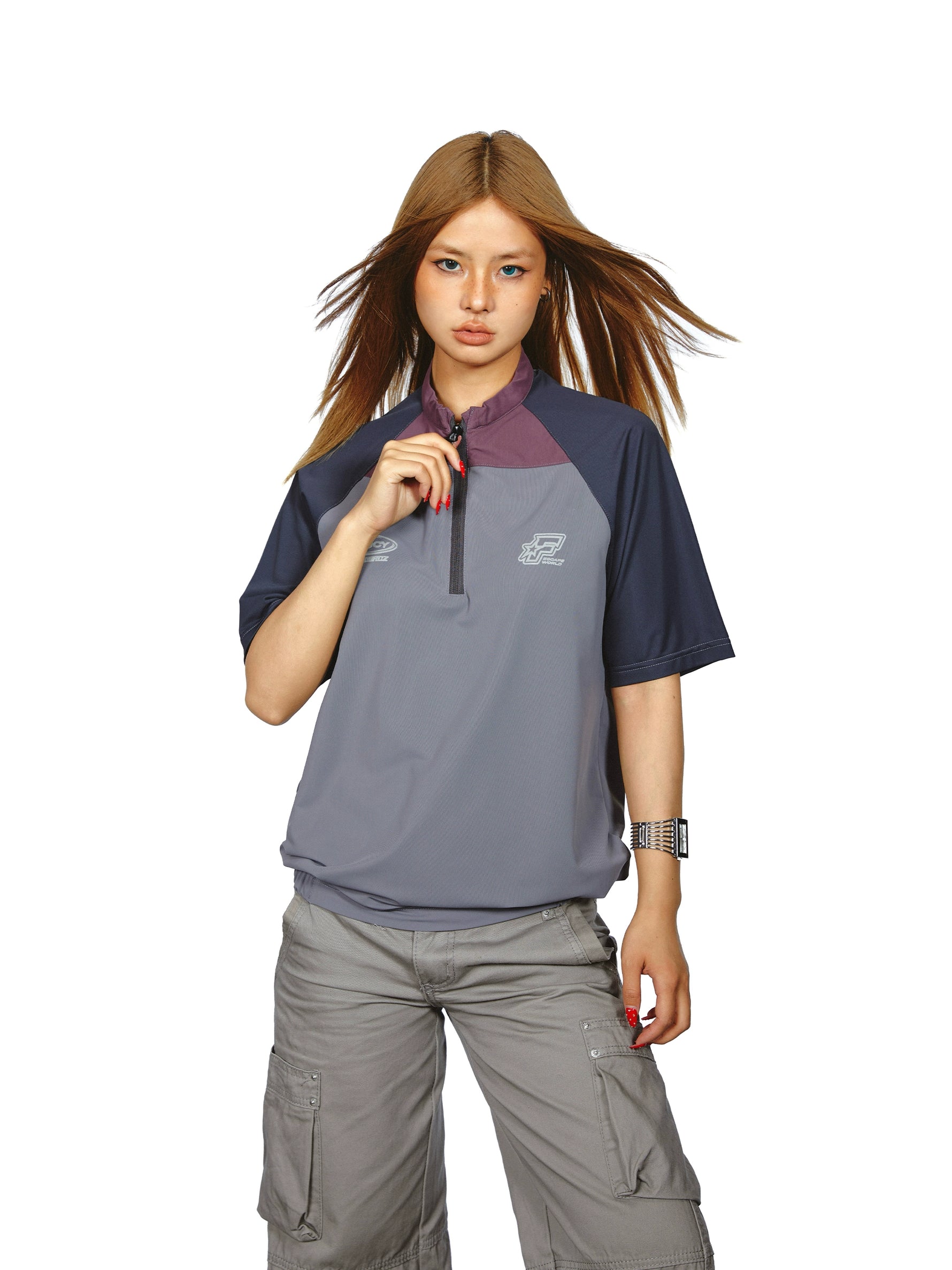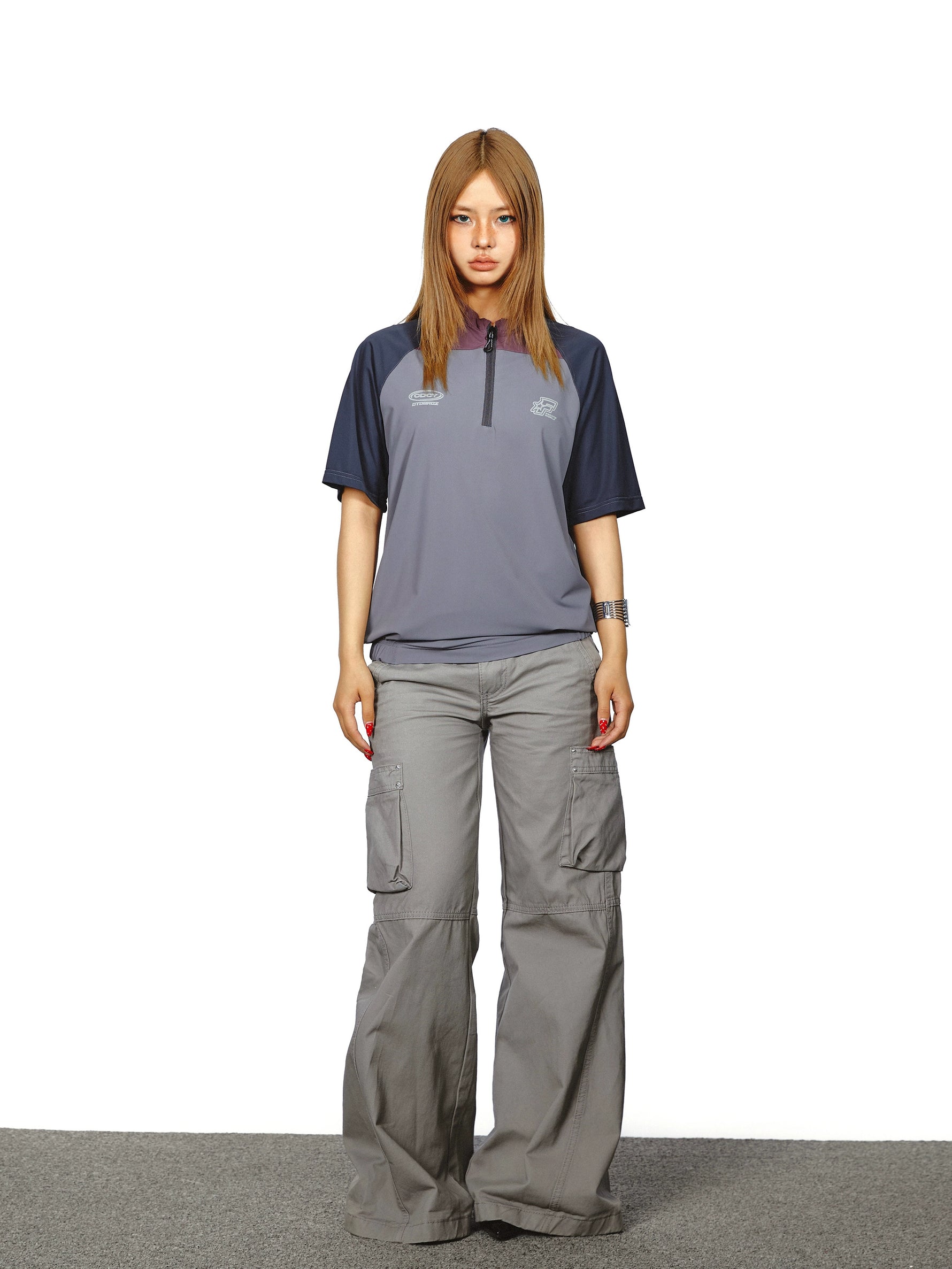 تي شيرت رياضي بنصف سحاب مع خياطة متباينة