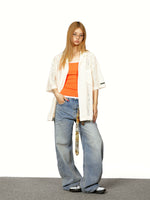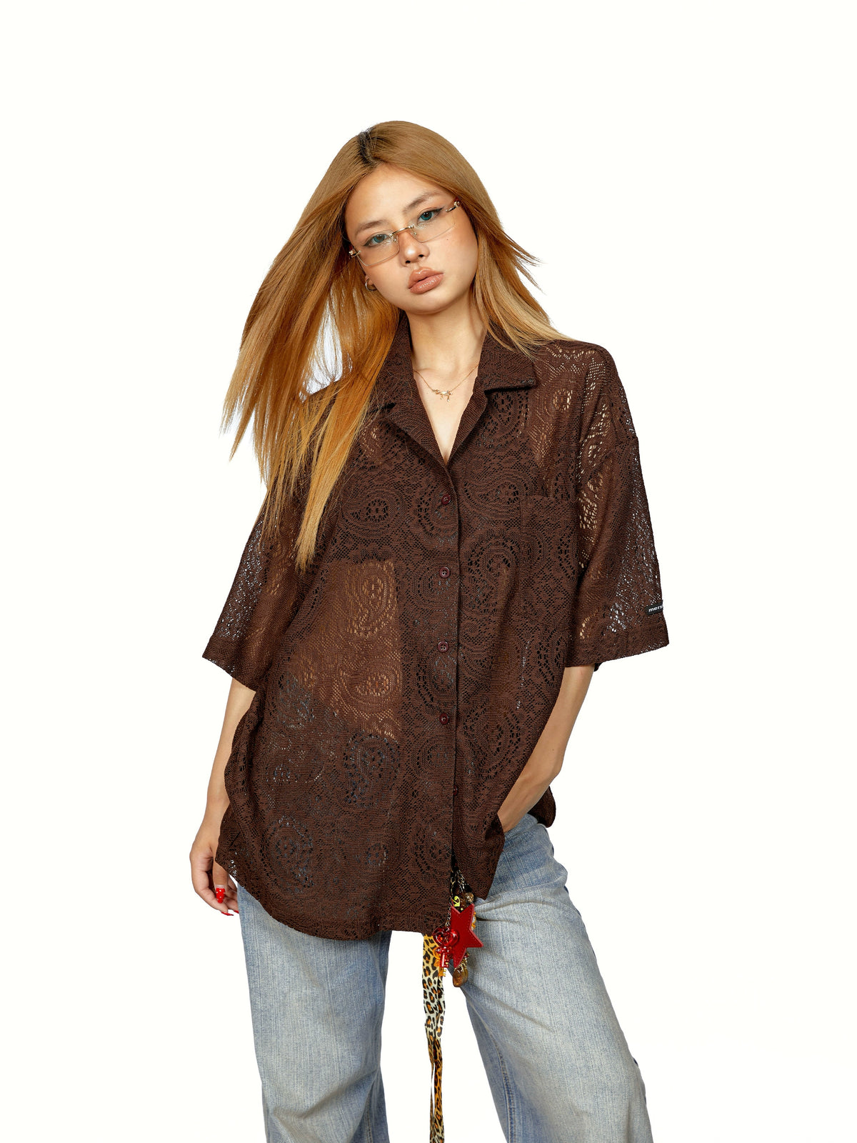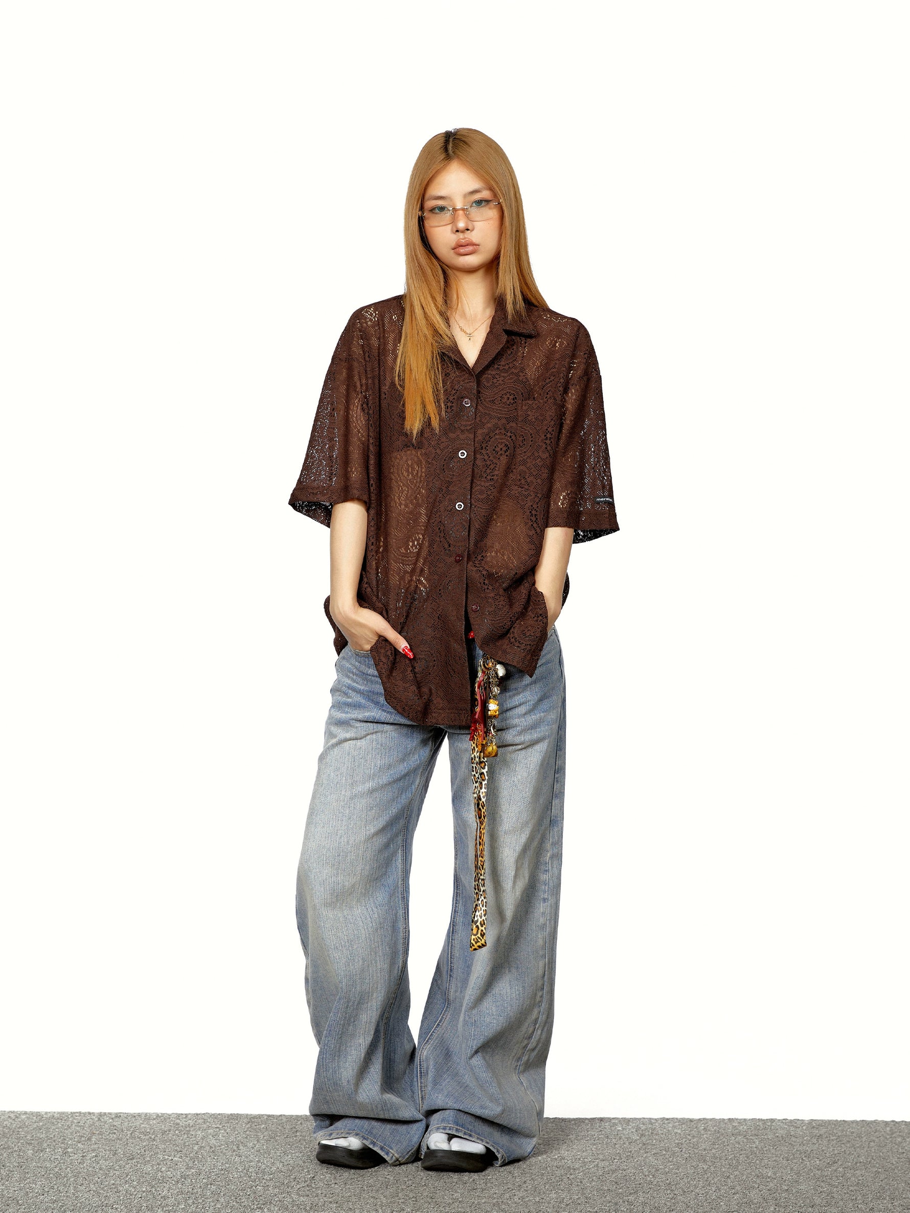 قميص قصير الأكمام فضفاض من الدانتيل