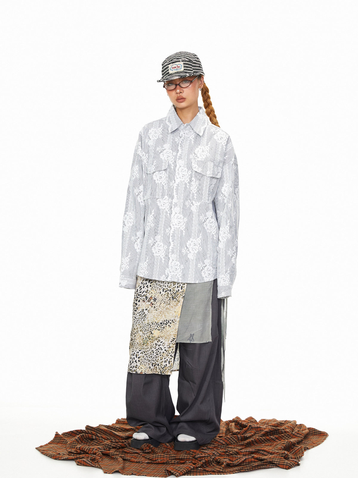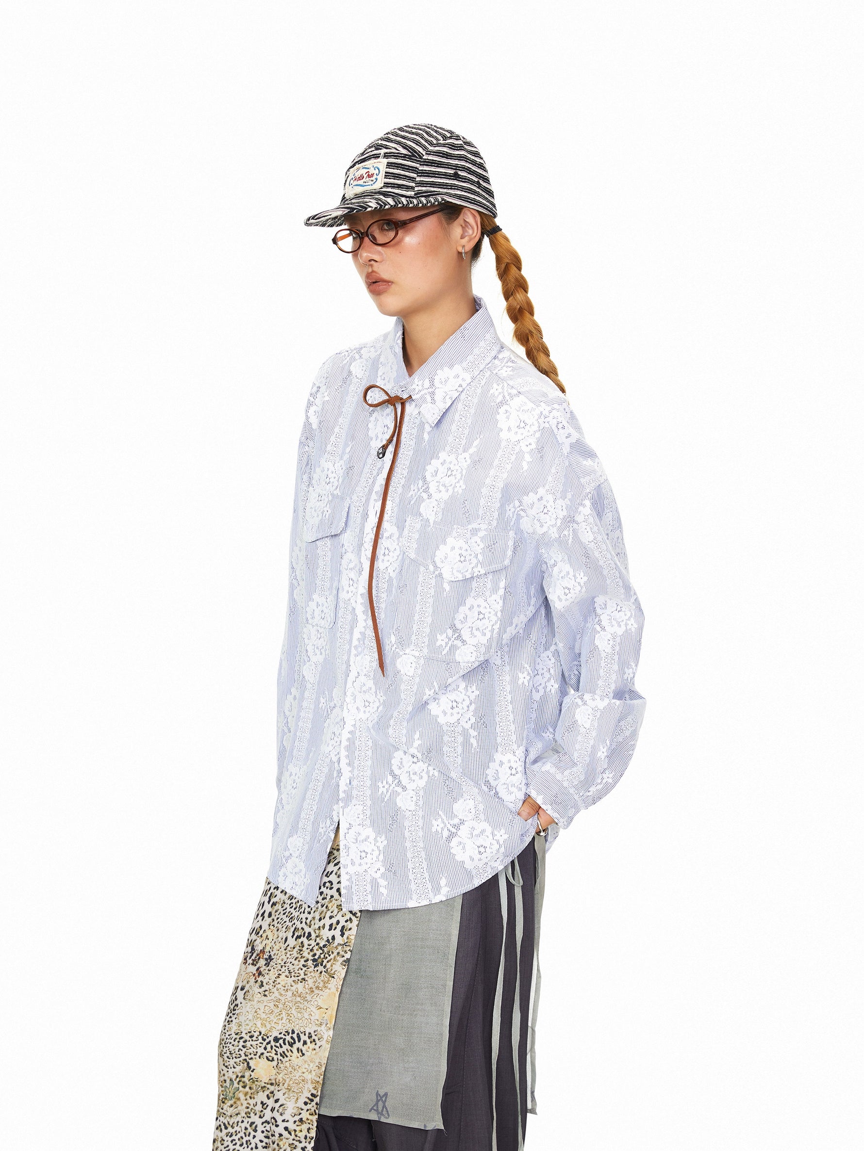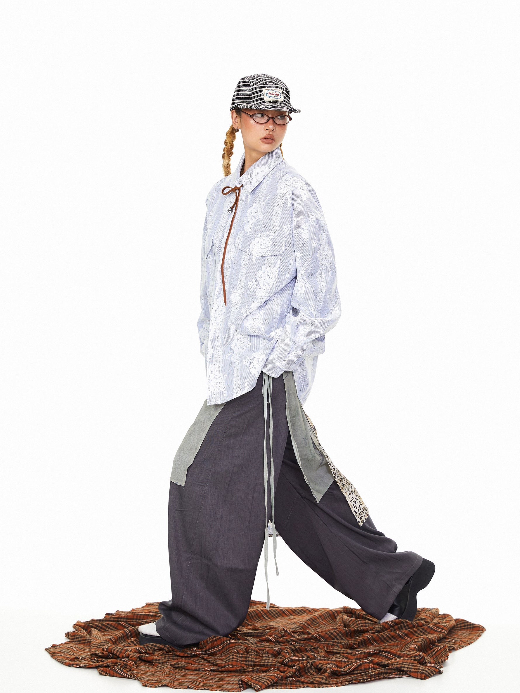قميص فضفاض بأكمام طويلة من الدانتيل والمربعات