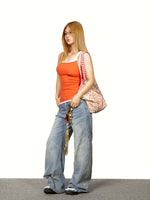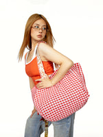 - حقيبة تسوق قابلة للعكس بنمطين: نمط قماش مربعات حمراء ونمط جلد الفهد مع كتابة "CHAOS"