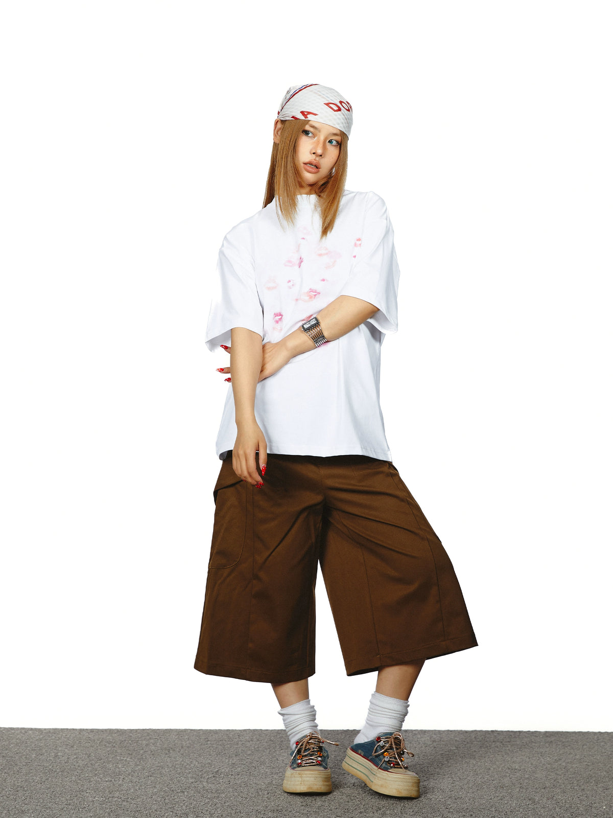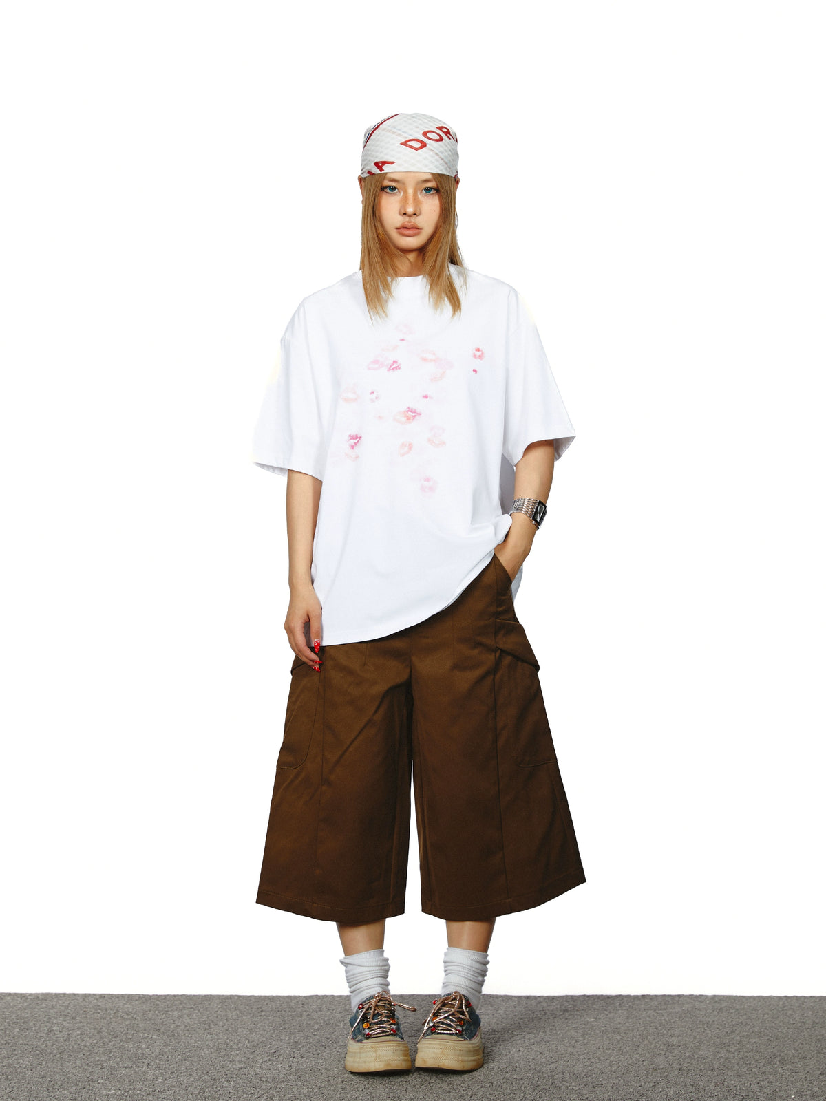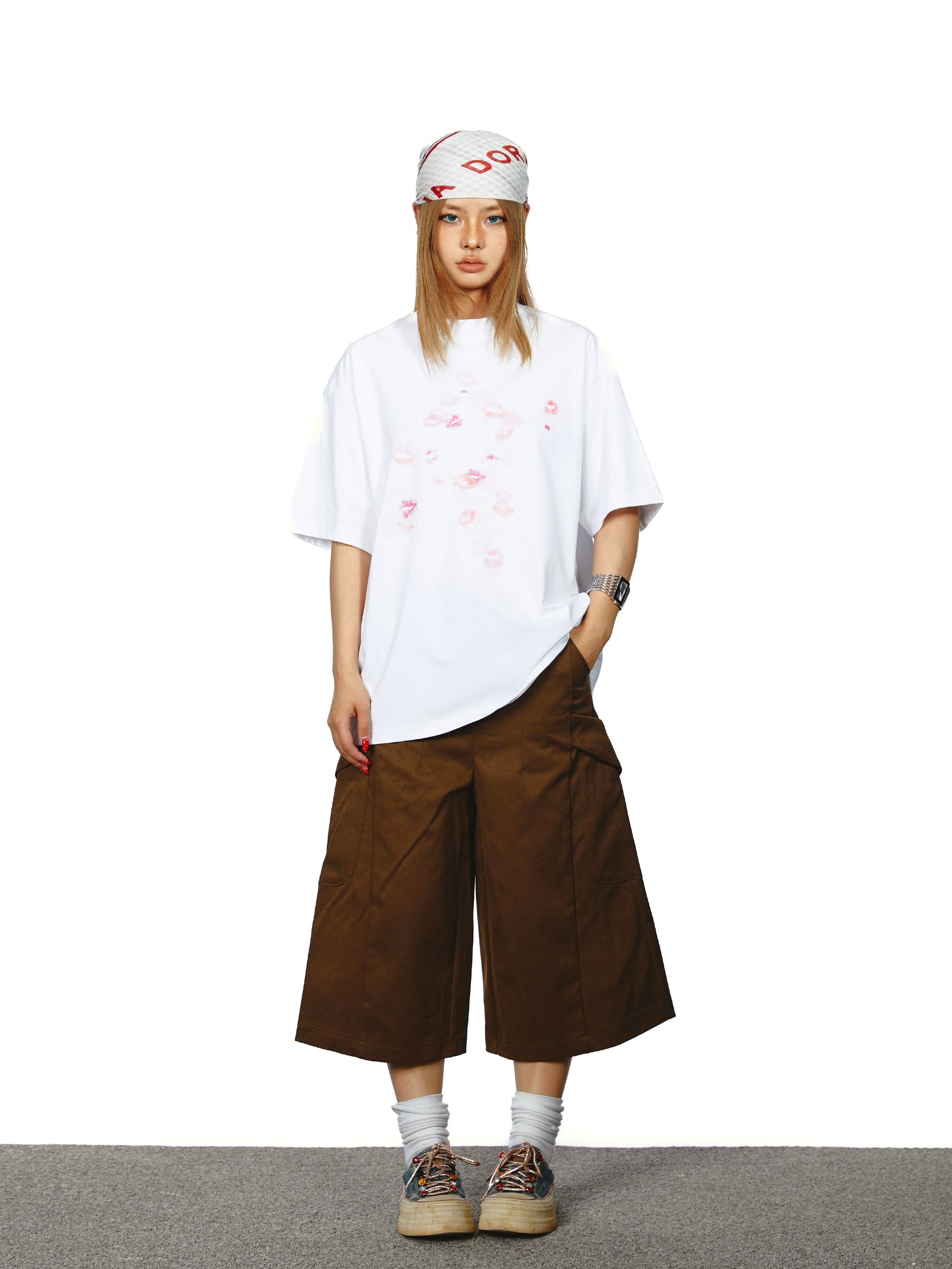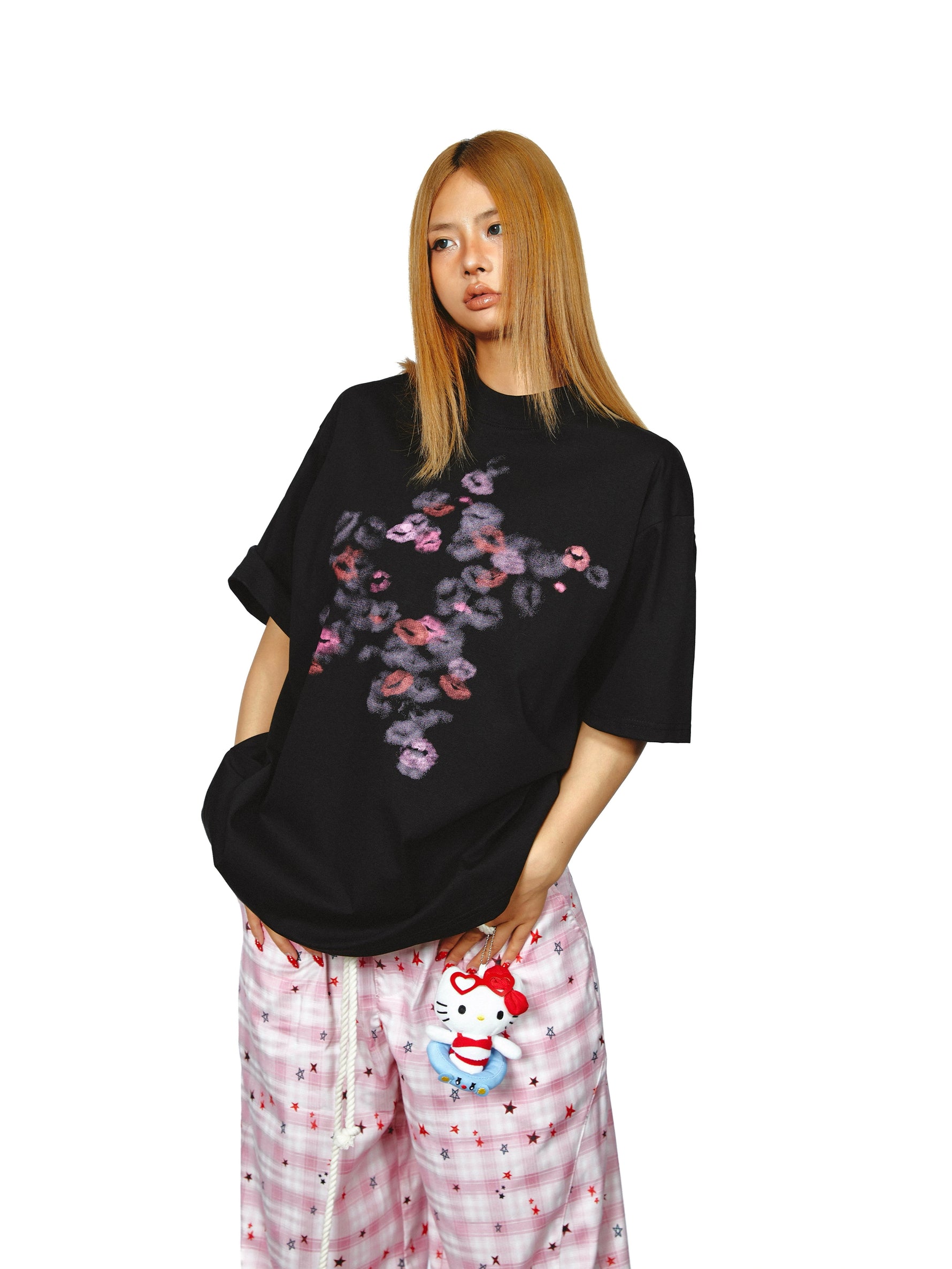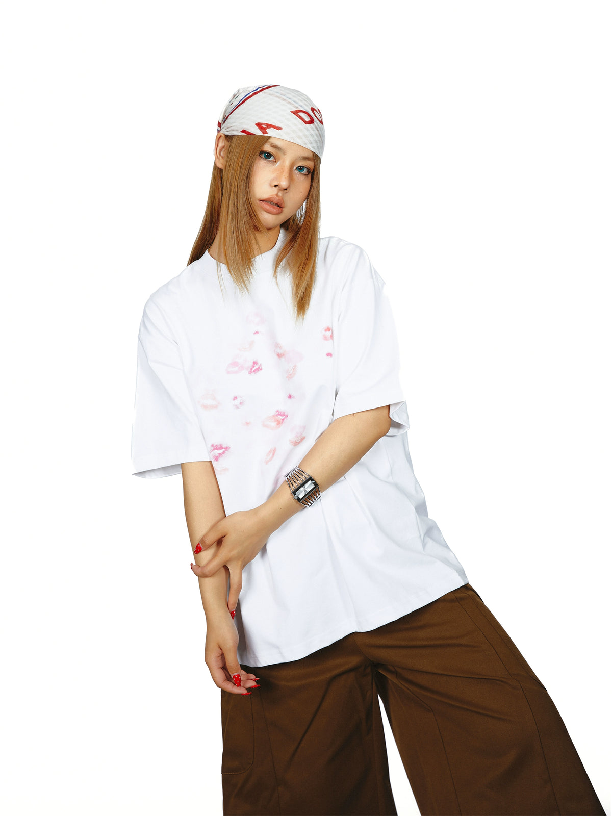 تي شيرت قصير الأكمام فضفاض بطبعة شفاه