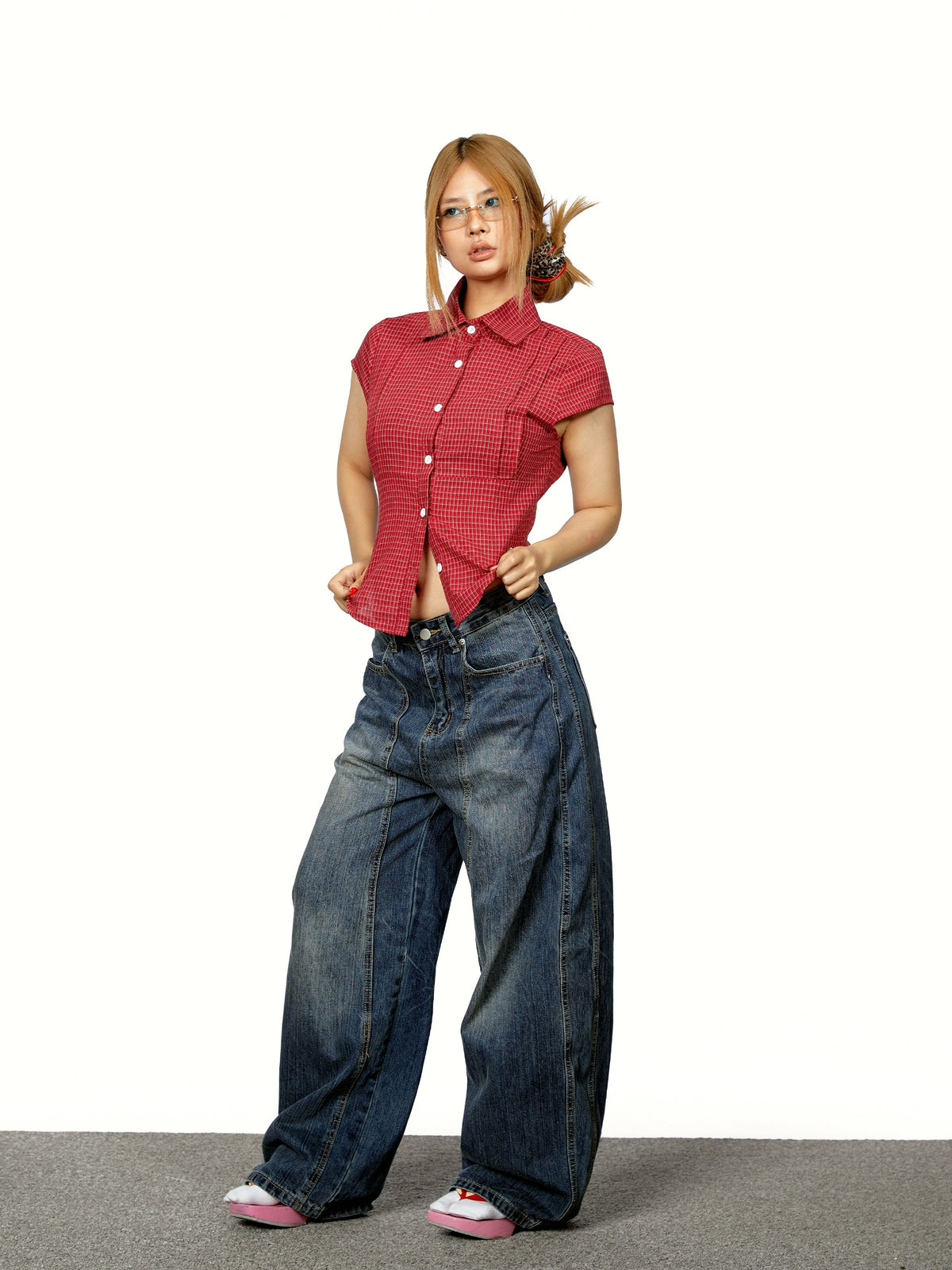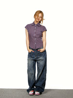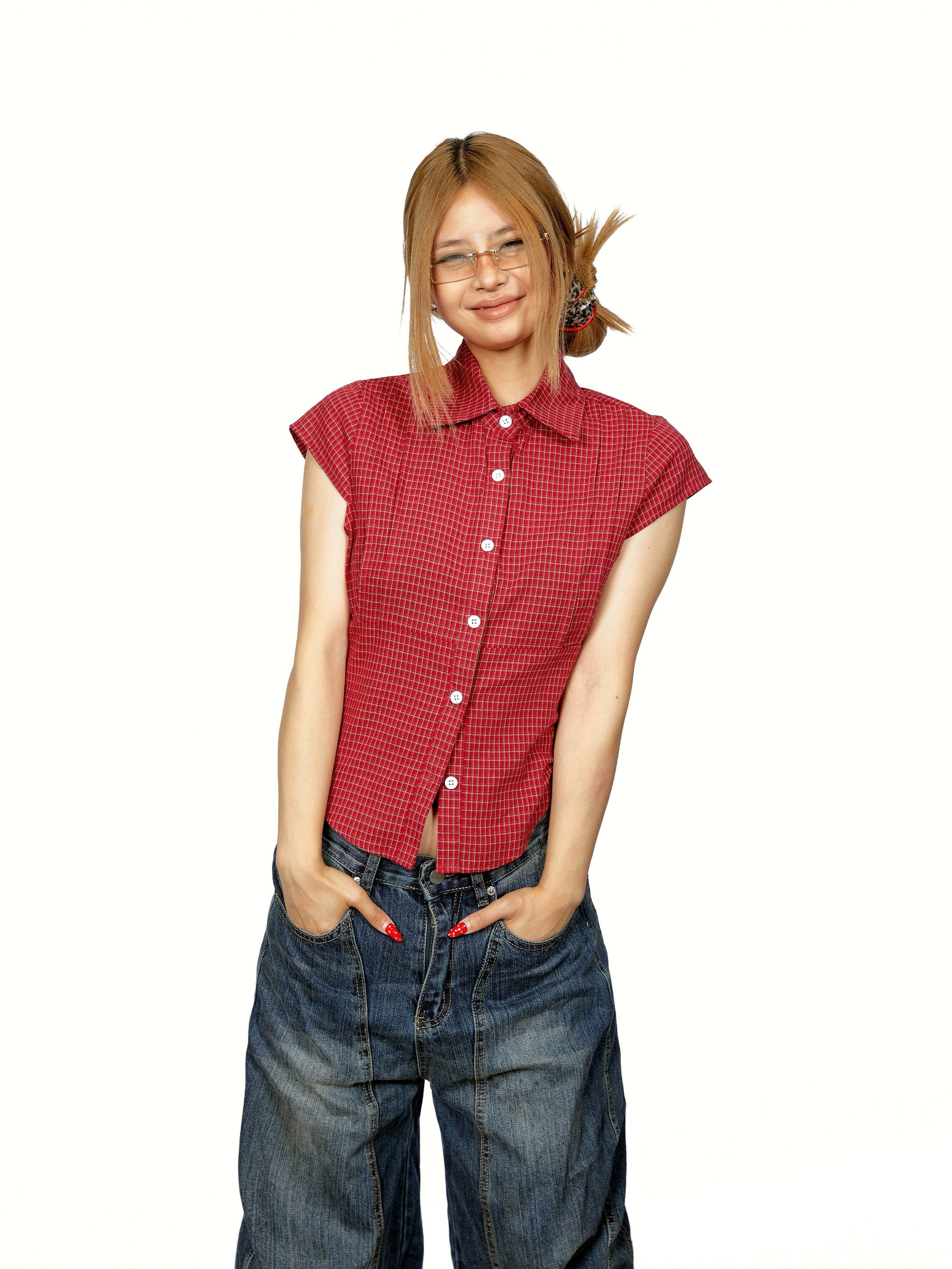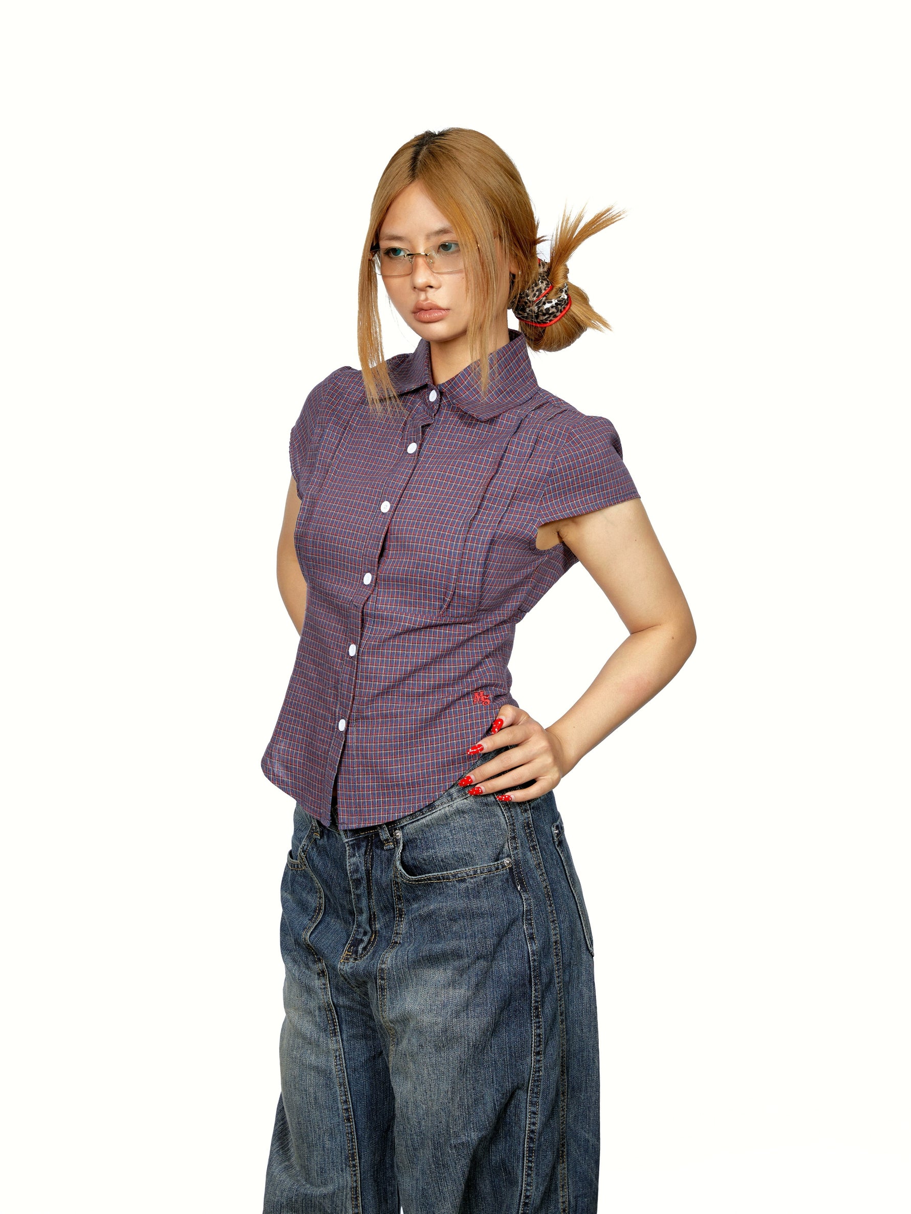 قميص قصير الأكمام مزرر بتصميم قصير من قماش الكاروهات