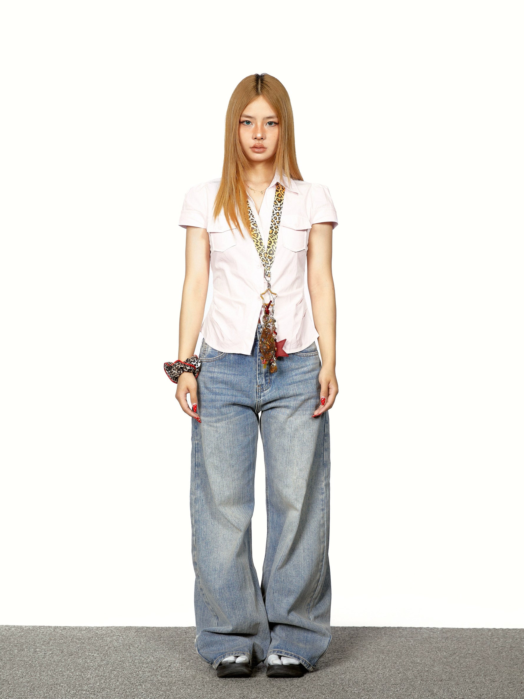 قميص بجيبين بأكمام قصيرة ومطوي عند الخصر