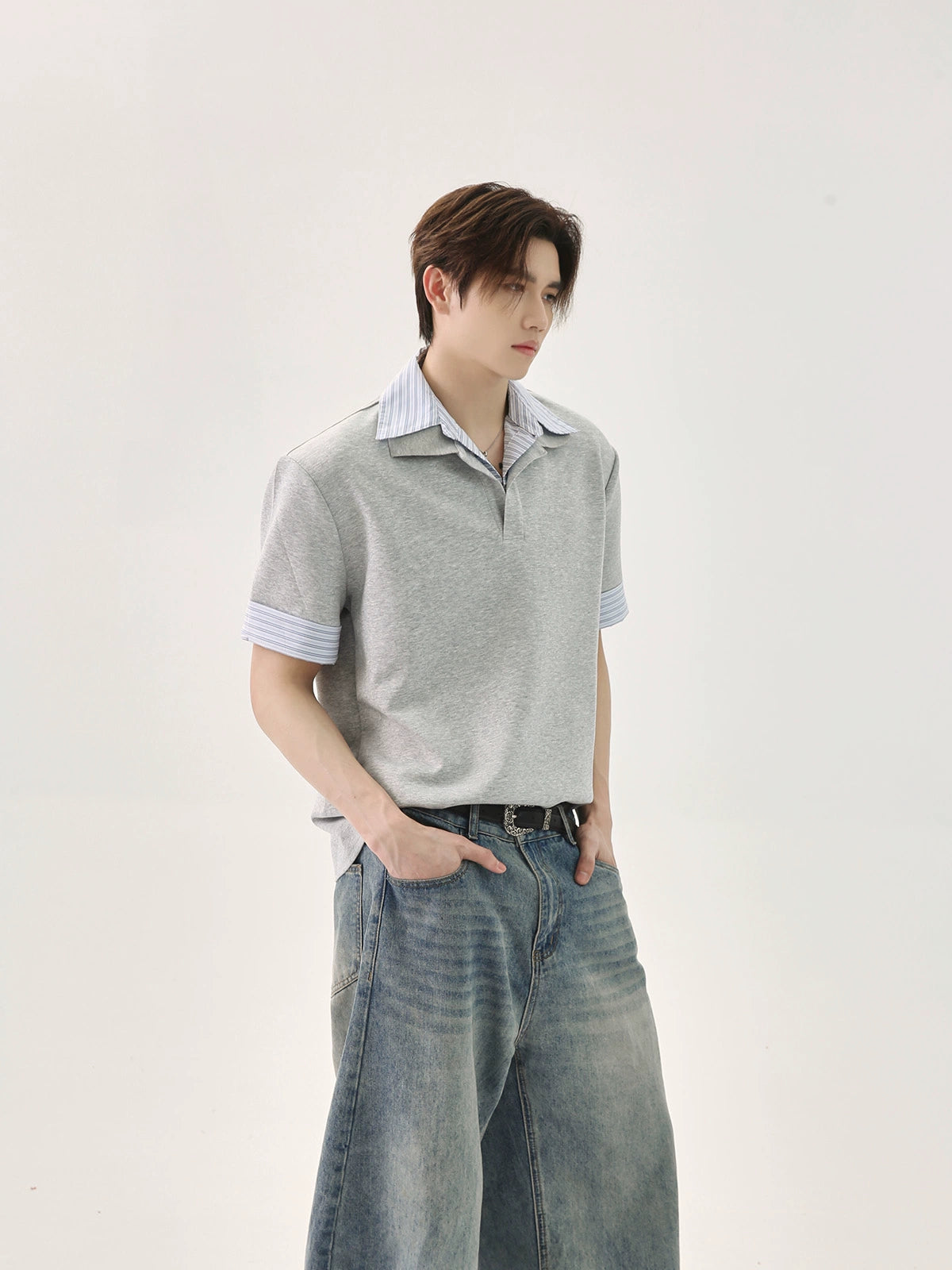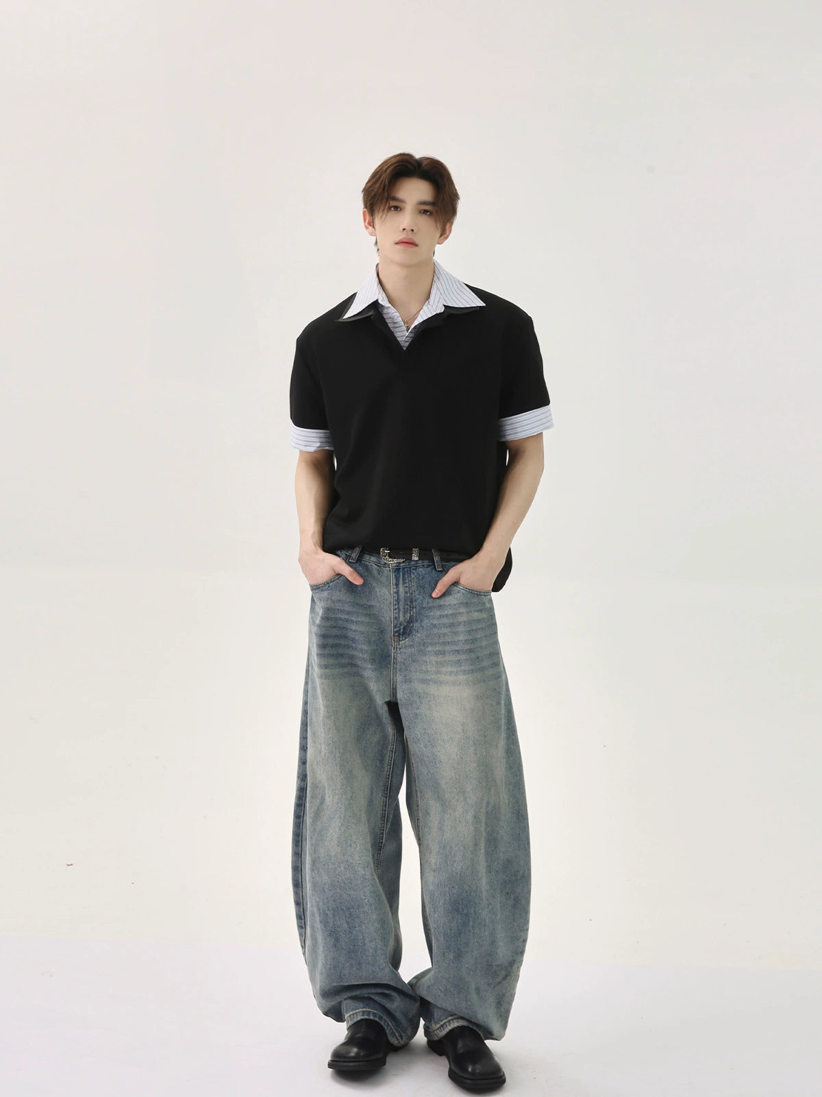 قميص بولو فضفاض مخطط بتصميم باتش وورك