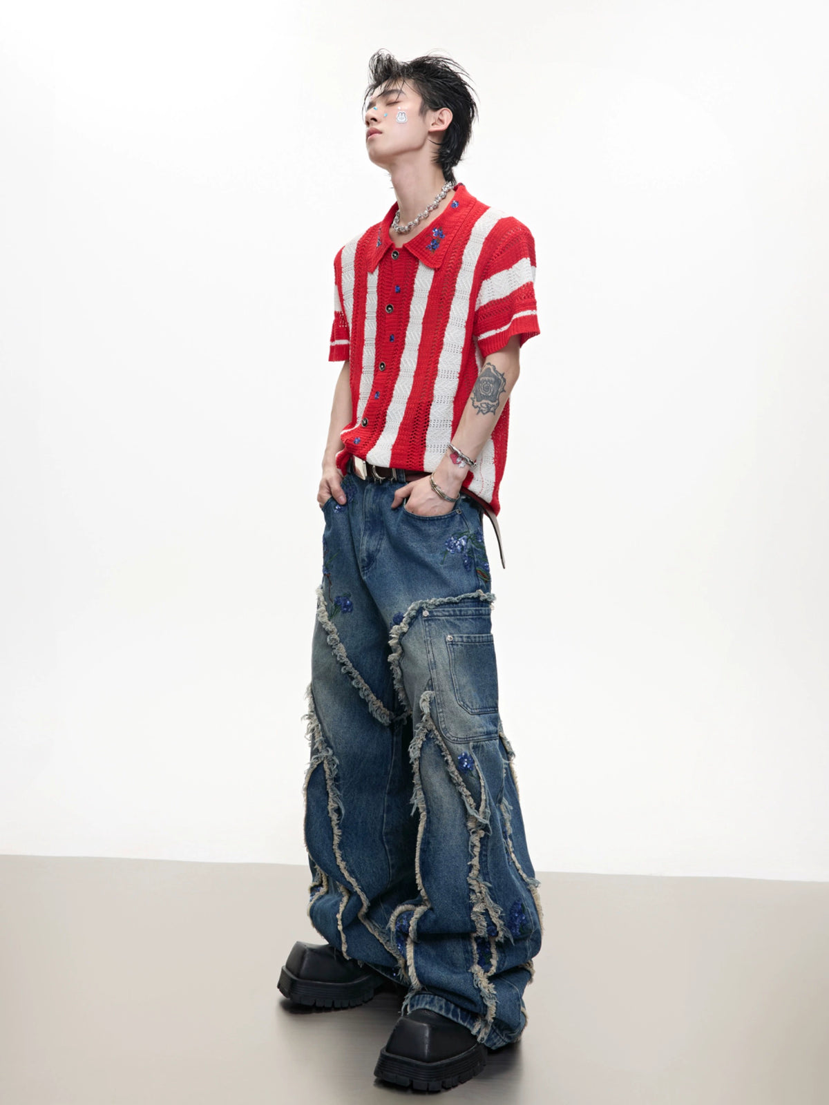 - تتحد الخرزات مع قماش الدنيم من خلال تطريز الخرز. يتم توزيع الخرزات في أنماط التطريز, متناقضة مع الثقوب والخرزات, مما يخلق مظهرًا خشنًا ولكنه رقيق. لديهم ثبات عالي وليس من السهل أن تسقط.
