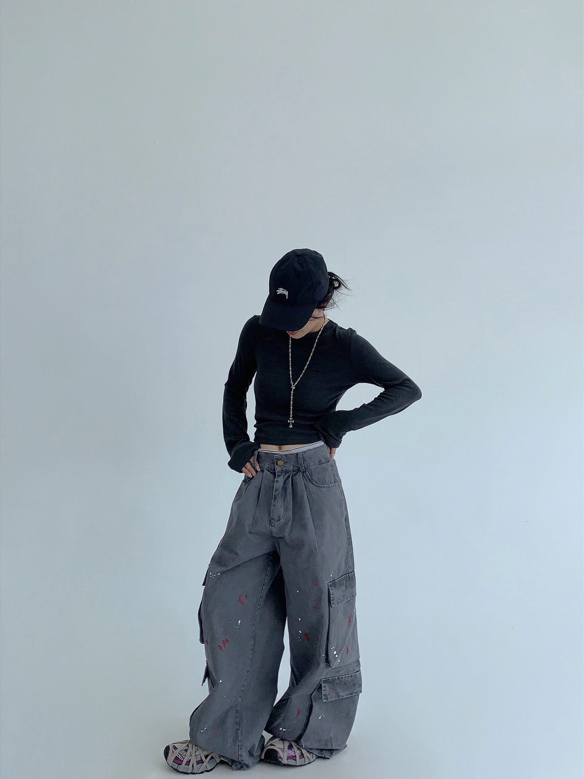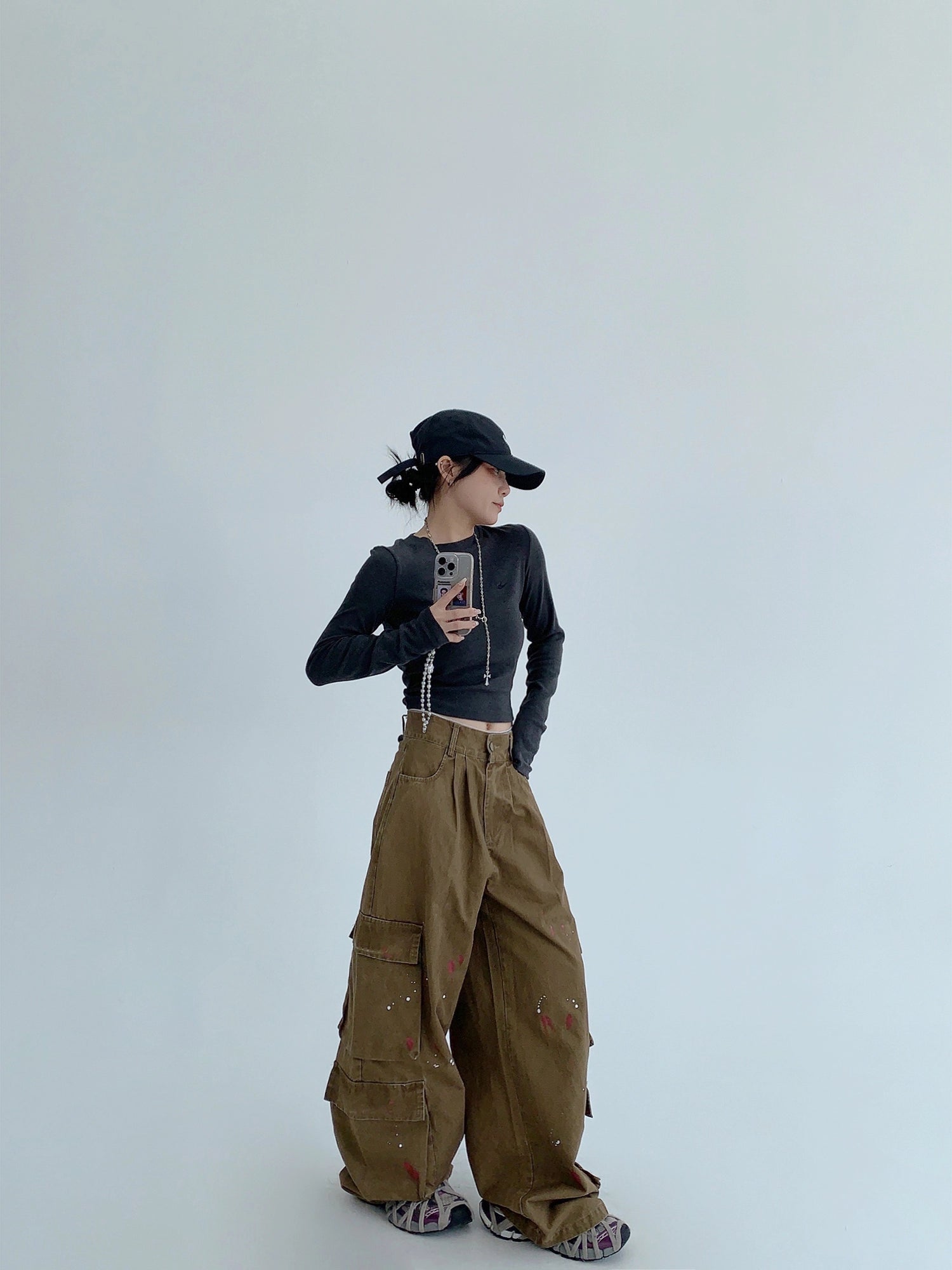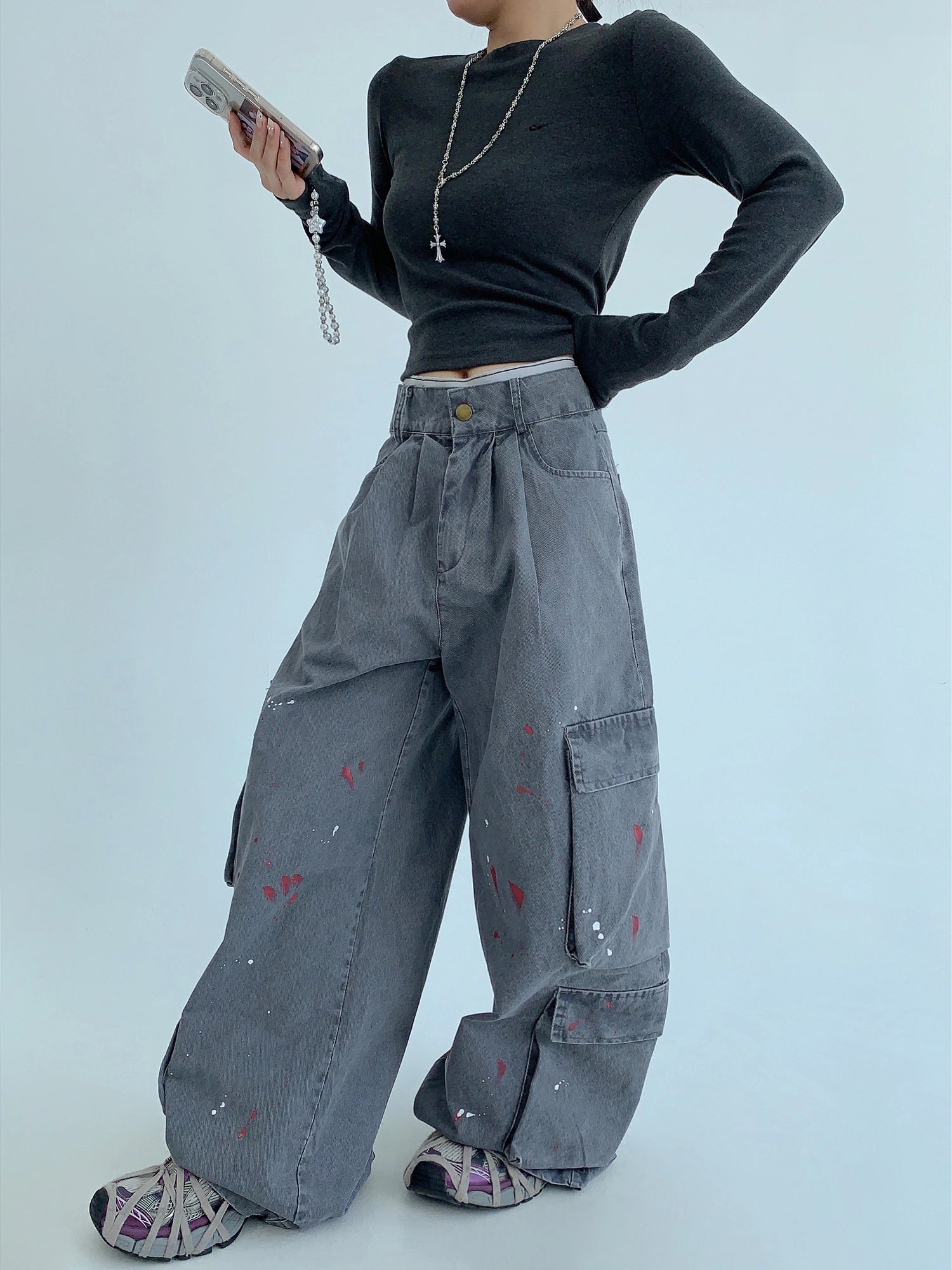 سروال كارجو واسع الساق بتصميم بقع الطلاء