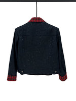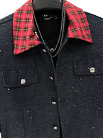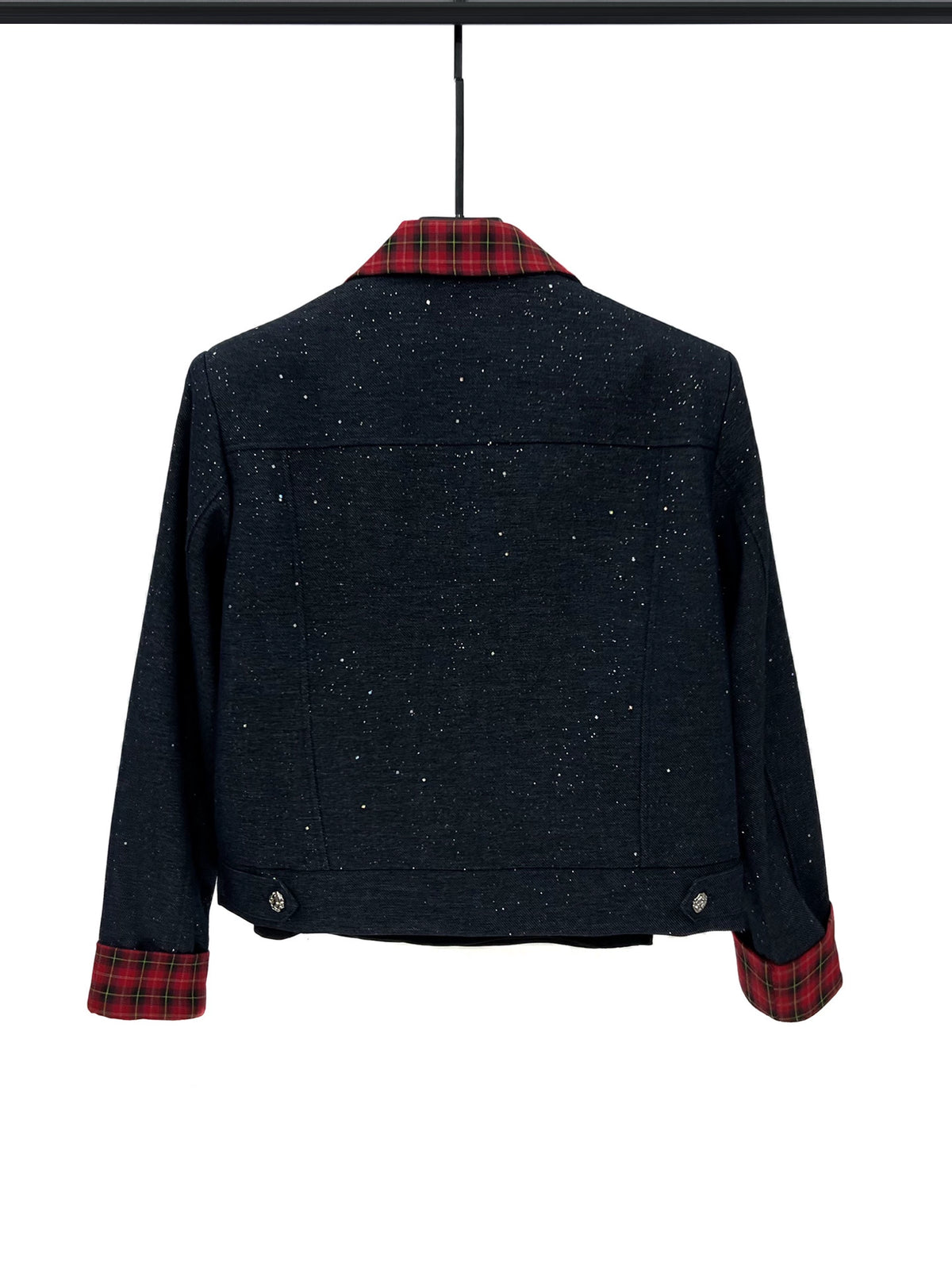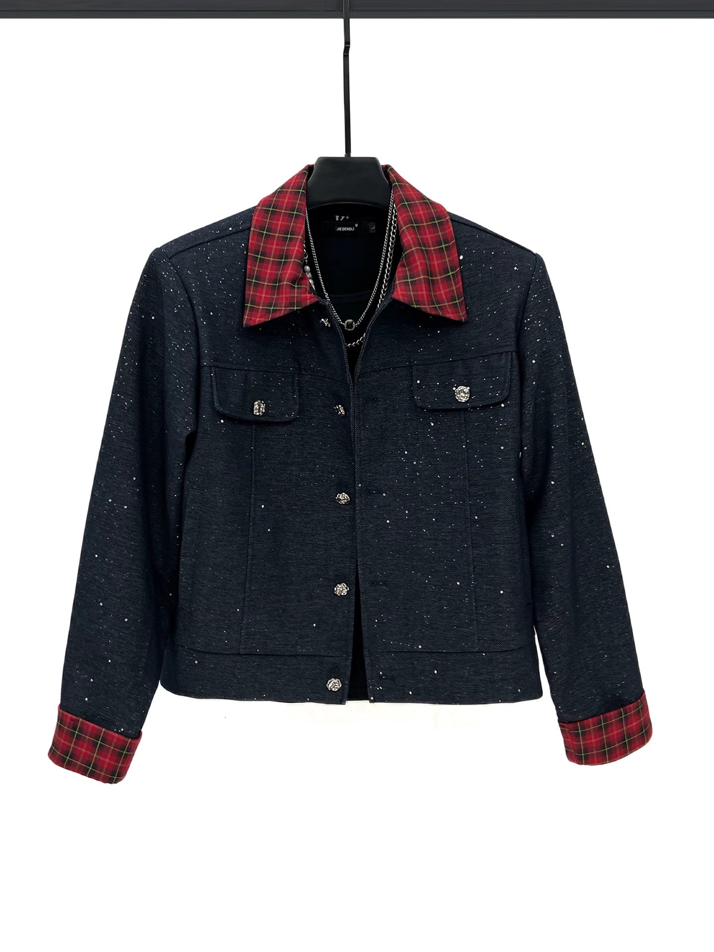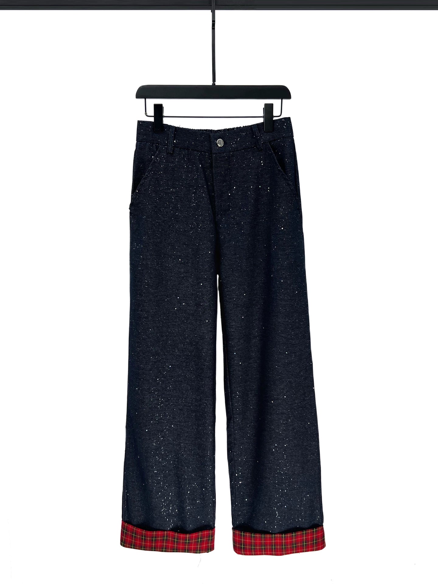 - تقليمات من قماش الفلانيل المخطط المتباين على الياقة, والأصفاد, وحافة البنطلون