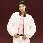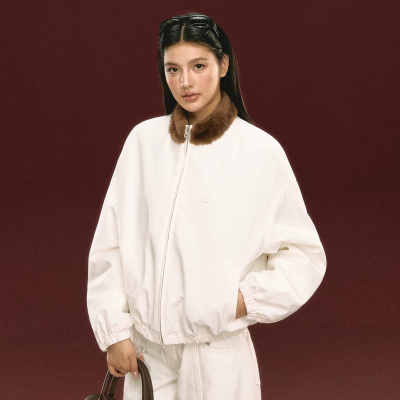 جاكيت قصير بسحاب مع حواف من الفرو الصناعي