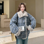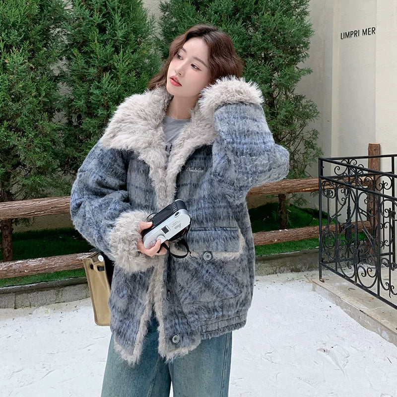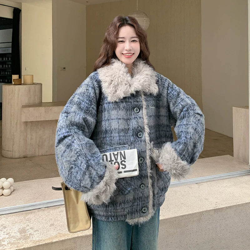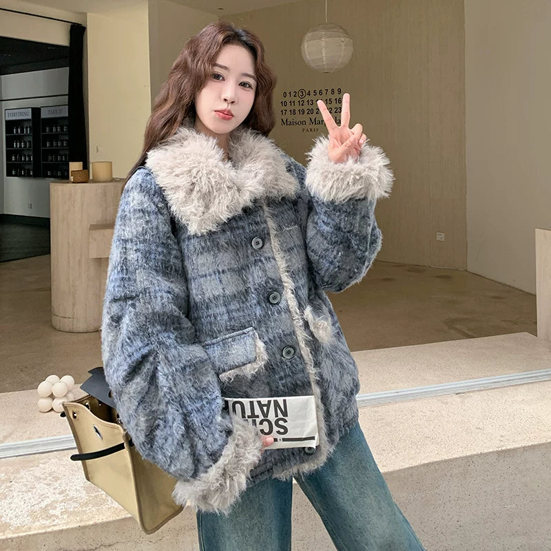 معطف من صوف شيرلينغ مزيف بنقشة الكاروهات