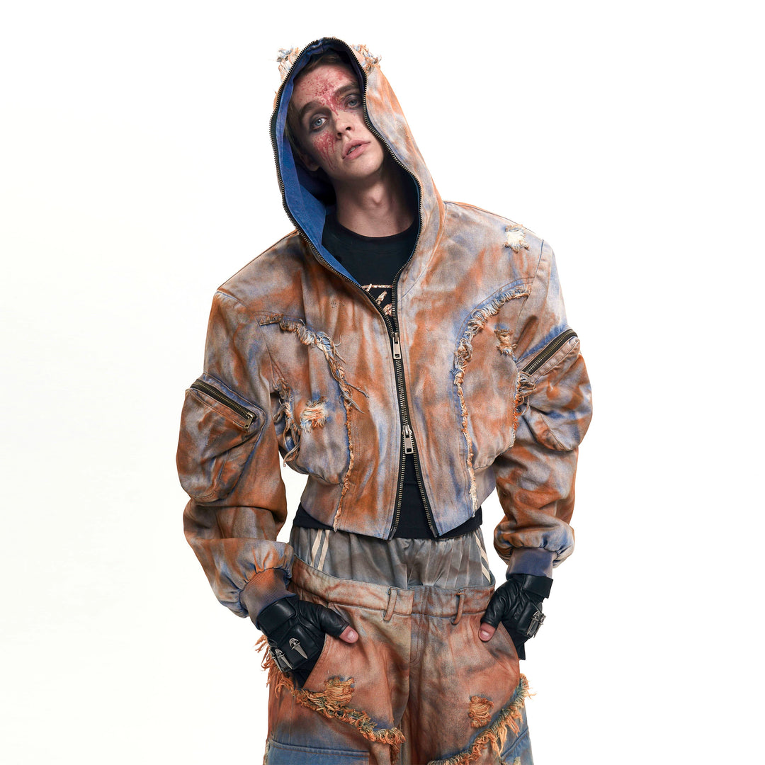 - Irregular structure with distressed wool edge, short cropped hooded jacket with mud dyeing, multi-deconstructed irregular fabric design.