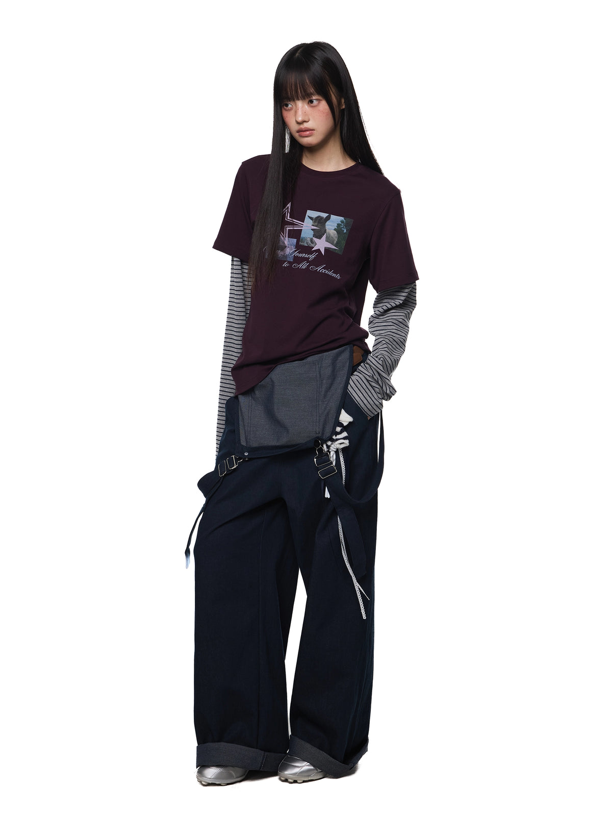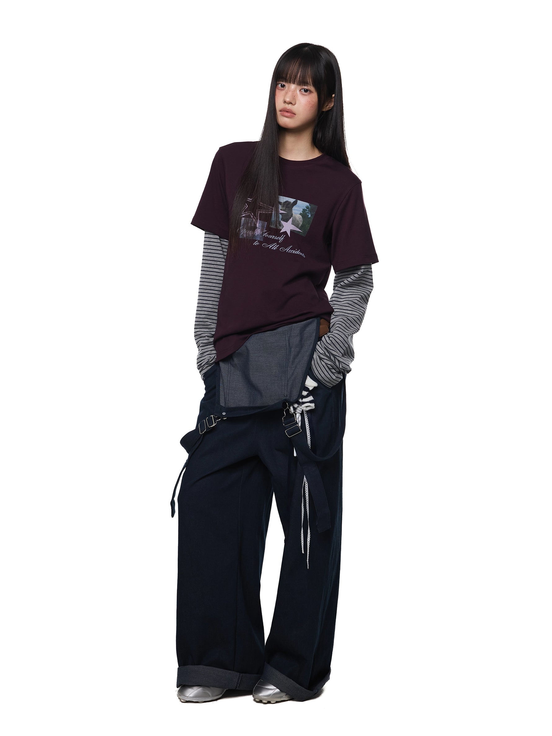 تي شيرت جرافيك بأكمام مخططة متعددة الطبقات