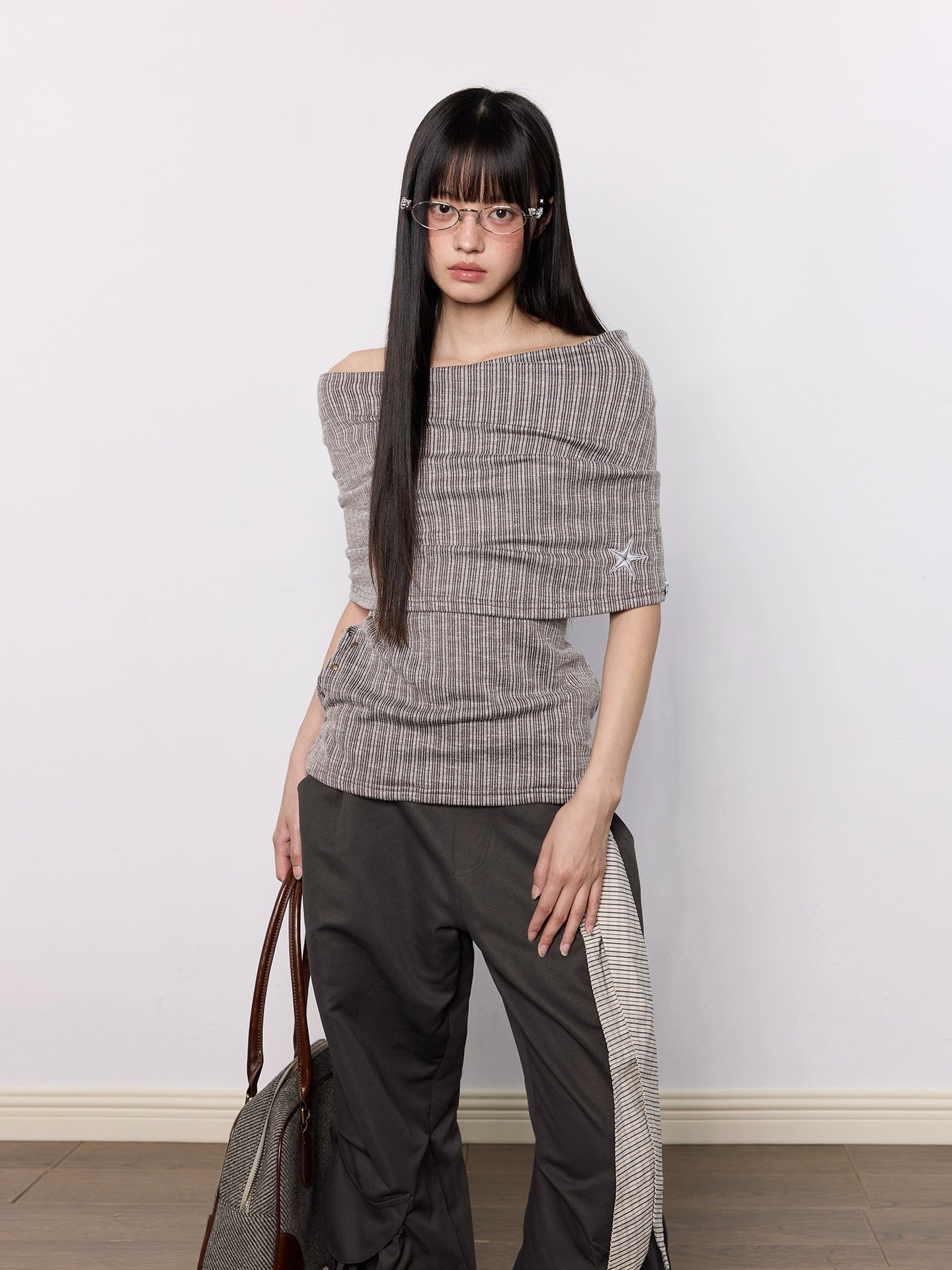 بلوزة قصيرة الأكمام محبوكة مضلعة بدون أكتاف