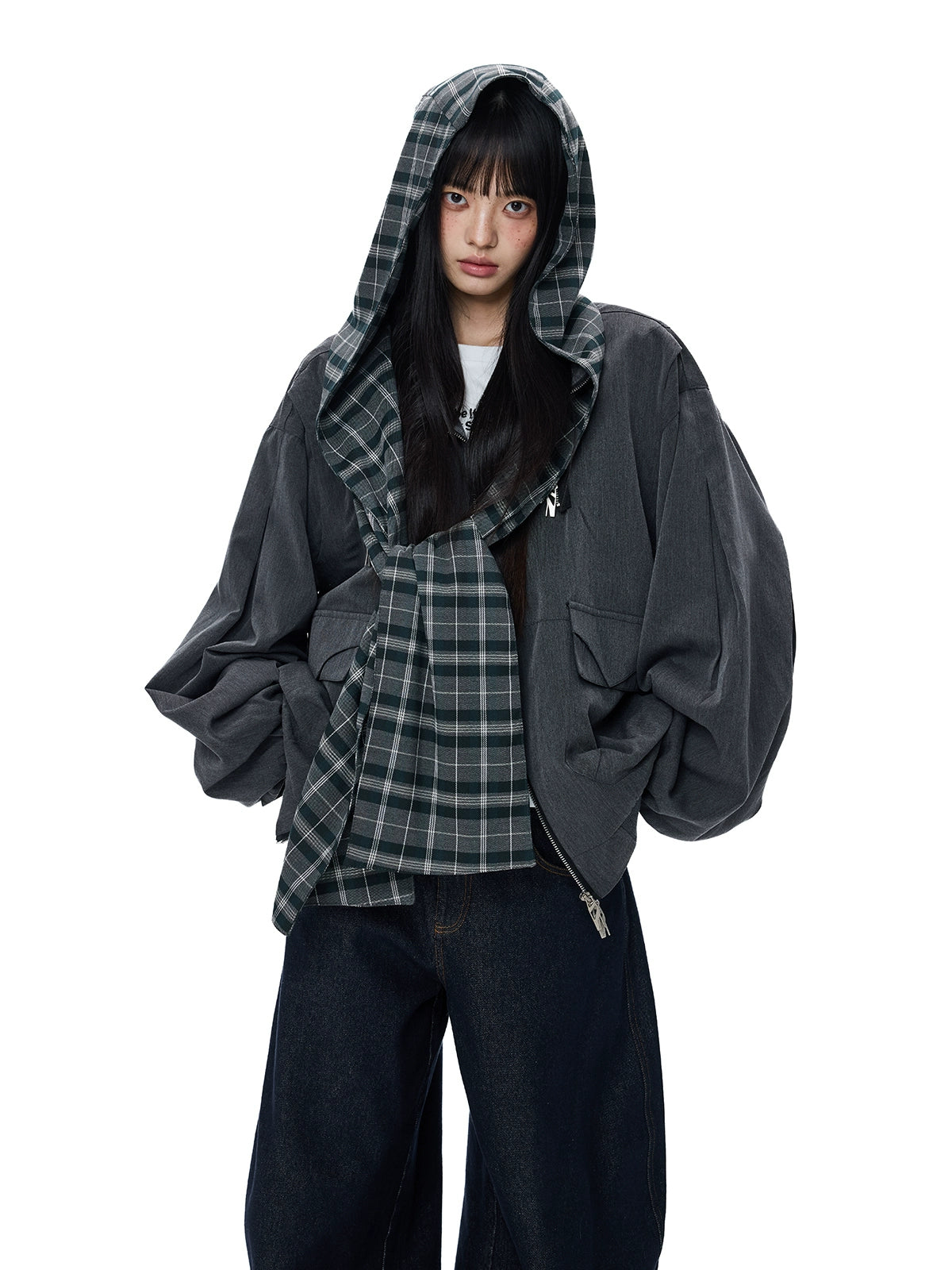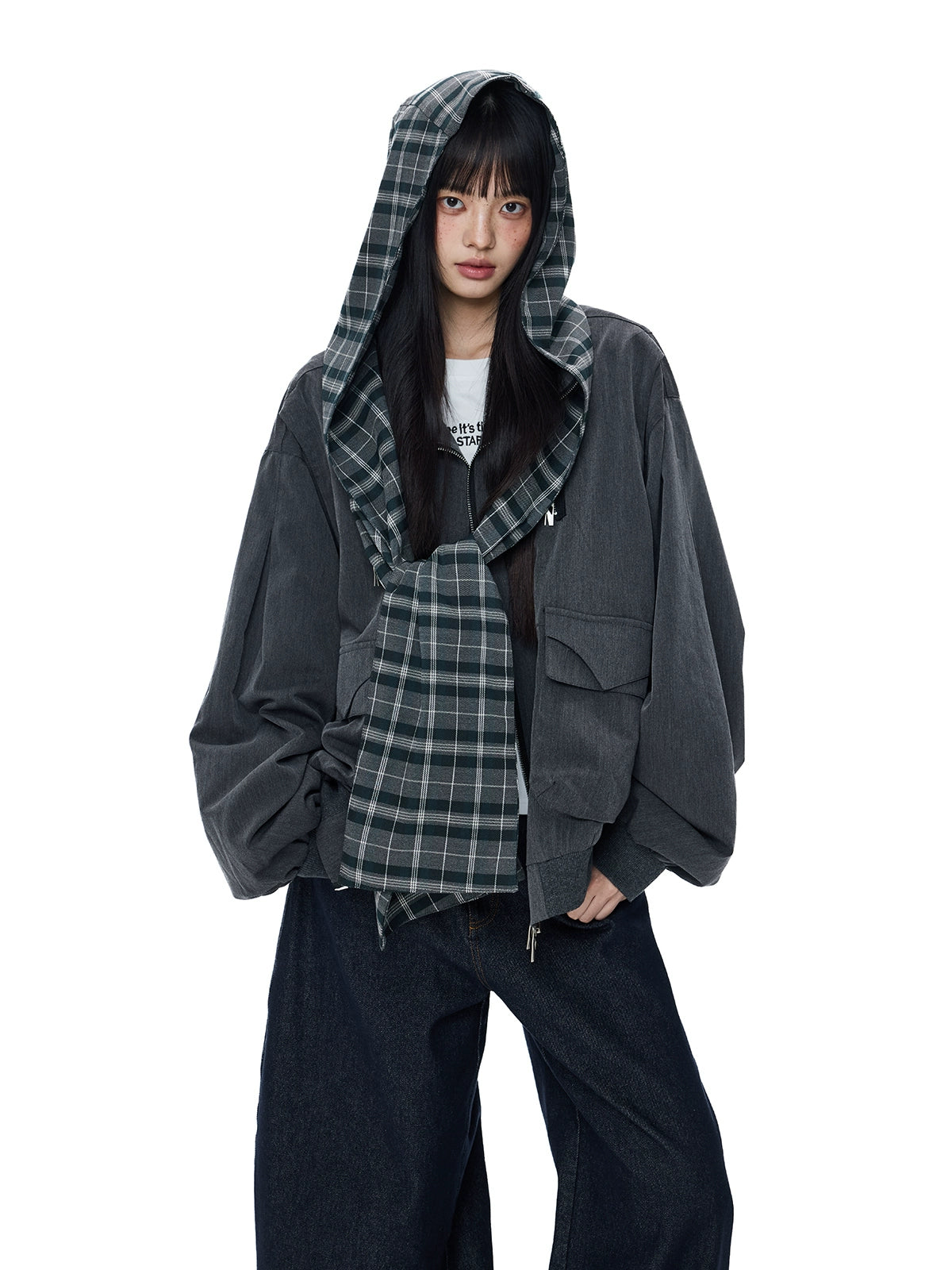 طقم جاكيت بقلنسوة وم pockets من قماش الكاروهات