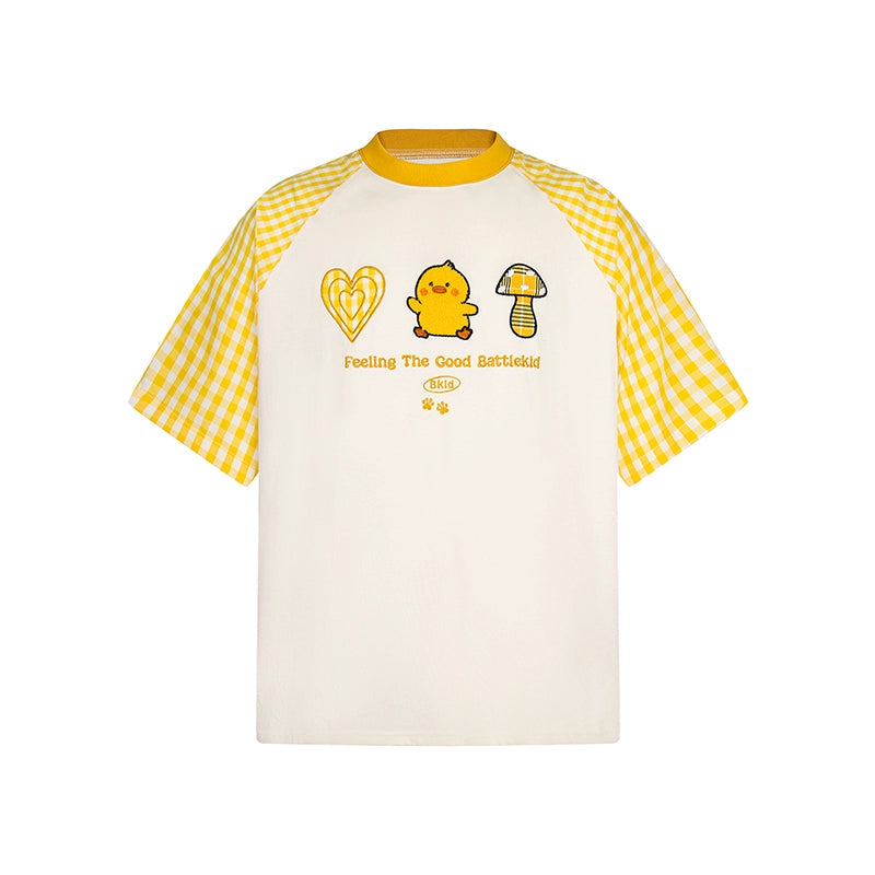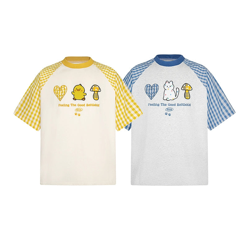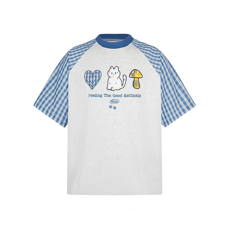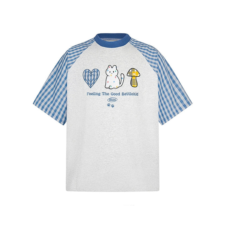 Plaid Sleeve Raglan Cartoon Graphic T-shirt
