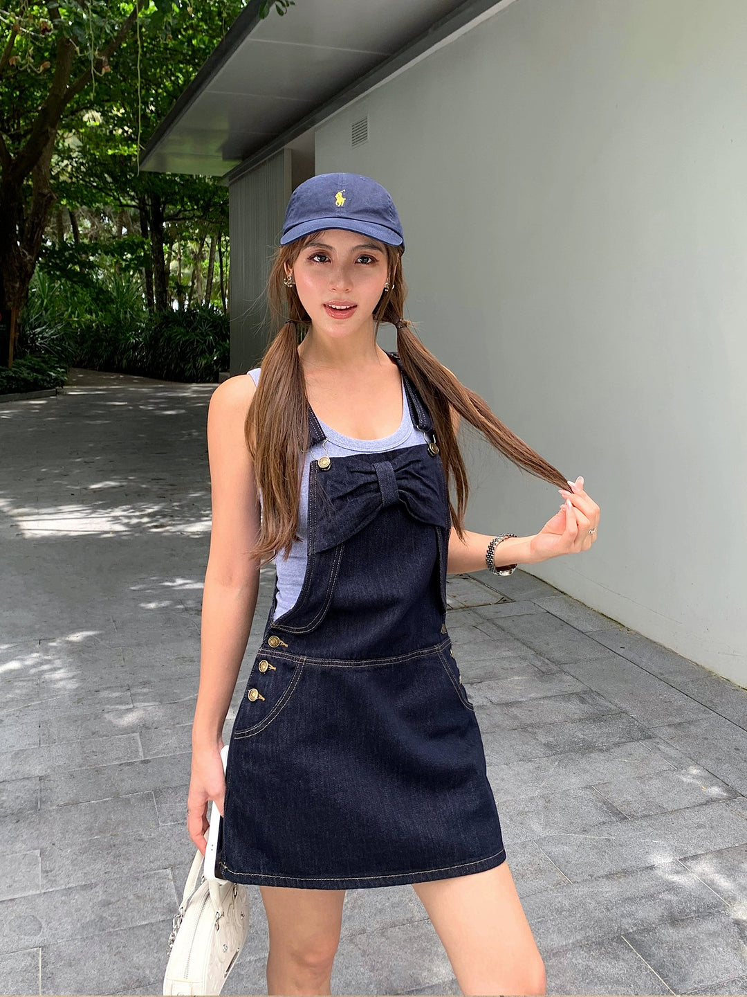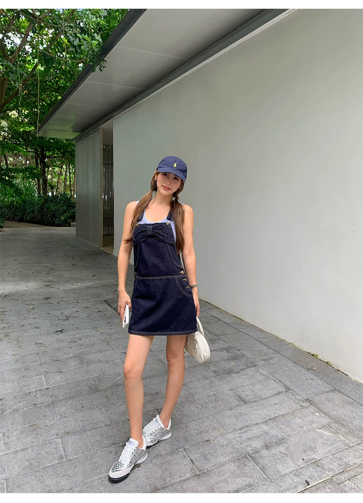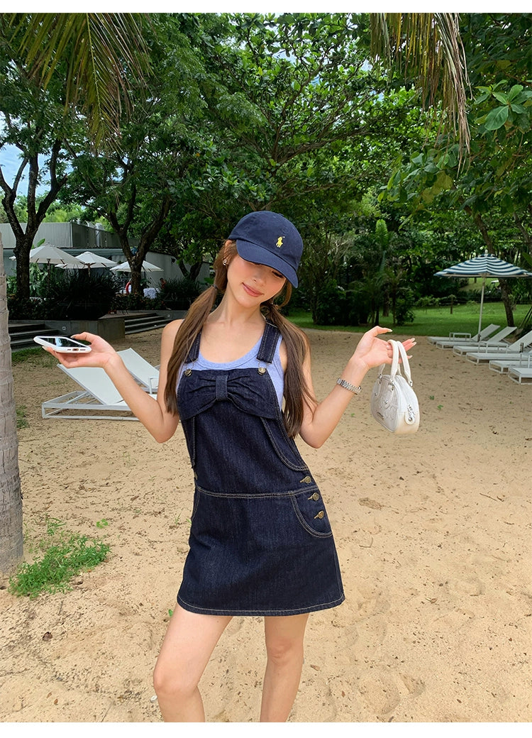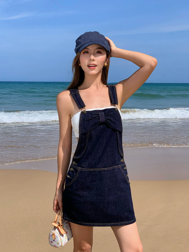 Denim Overall Skirt with Bow Detail