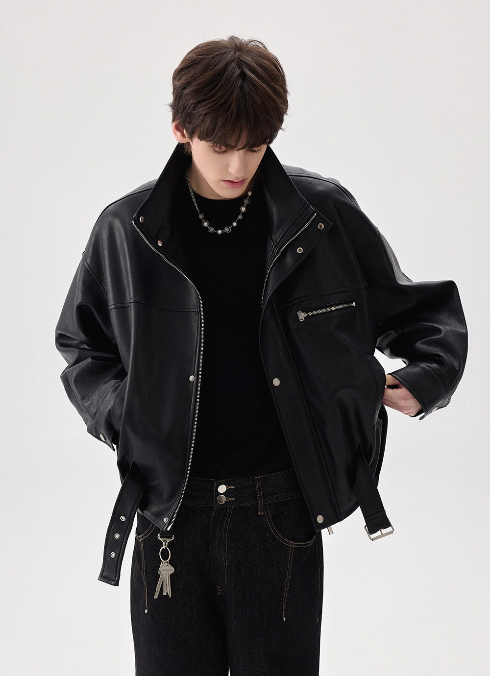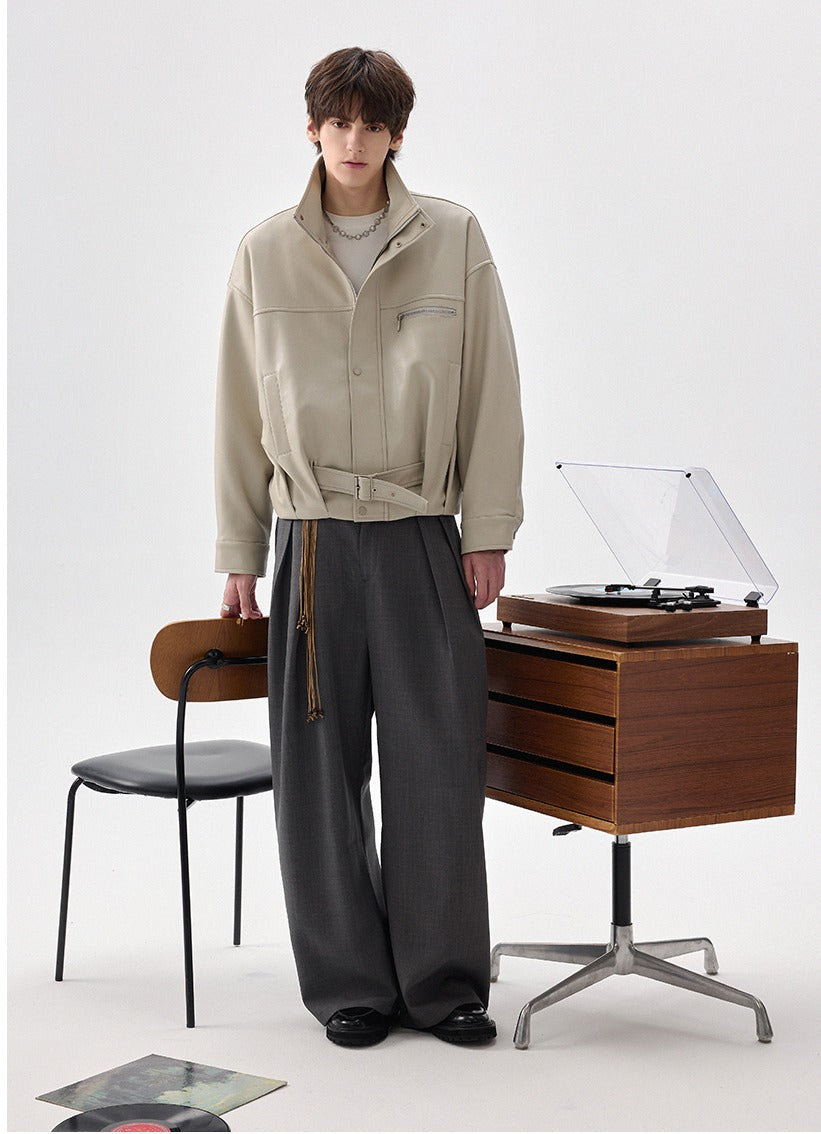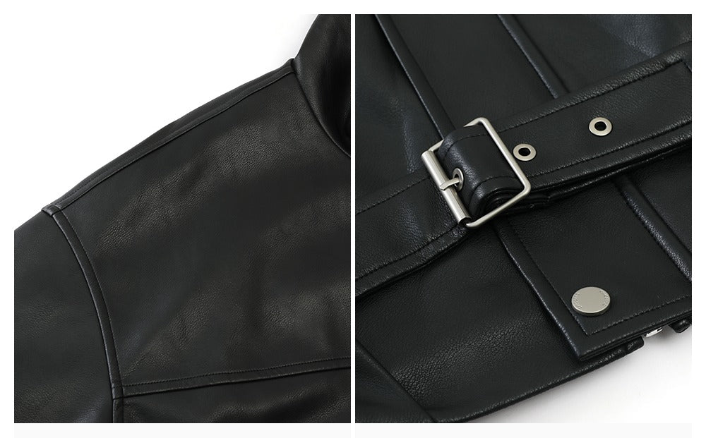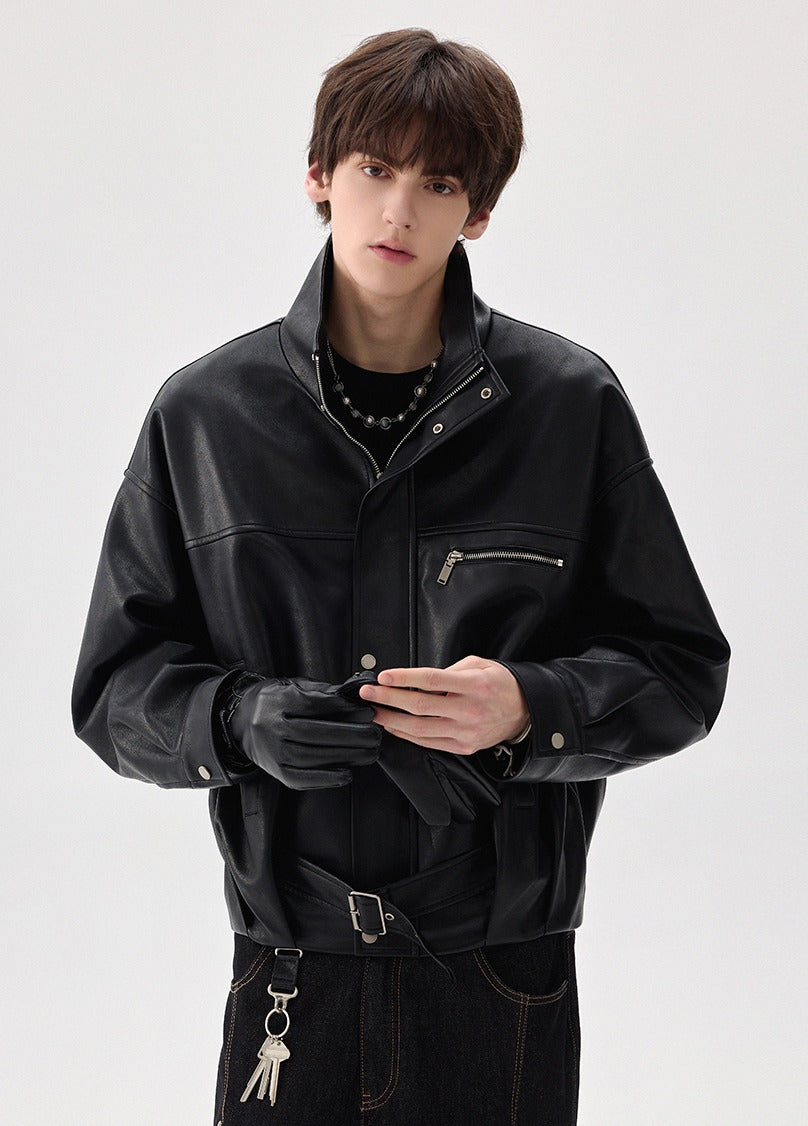 High-Collar Zipper Leather Jacket