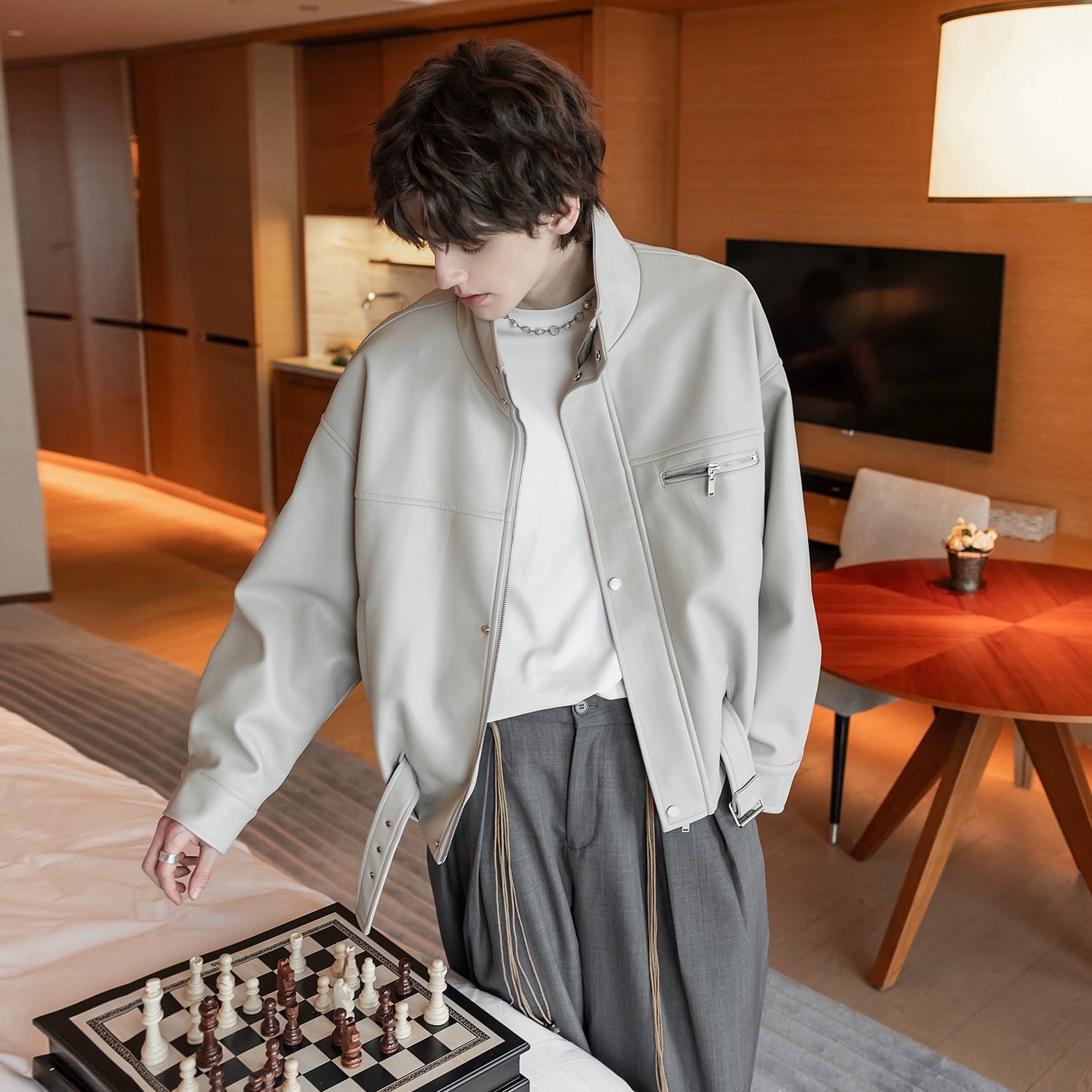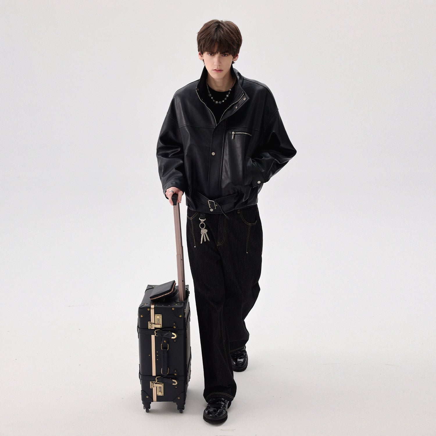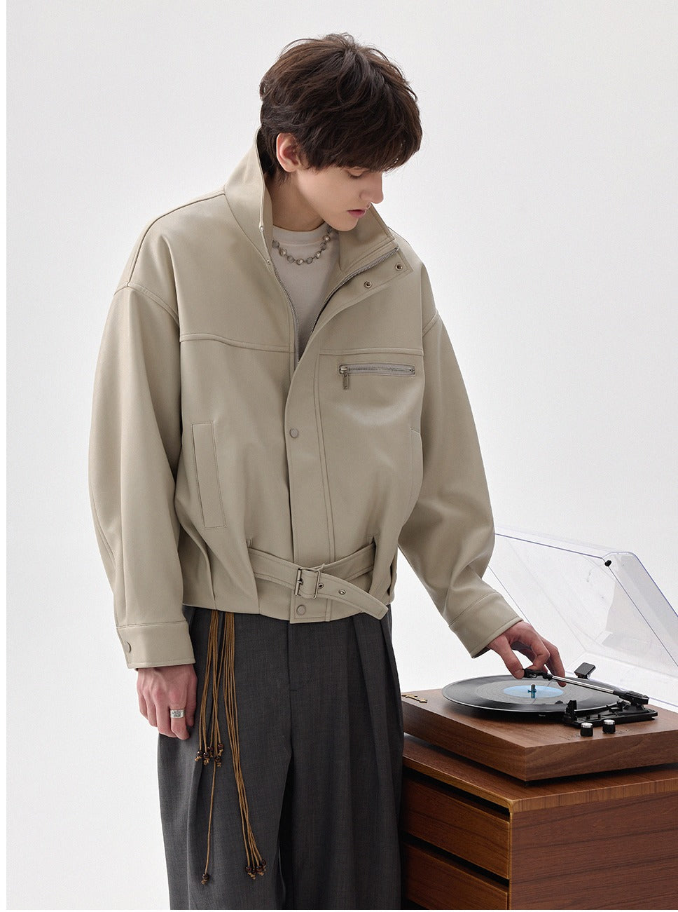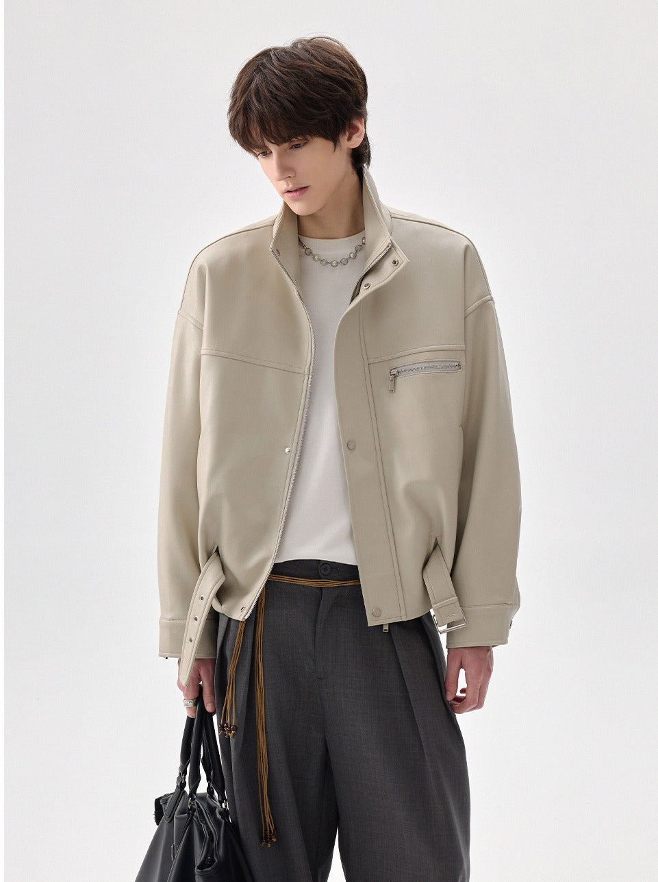 High-Collar Zipper Leather Jacket