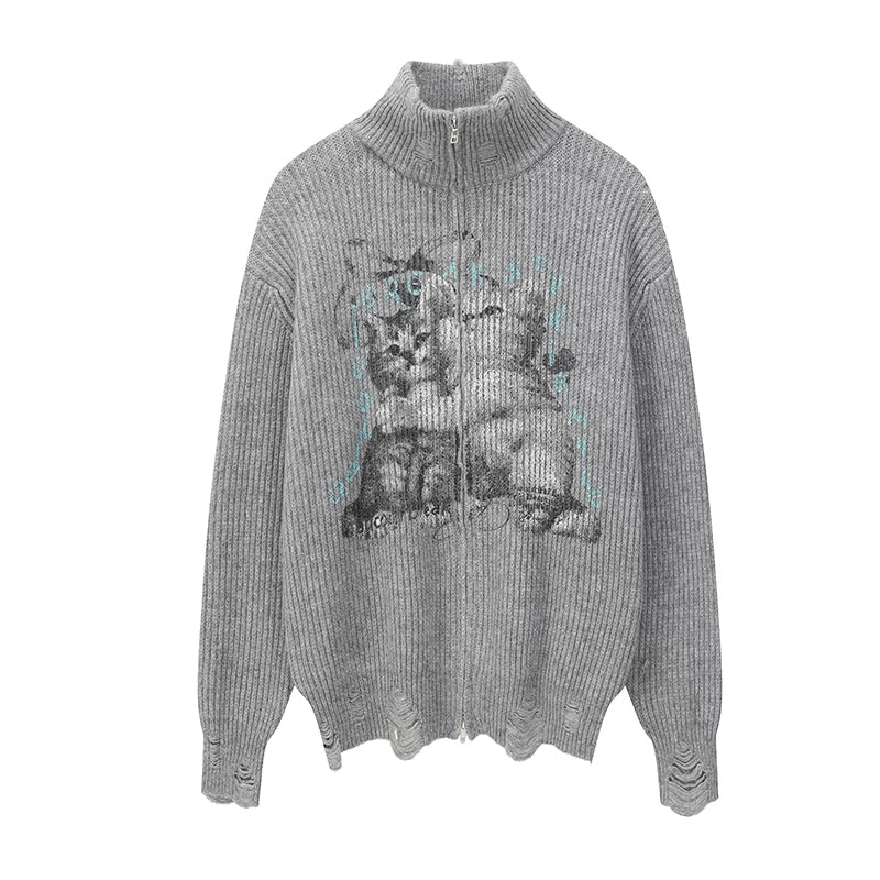 Cat Print Zip Up Knit Cardigan