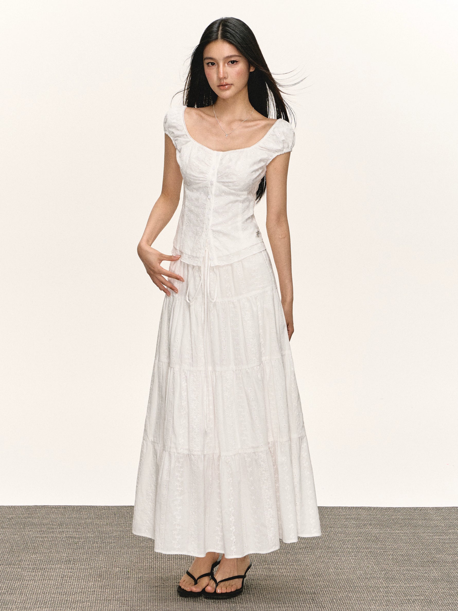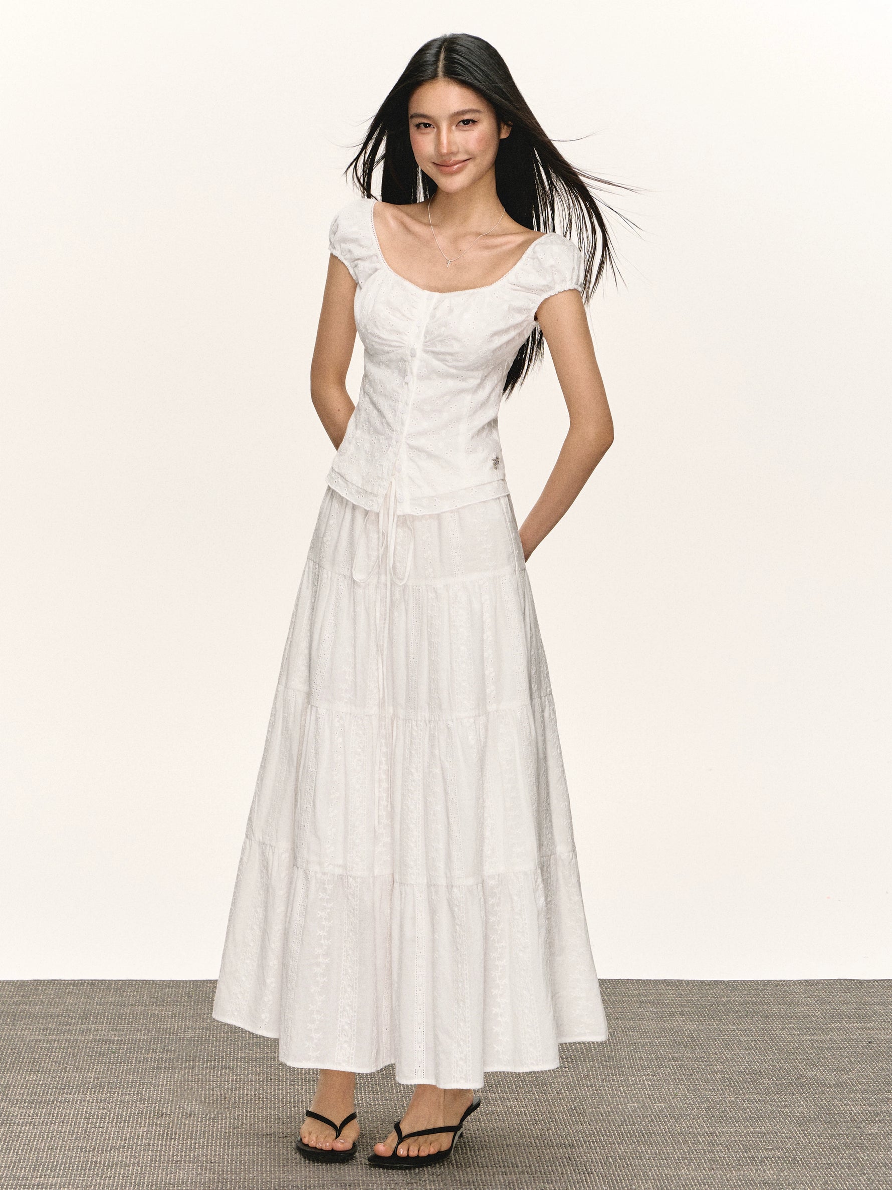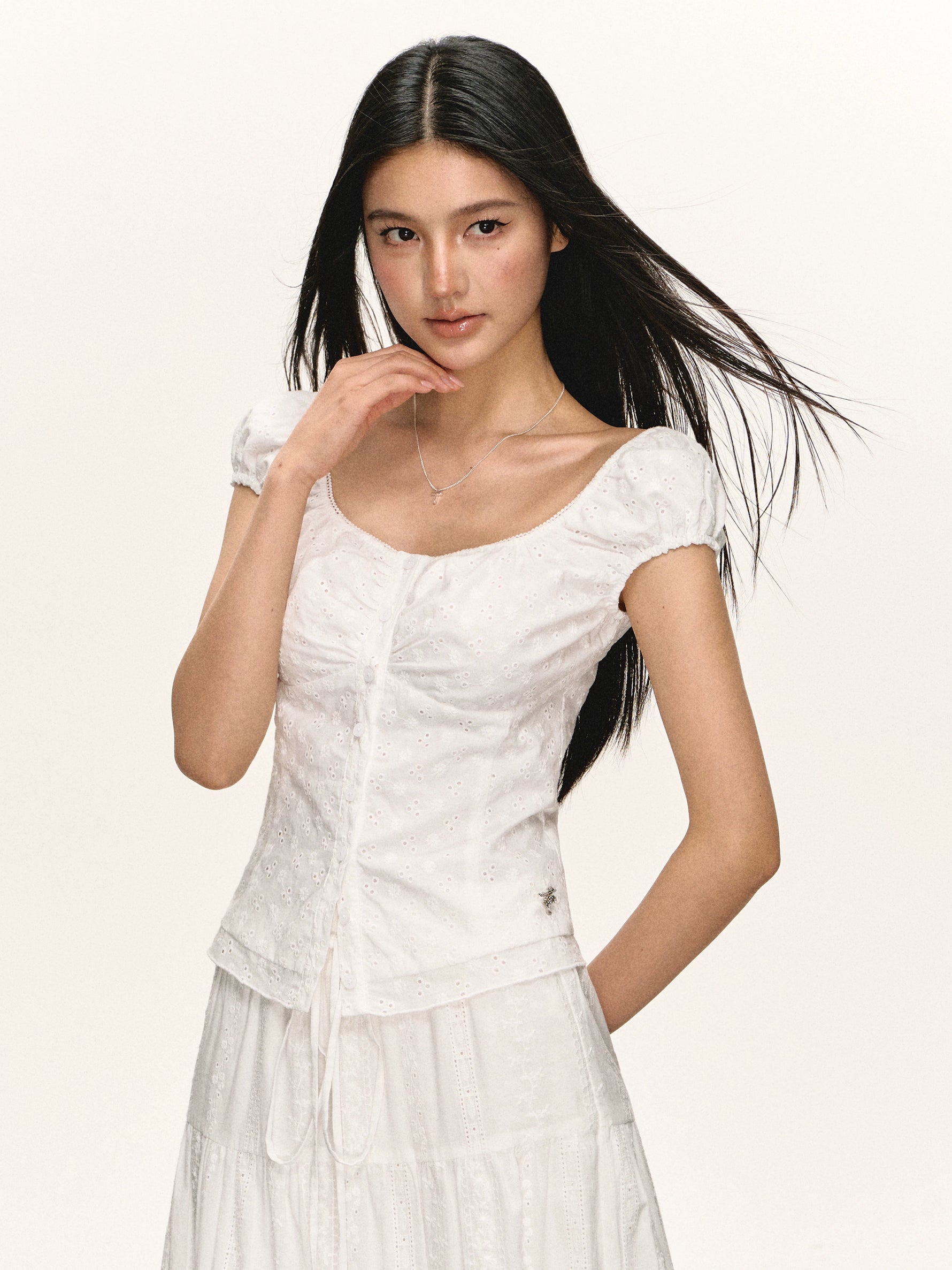Eyelet Button-Front Short Sleeve Blouse