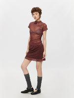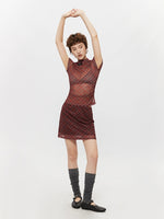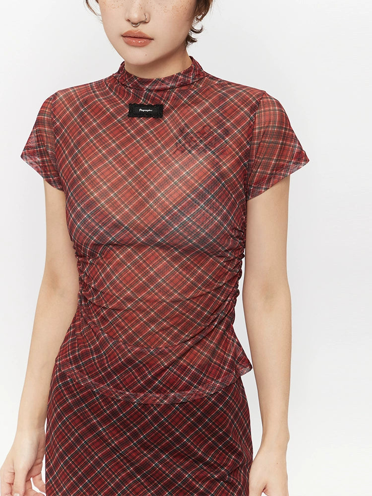 Plaid Mesh Half Turtleneck Short Sleeve Top