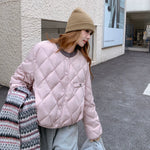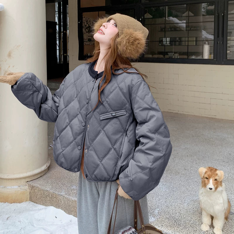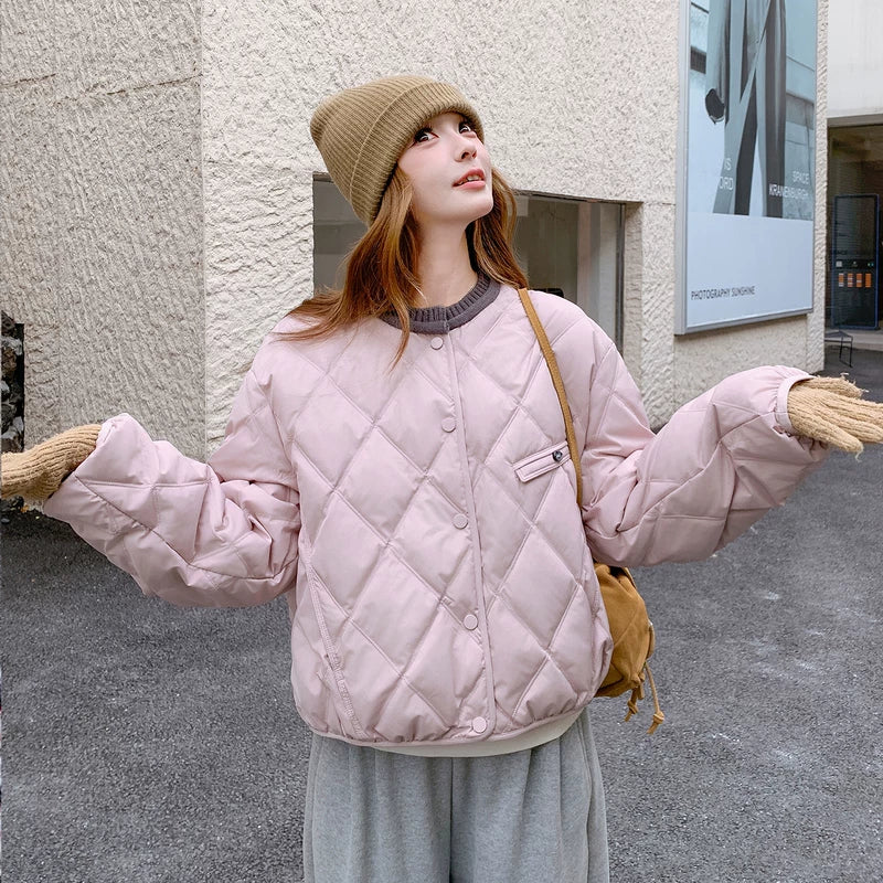 - Contrasting spliced collar enriches the look of the down jacket while remaining simple.
