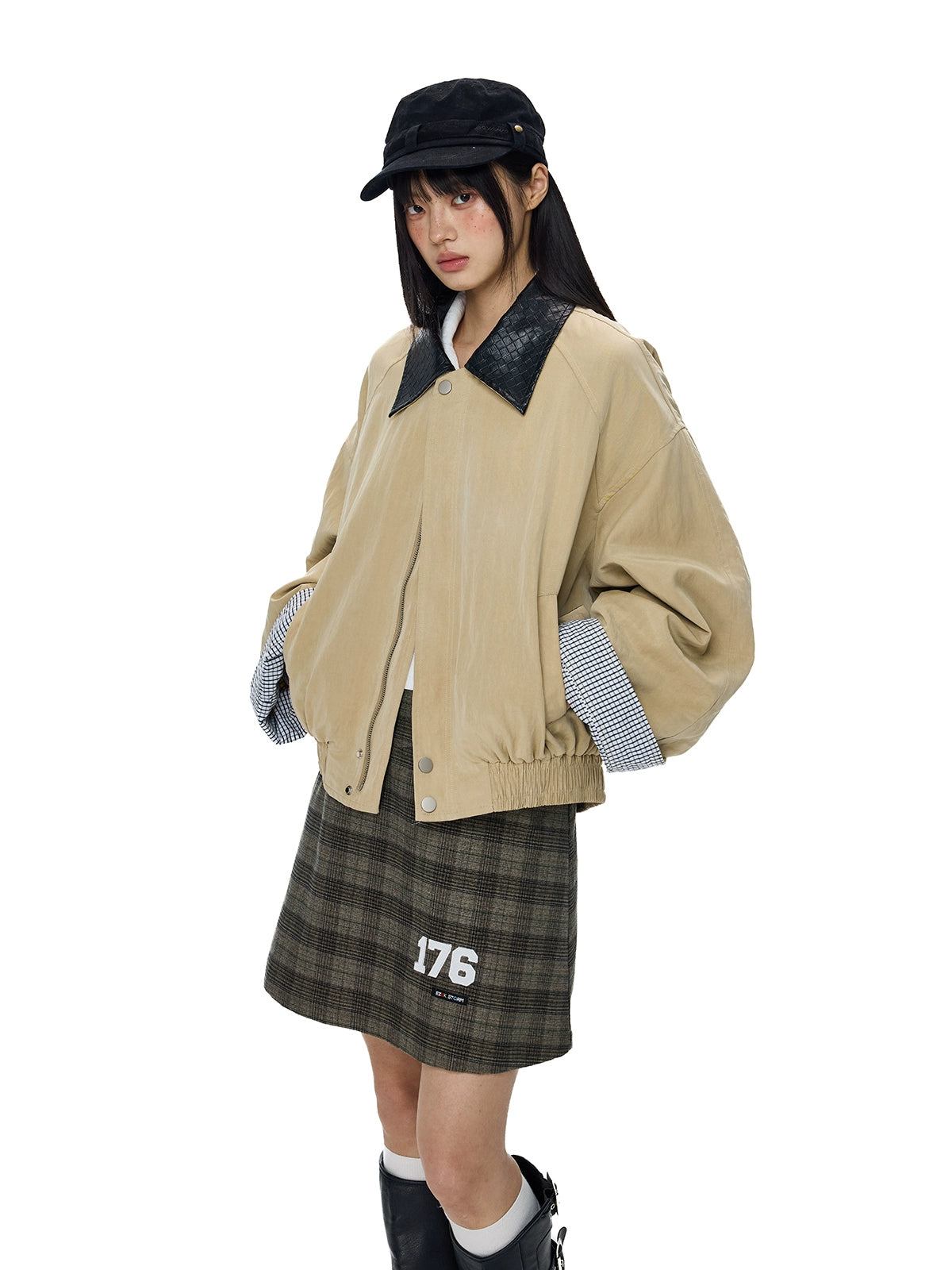 Leather Lapel Plaid Stitching Jacket