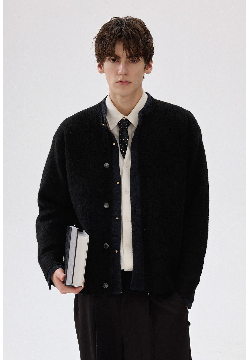 - Látka vytváří vrstvený vzhled s dvojí texturou, a límec se těsně přizpůsobuje krku.