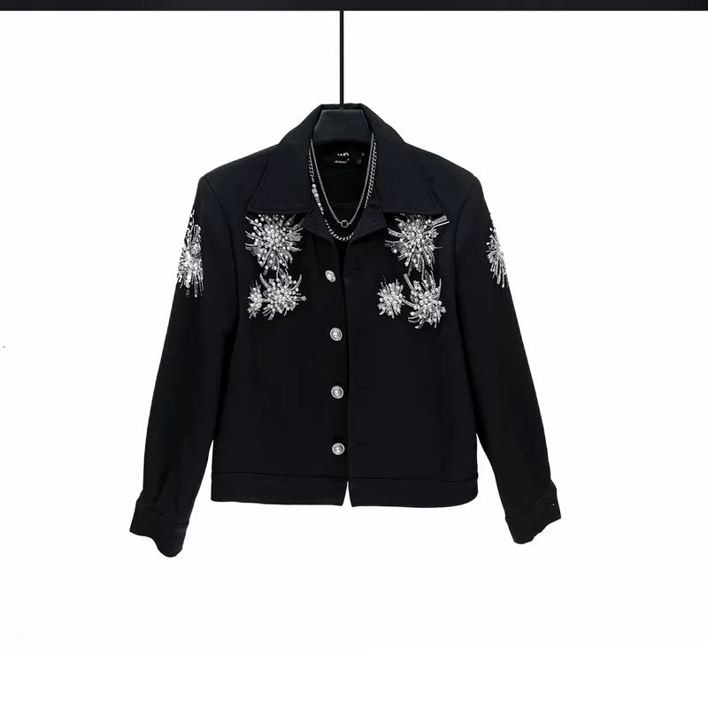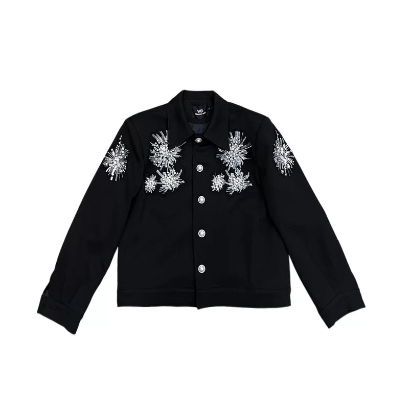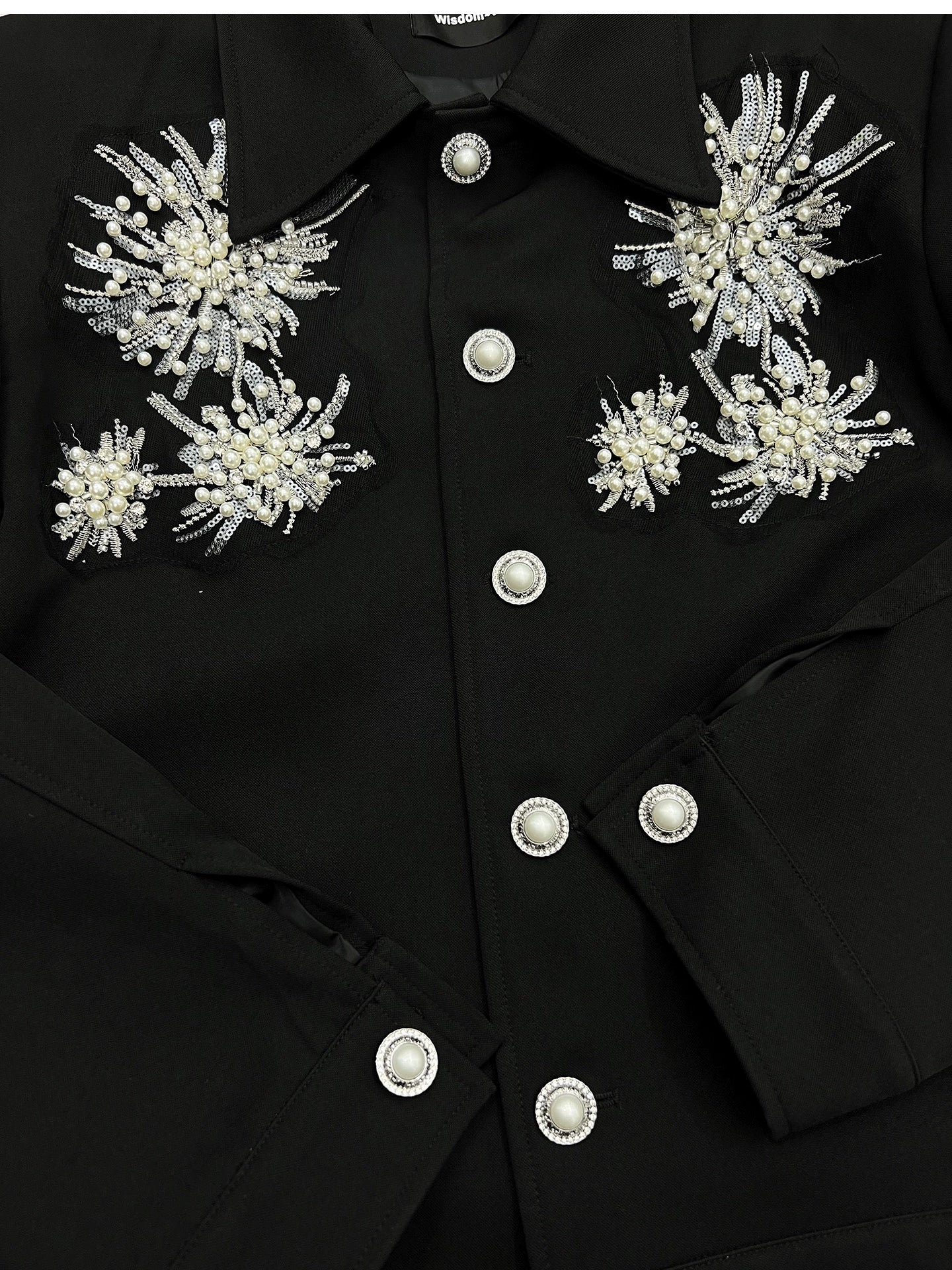 - Perlové a flitrové květinové ozdoby na přední části a rukávech