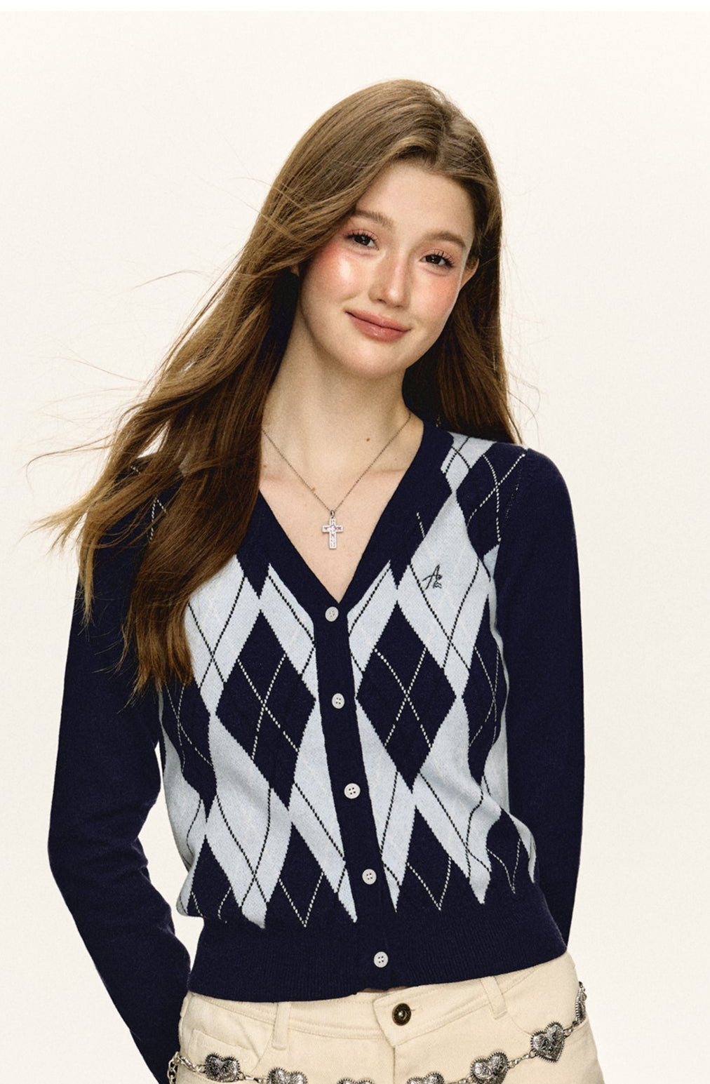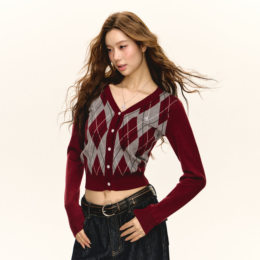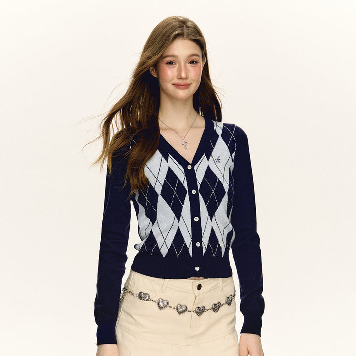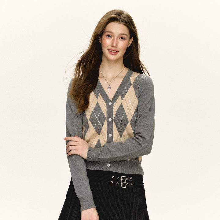 Plaid Argyle V-Neck Knit Cardigan