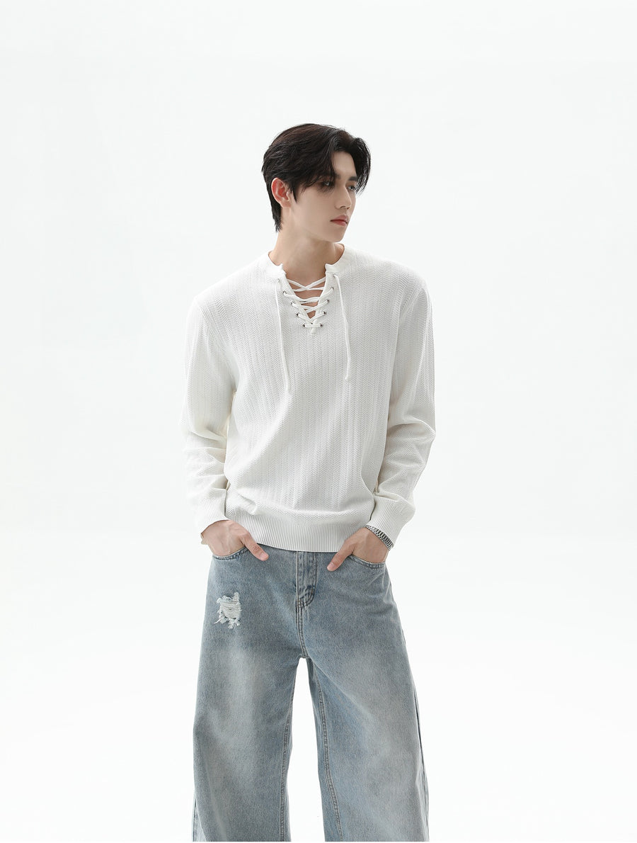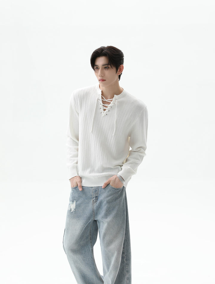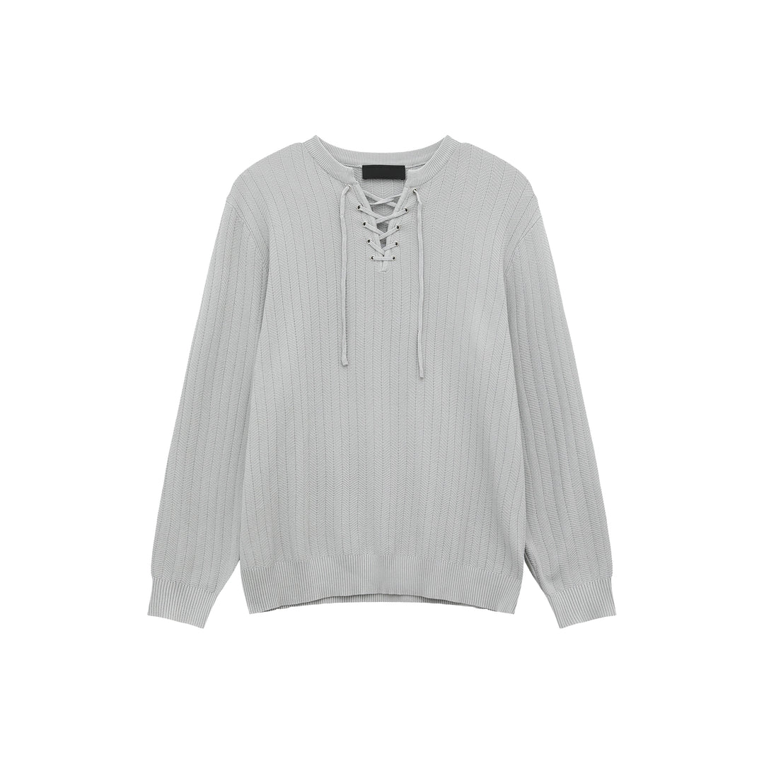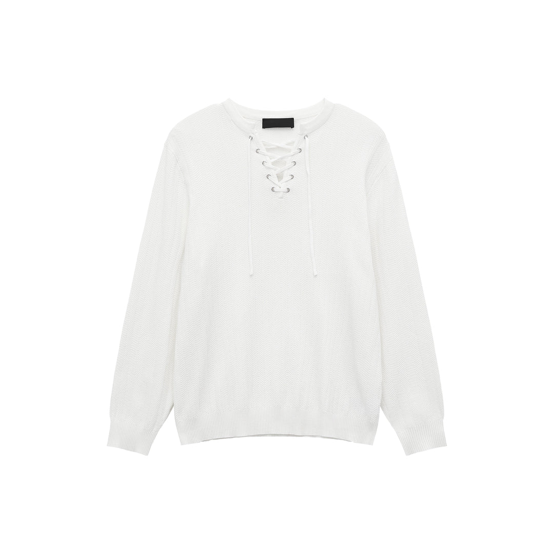 Pulovr s dlouhým rukávem z texturovaného pleteného materiálu se stahovací šňůrkou