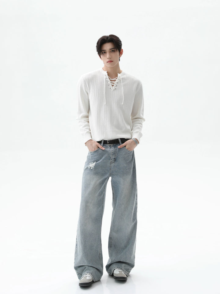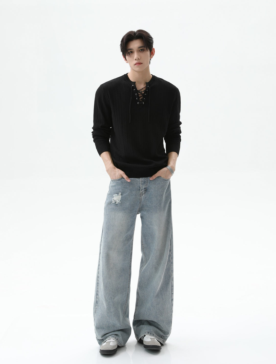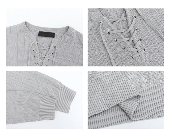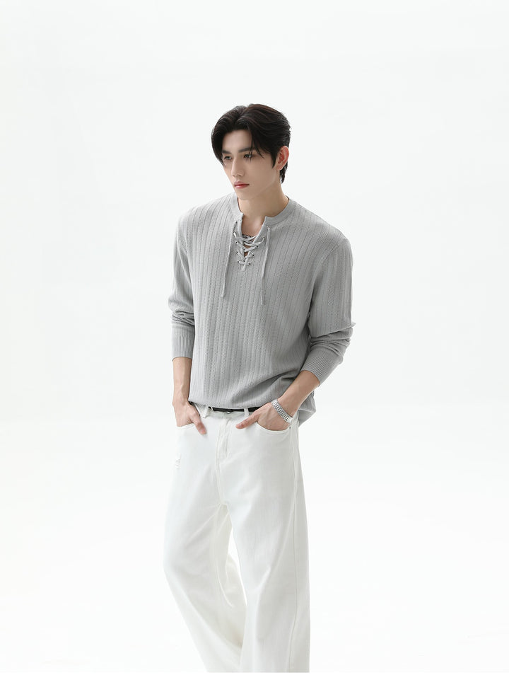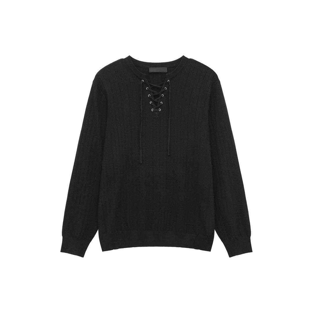 Pulovr s dlouhým rukávem z texturovaného pleteného materiálu se stahovací šňůrkou