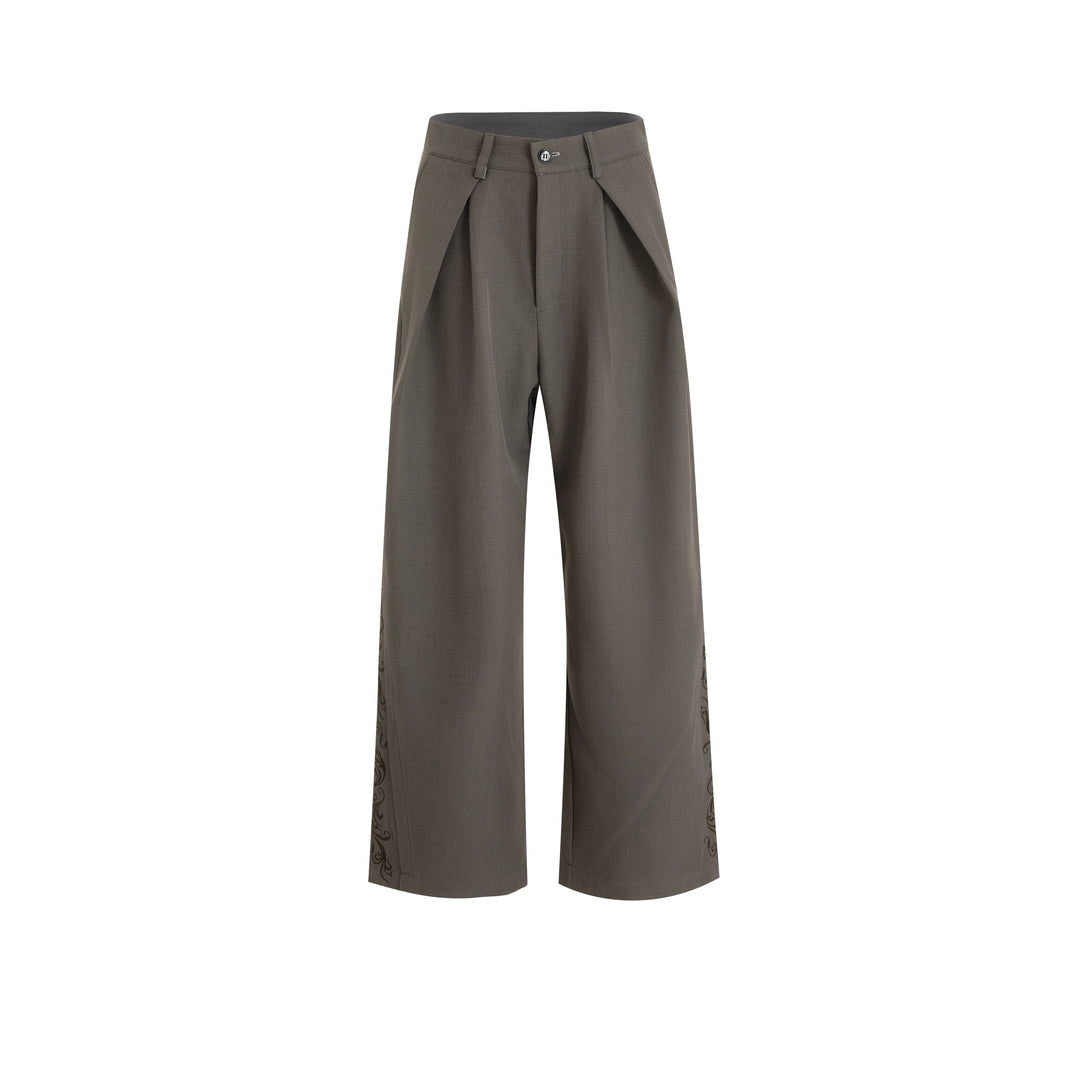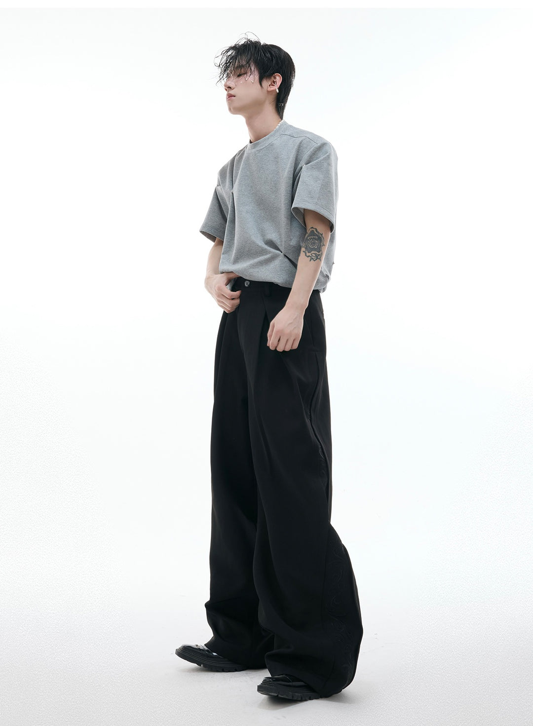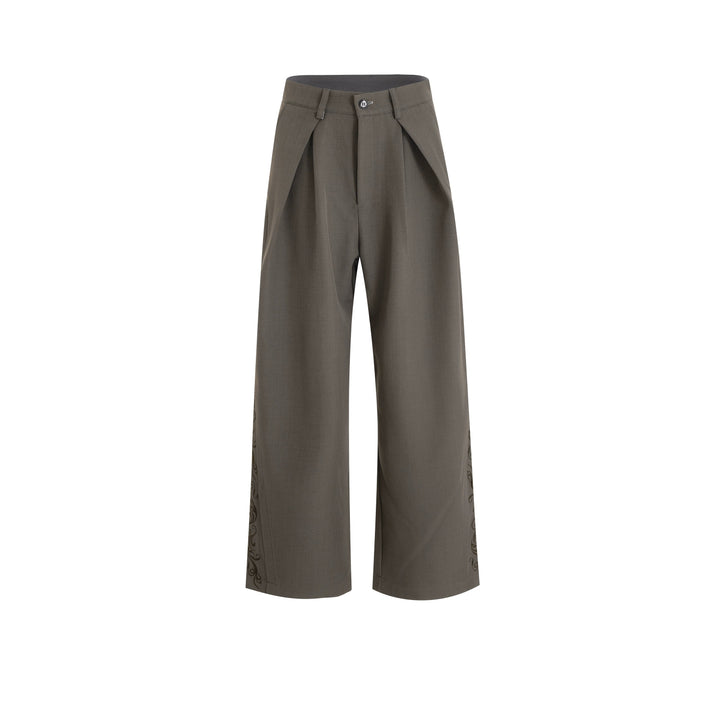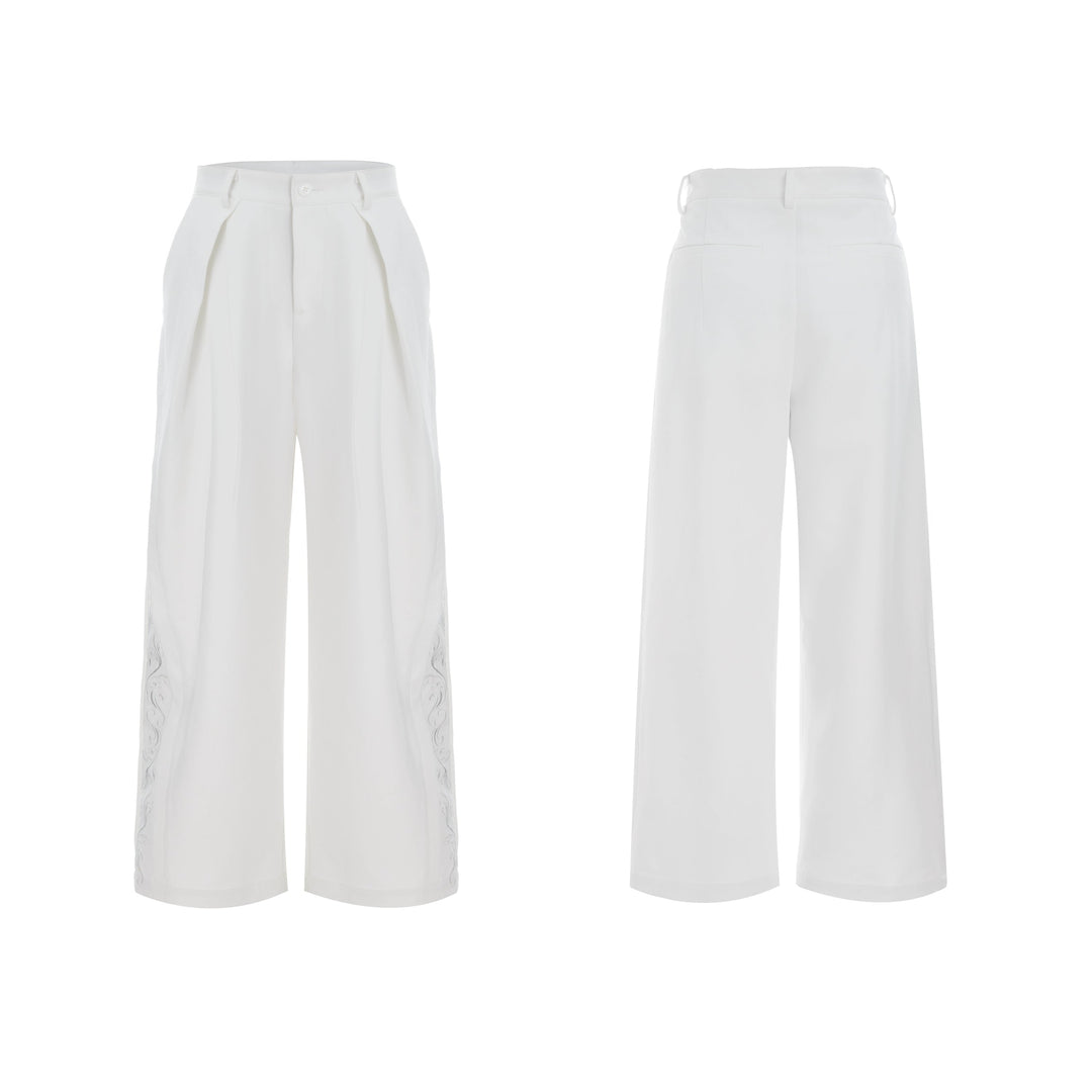 - Dekorative detaljer på siderne tilføjer moderne modeelementer og bryder monotonien af ensfarvede brede bukser.