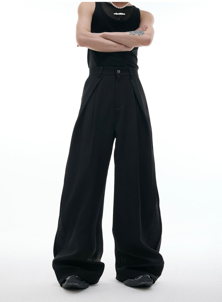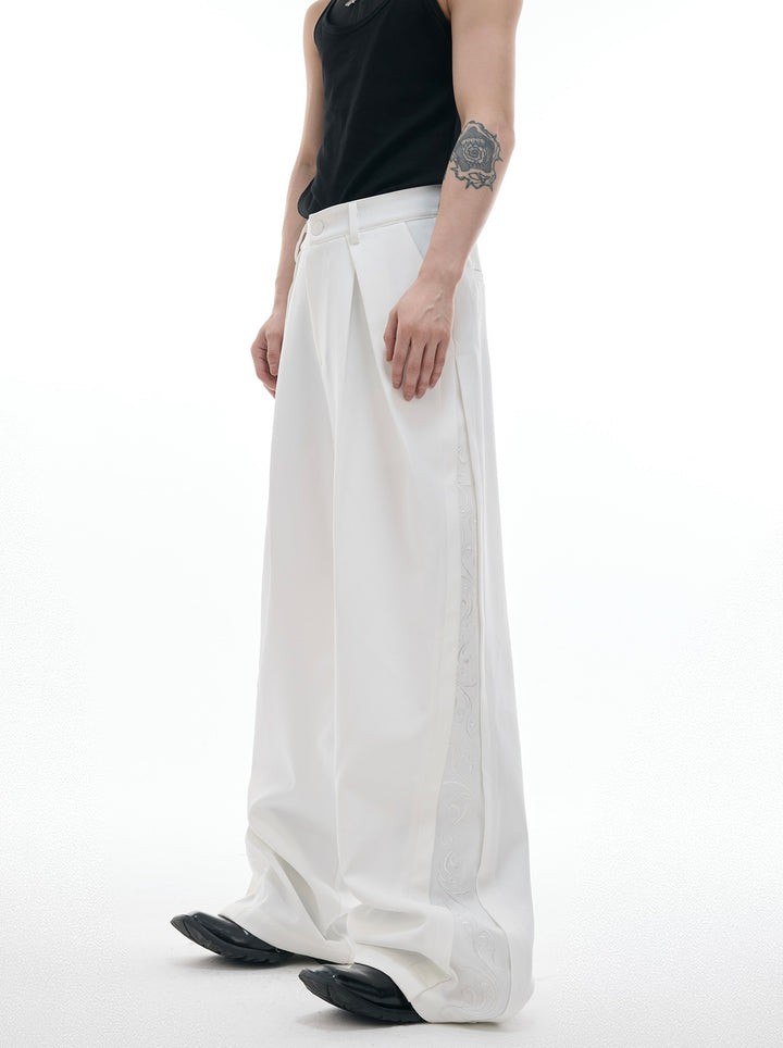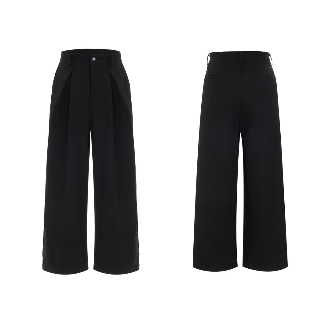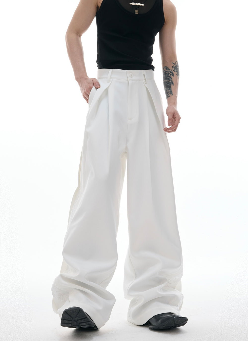 - Dekorative detaljer på siderne tilføjer moderne modeelementer og bryder monotonien af ensfarvede brede bukser.